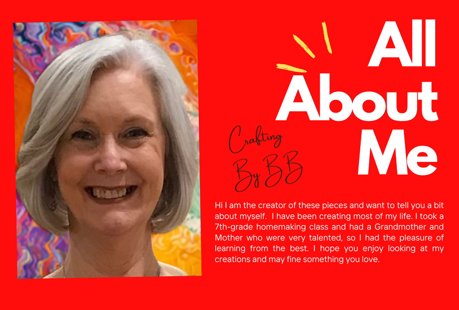 Welcome to CraftingByBB a cozy little space where handmade magic comes to life, one stitch at a time. I'm BB, the maker behind the scenes, creating with heart, purpose, and a love for all things warm and whimsical. What began as a hobby soon bloomed into a passion for crafting meaningful, feel-good pieces from a variety of sources and creations to charming decor and thoughtful gifts. Every item is made with care, creativity, and a sprinkle of joy. CraftingByBB is more than a shop