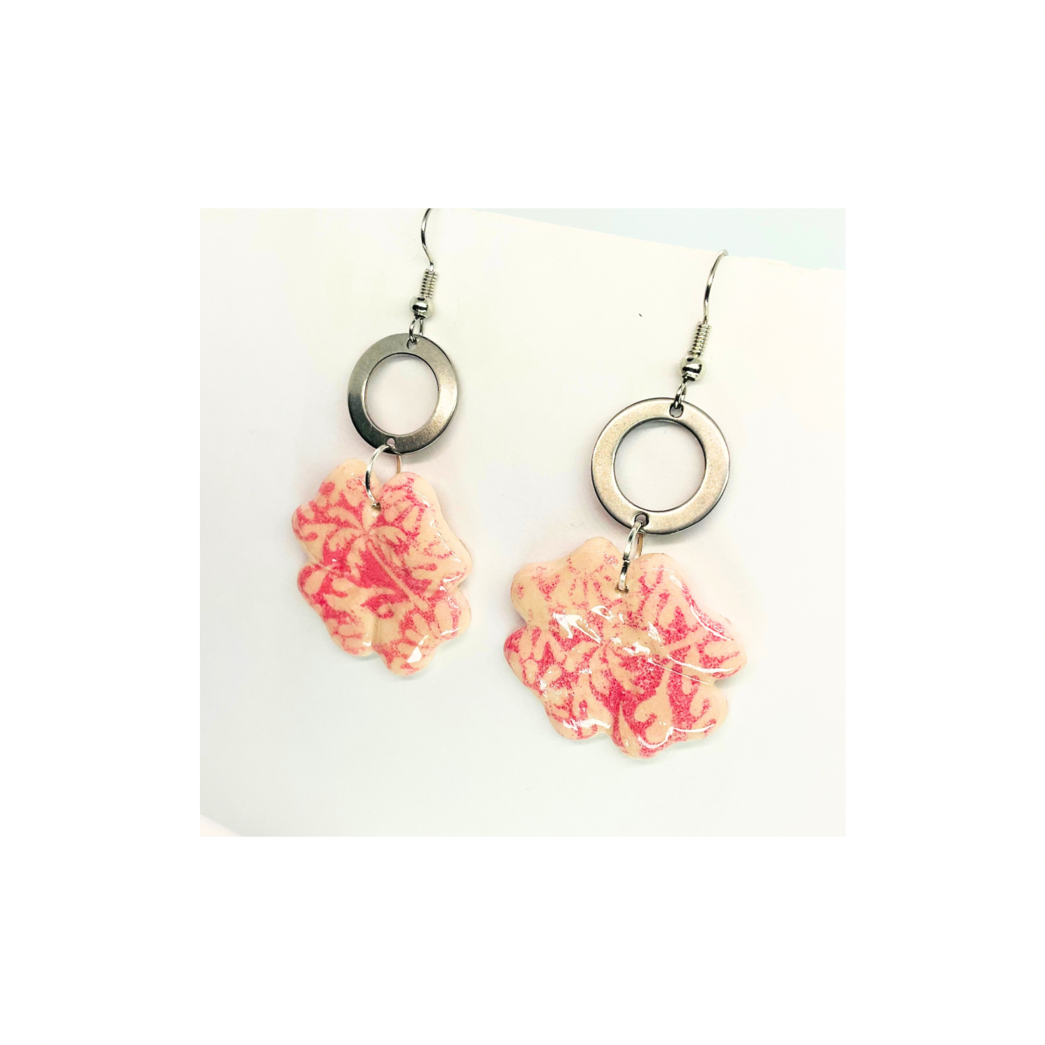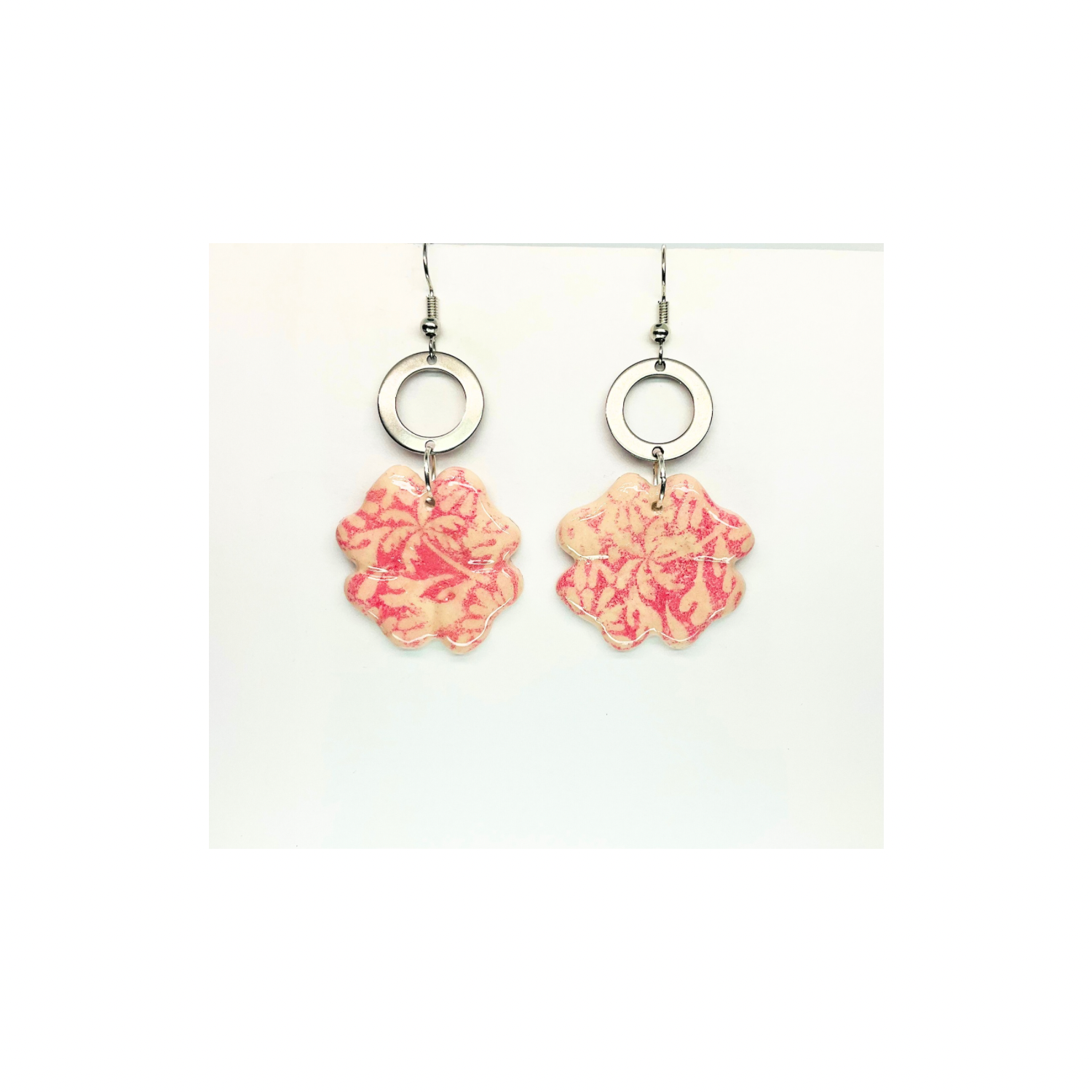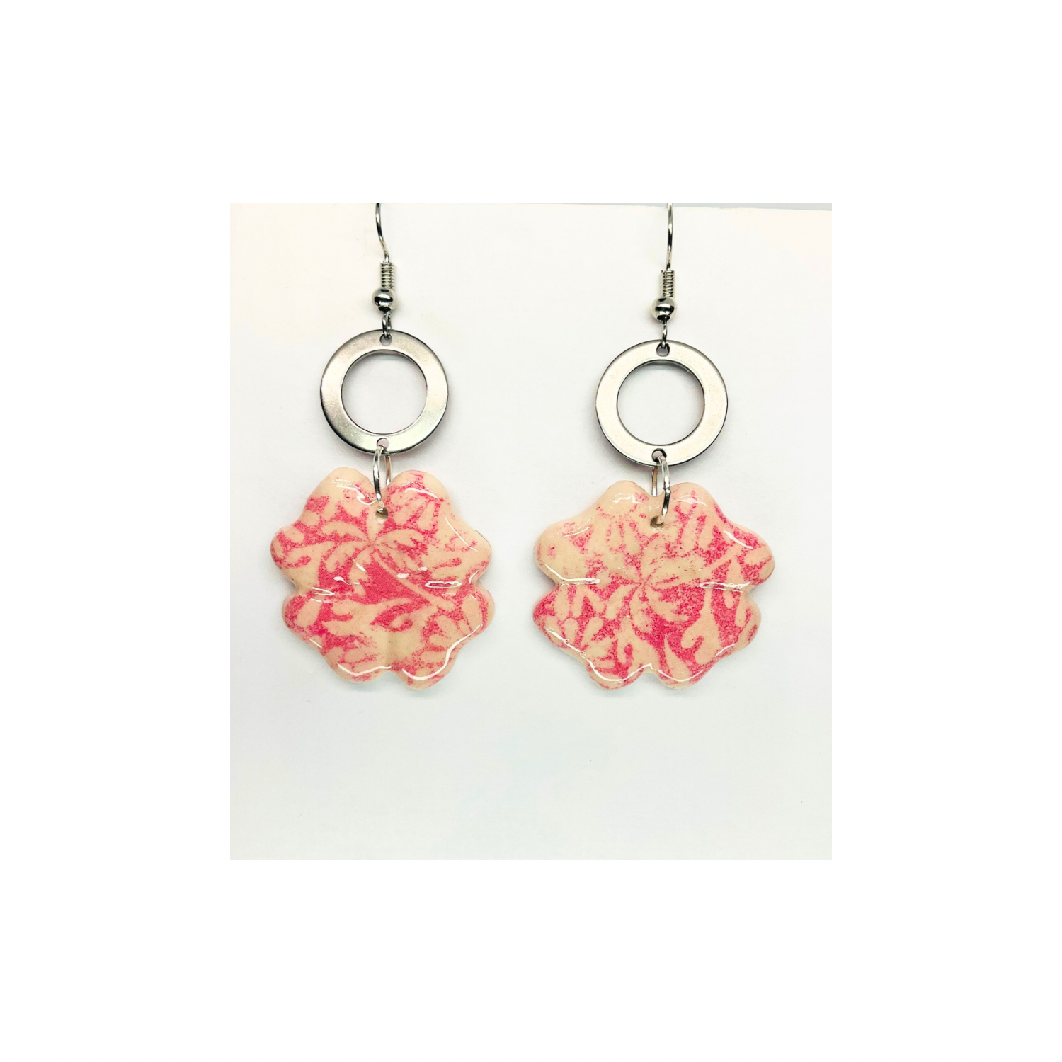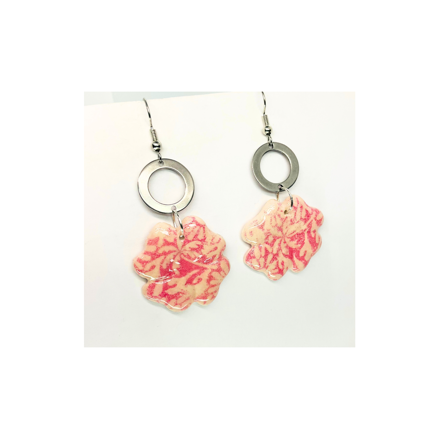 ๐ Product Details: The earrings showcase a delicate pink flower with a silver circle, creating a harmonious blend of colors. Their design ensures they are both stylish and eye-catching. Enjoy the beauty of nature with this collection.