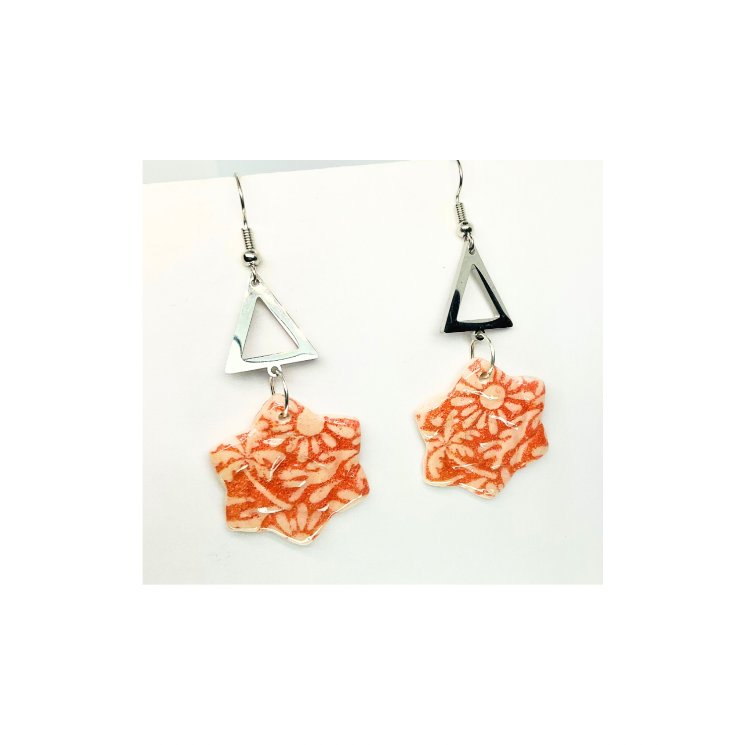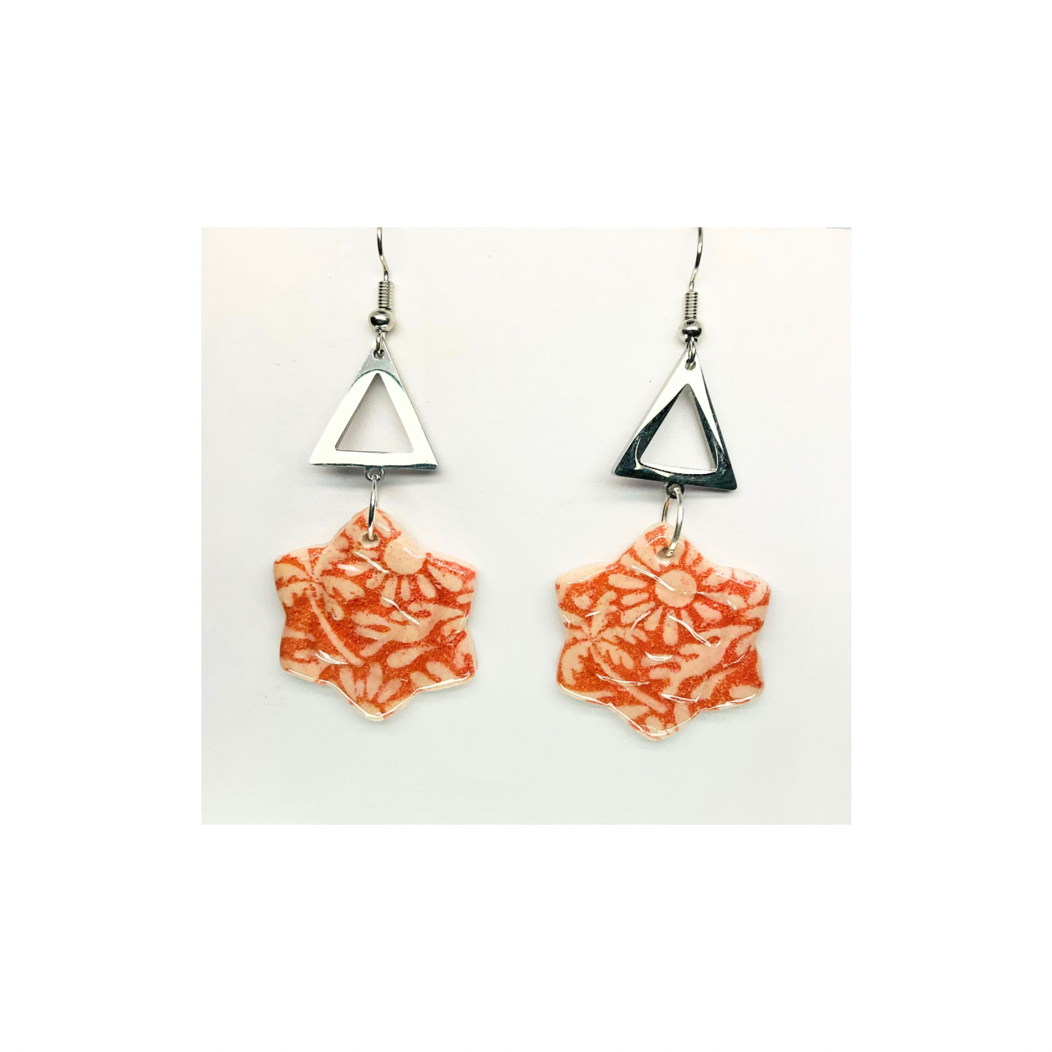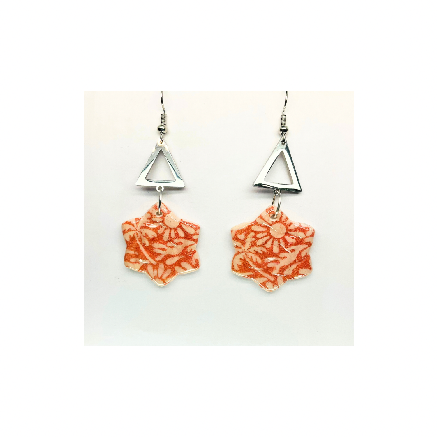Beach Bloom Collection Salmon Star Shape Dangle Earrings with Orange Floral Design and Silver Triangle Top