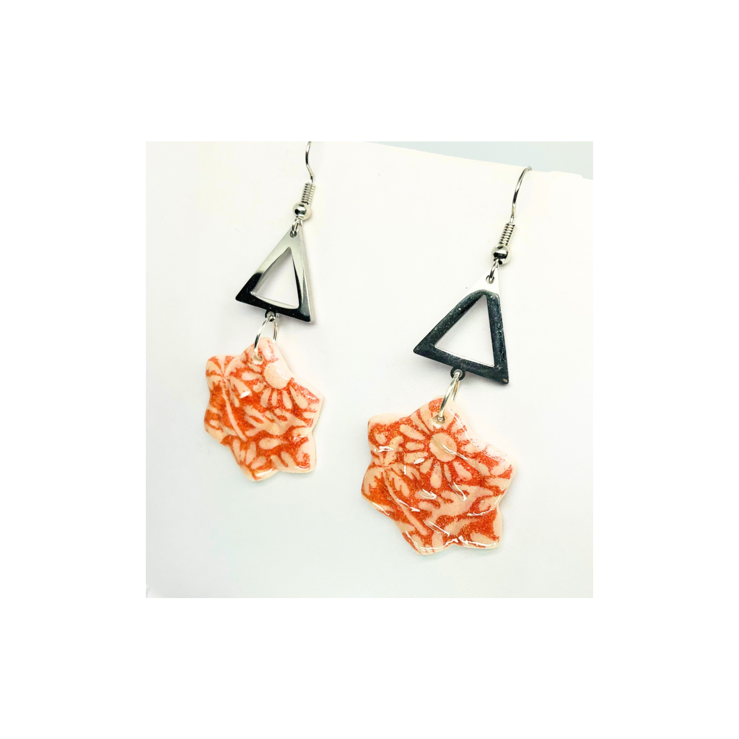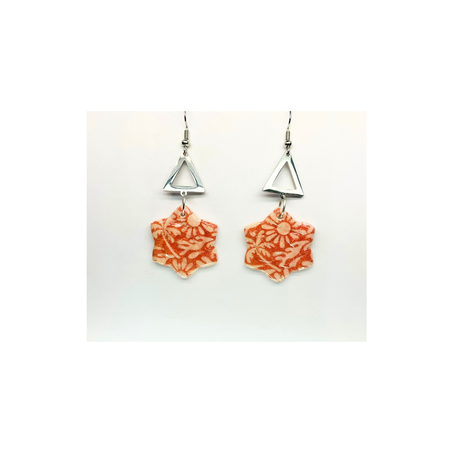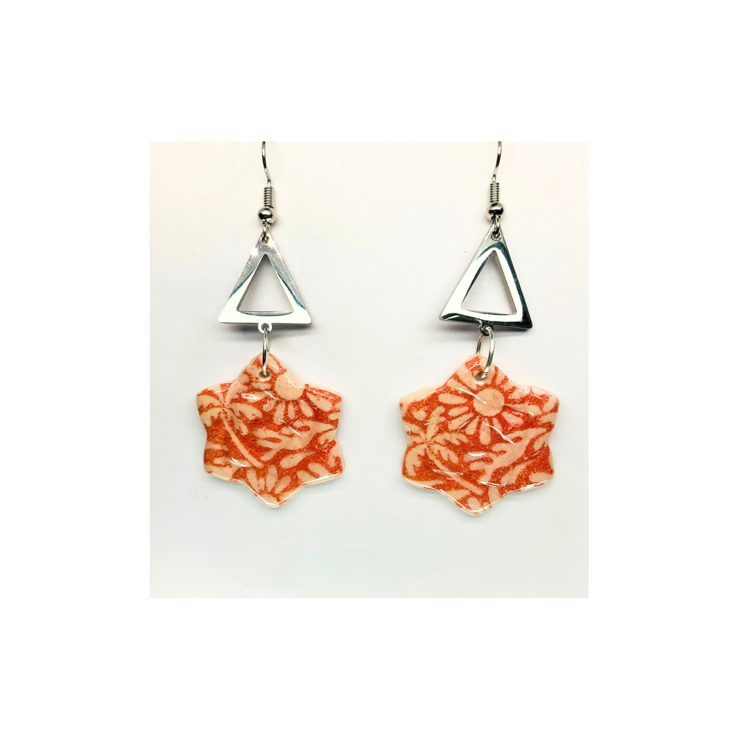 Beach Bloom Collection Salmon Star Shape Dangle Earrings with Orange Floral Design and Silver Triangle Top