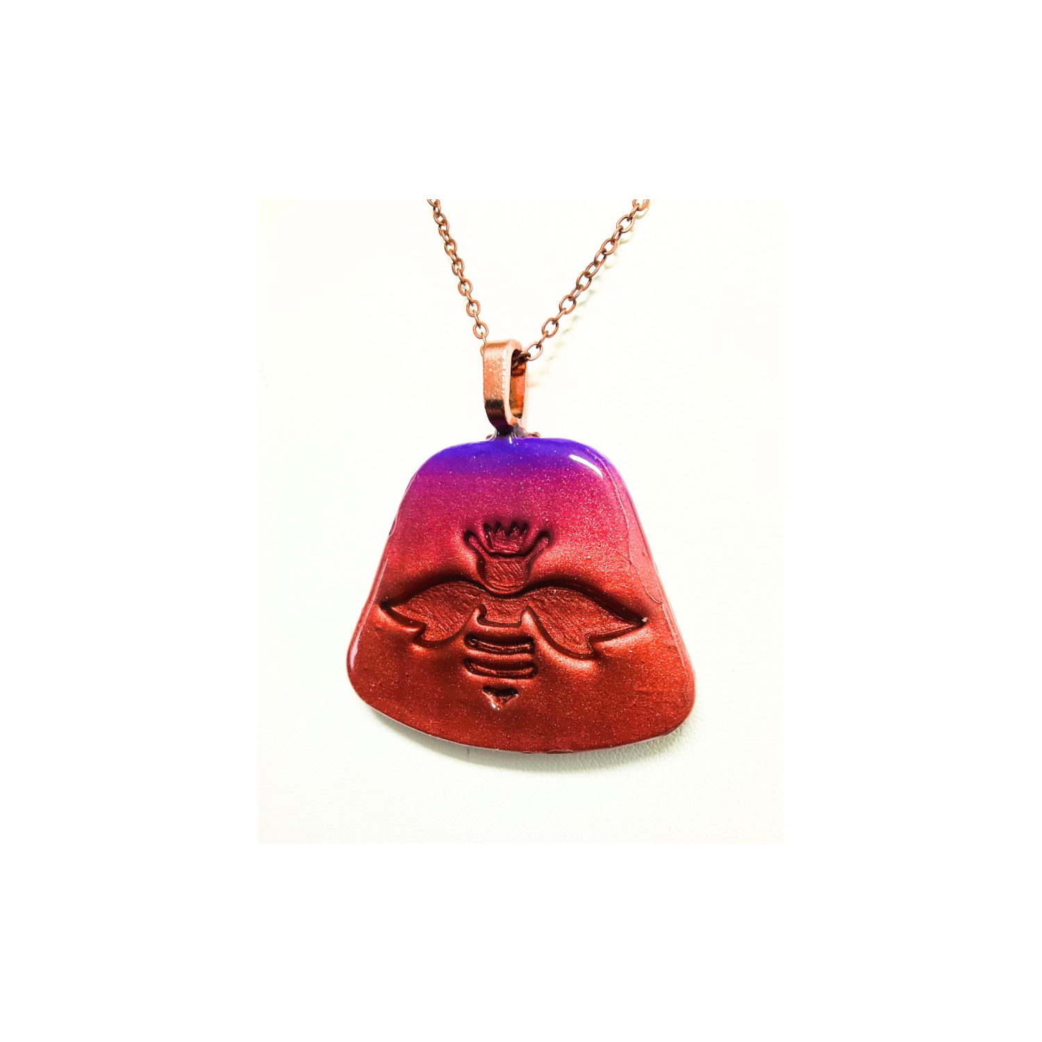This unique necklace features a bee pendant crafted from polymer clay with graduated bronze ombre hues. The bee stamp adds a distinctive touch, while UV resin ensures durability. The pendant is mounted on a copper carrier, paired with an 18-inch copper chain. Each piece is handmade, making no two identical.