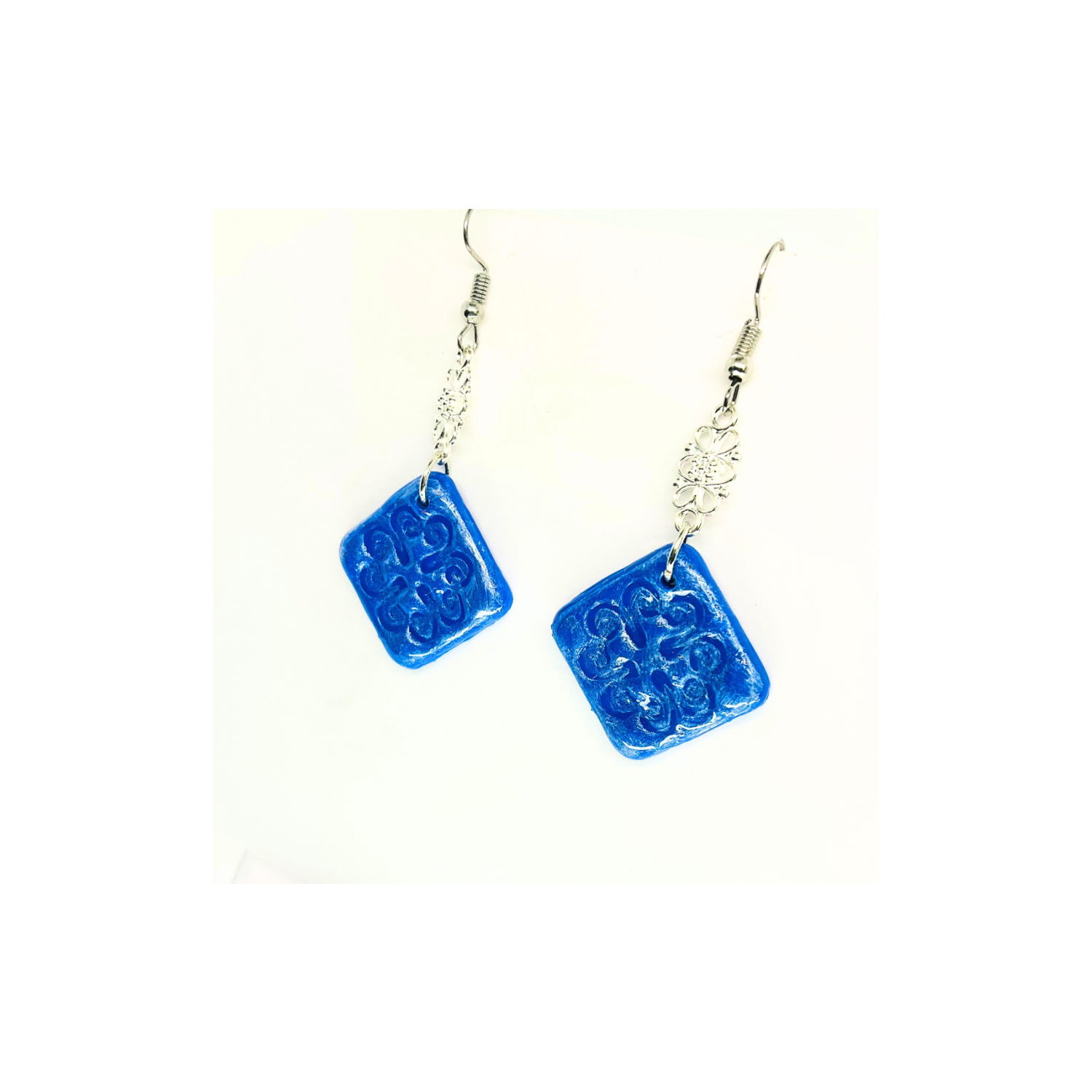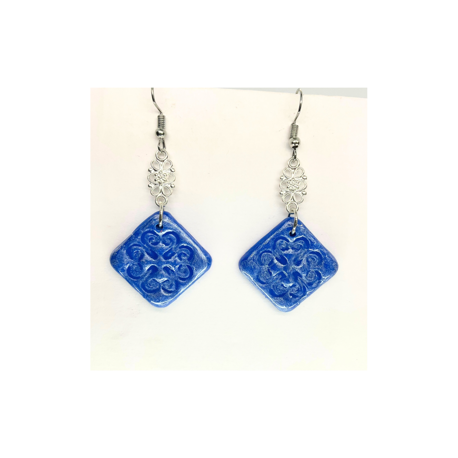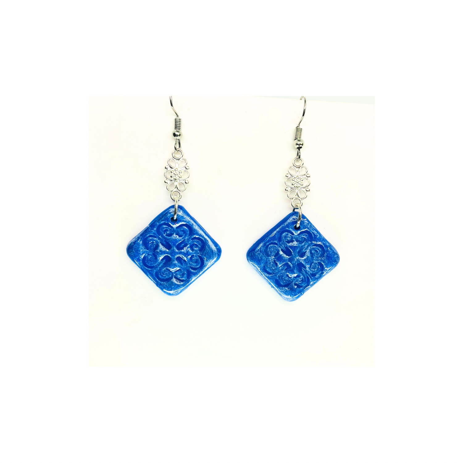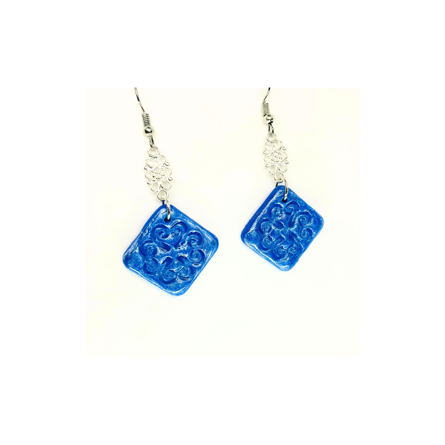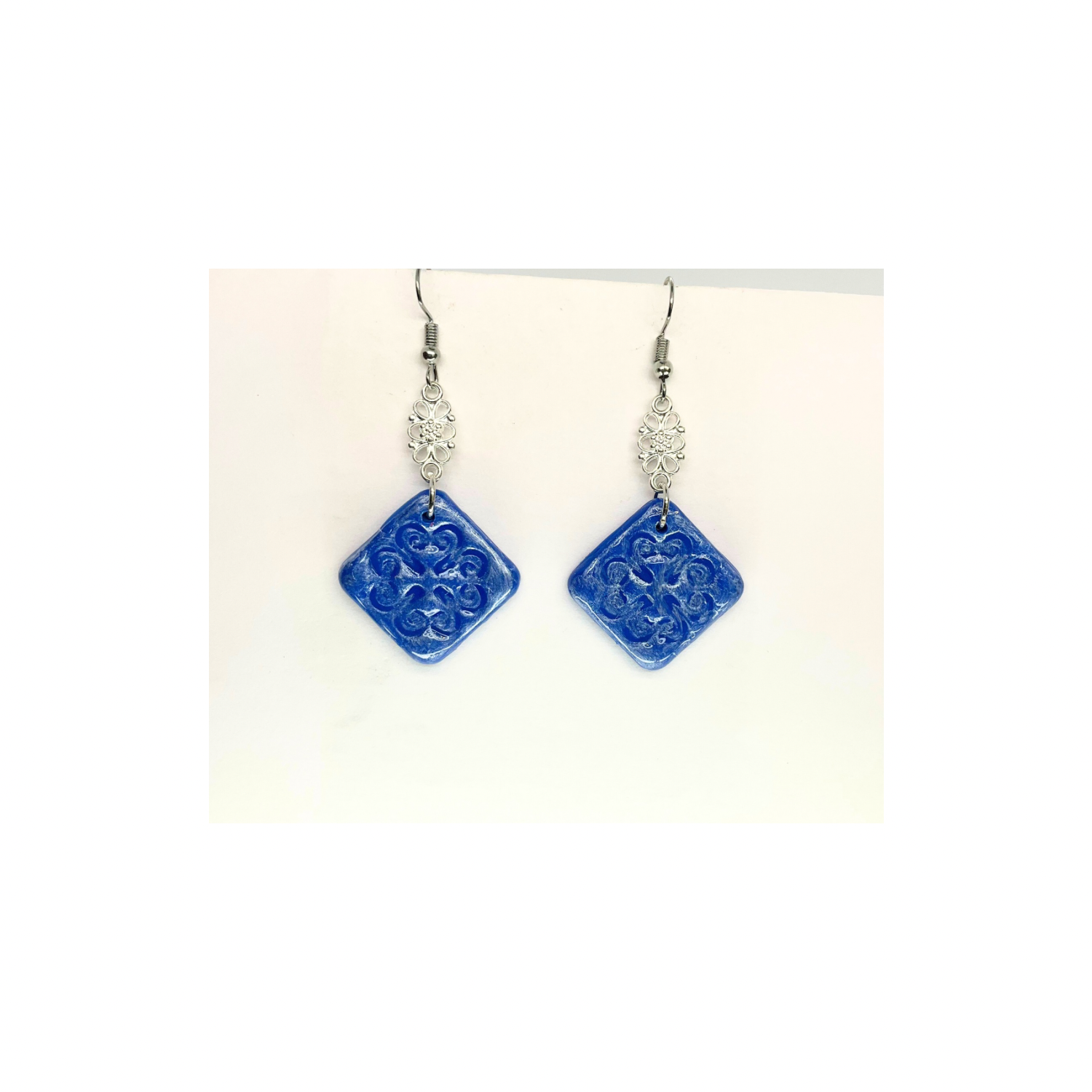 Blue Tile 131 with Silver Charm Dangle Earrings - Unique Design Jewelry Piece