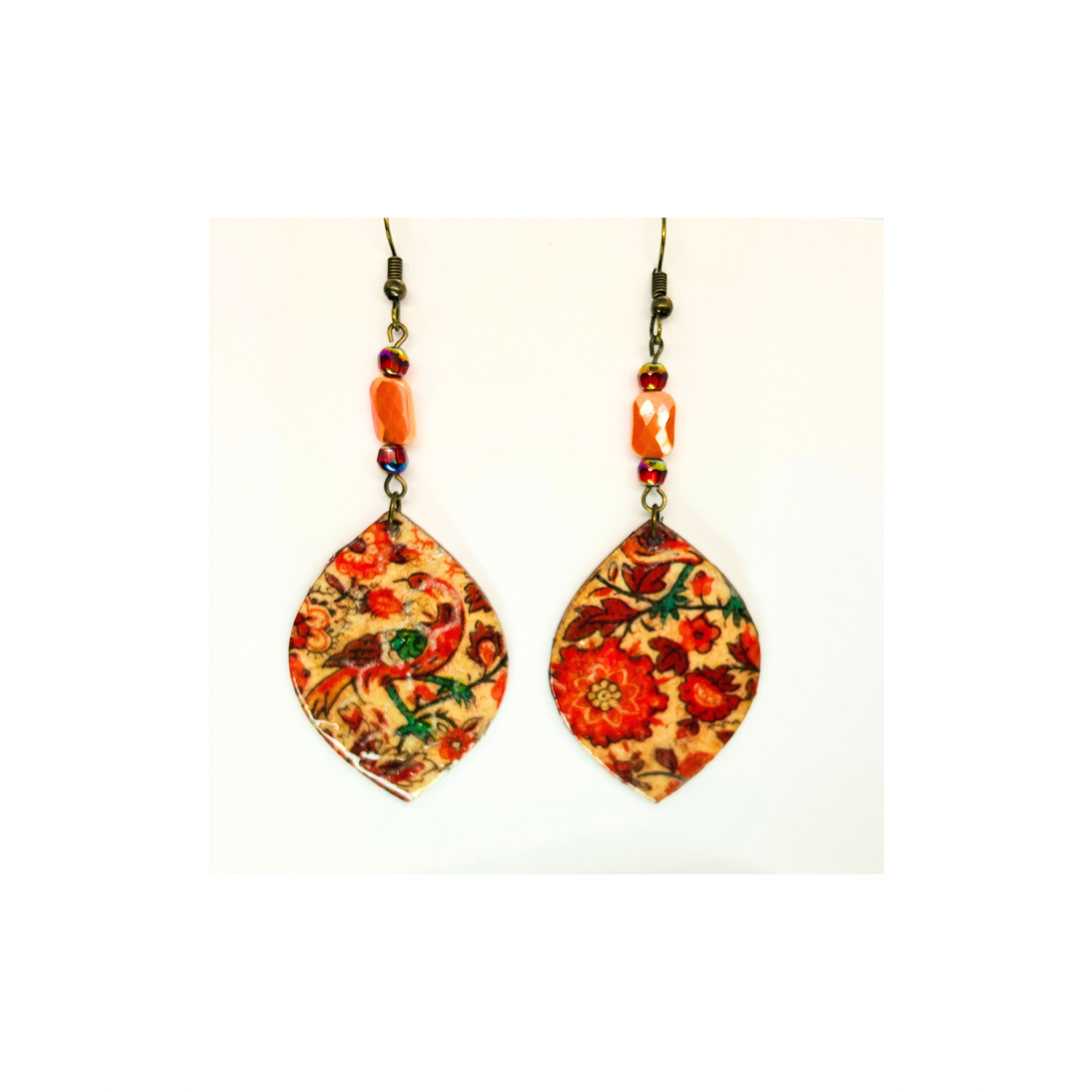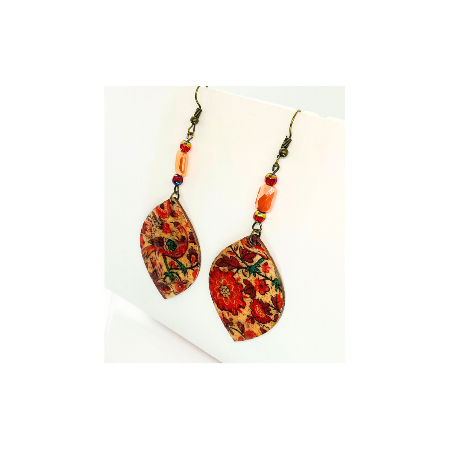 • Boho Elegance: These dangle earrings feature a floral style design, adorned with Czech beads. The napkin transfer adds a unique touch. Each set includes a bronze ear wire for secure wear.