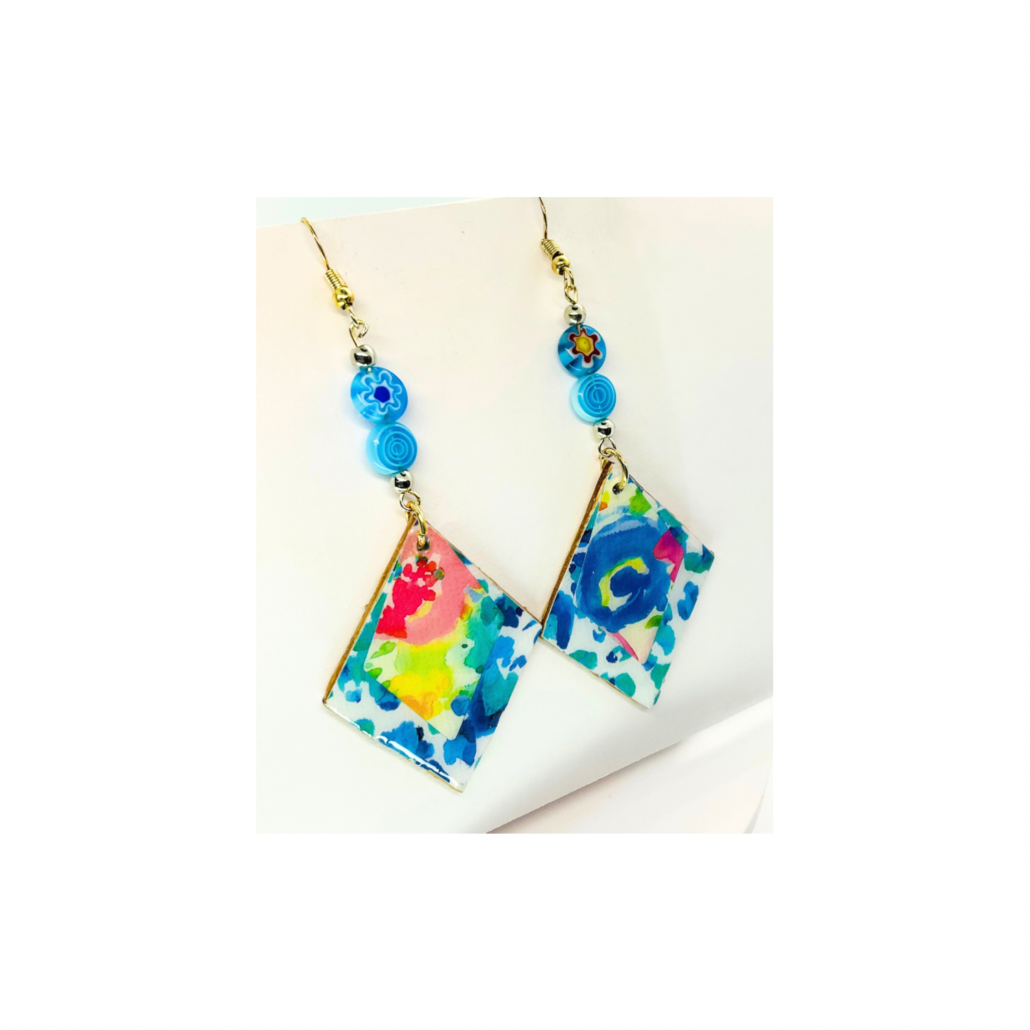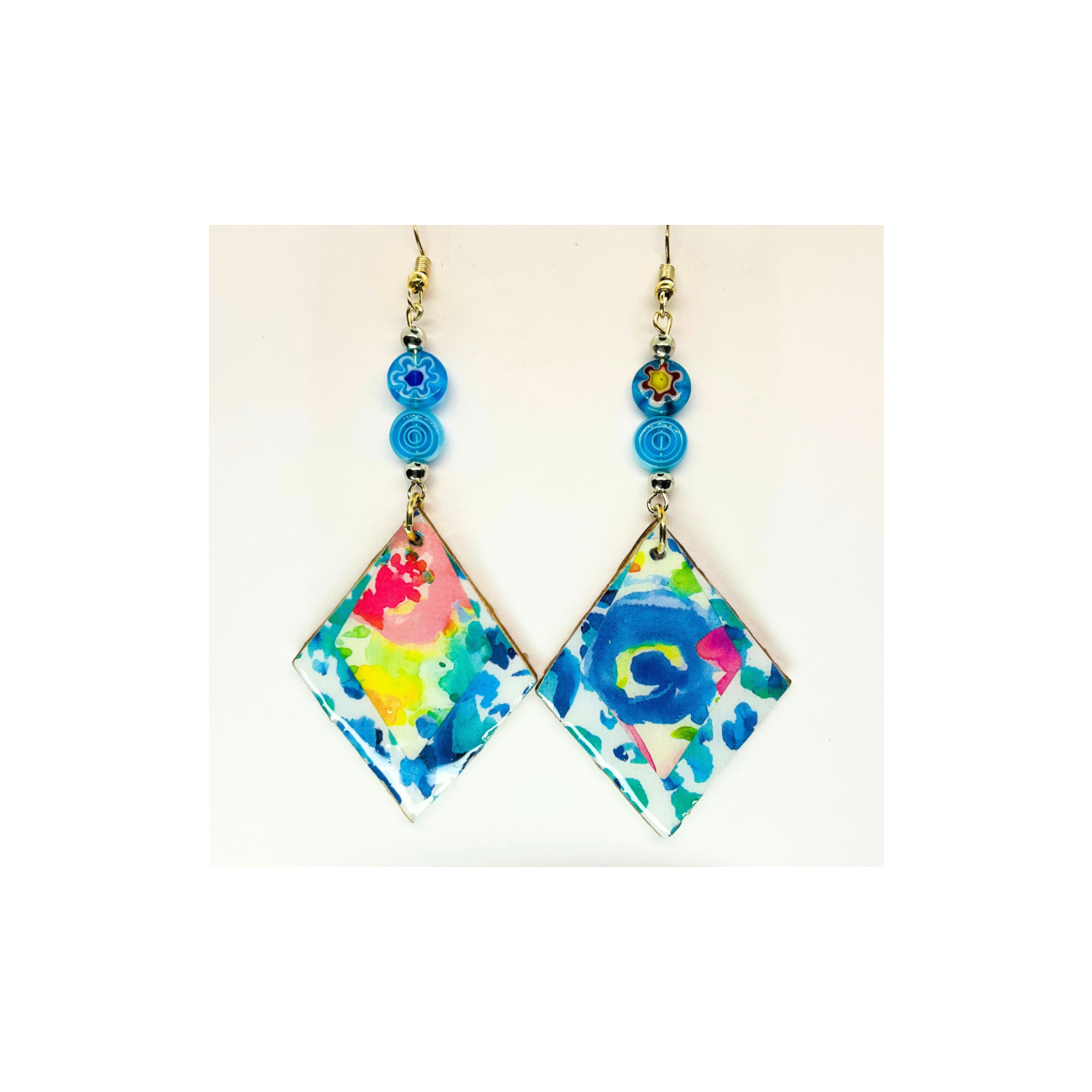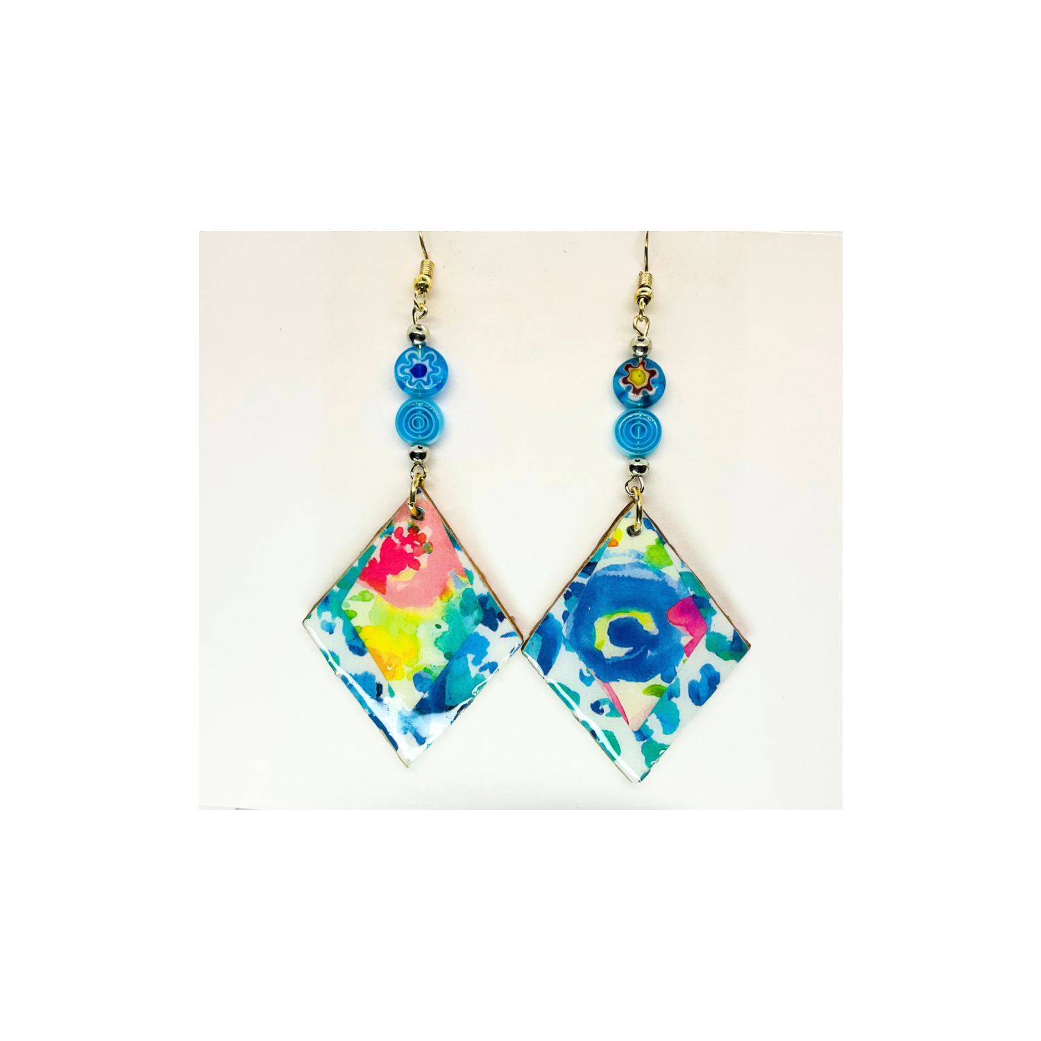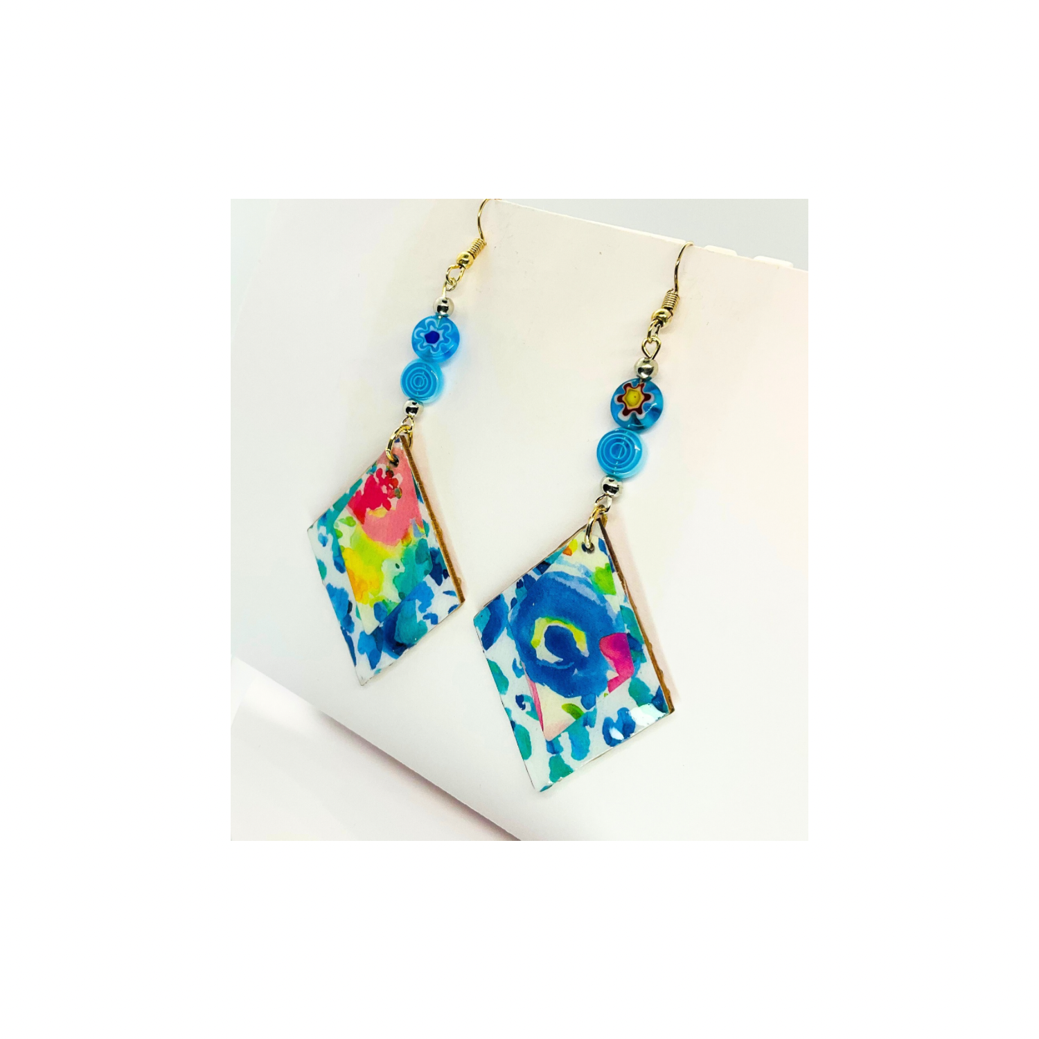 BOHO Dangle Wood Decoupage Earrings - Handmade Diamond-Shaped Floral Design with Tiny Beads & Resin Finish