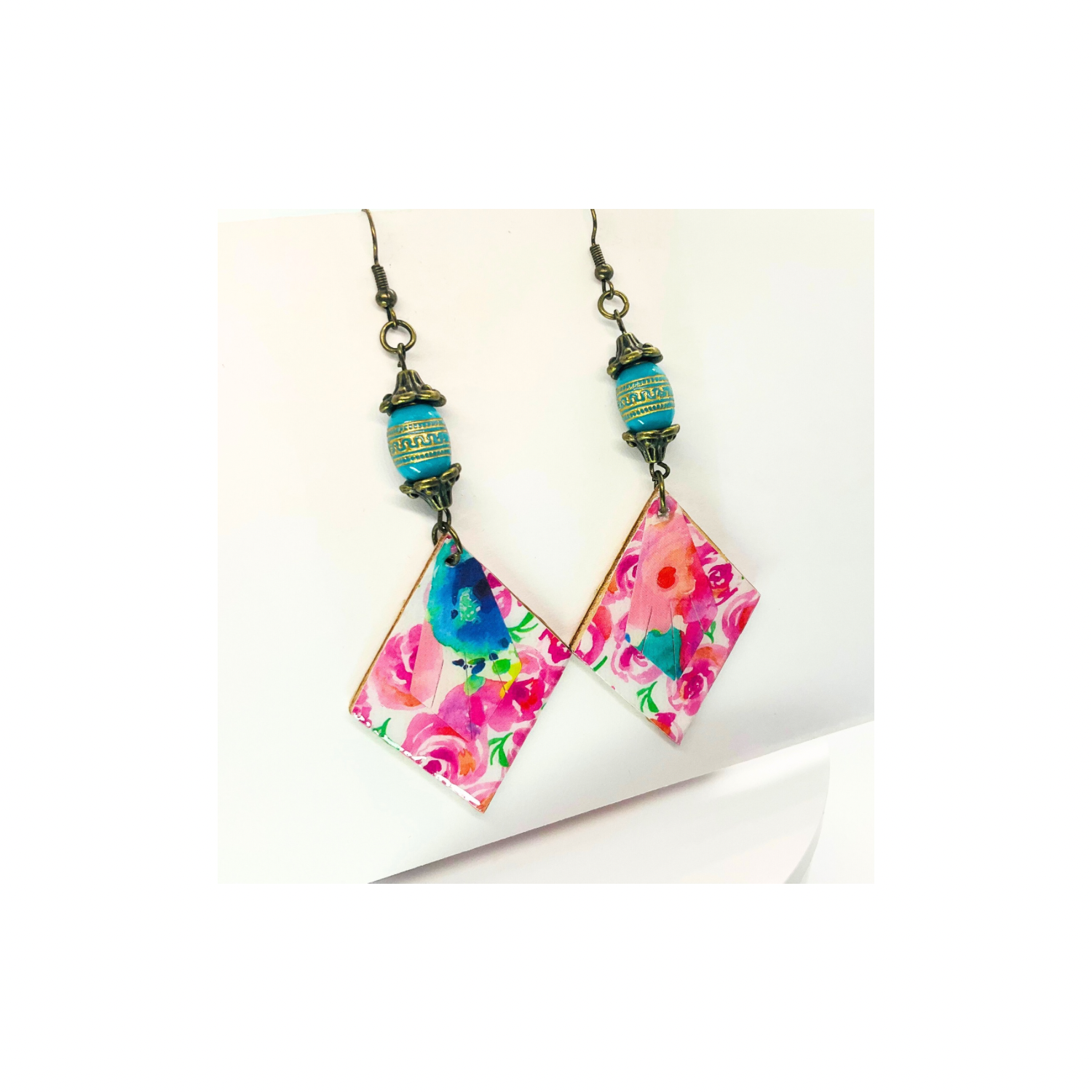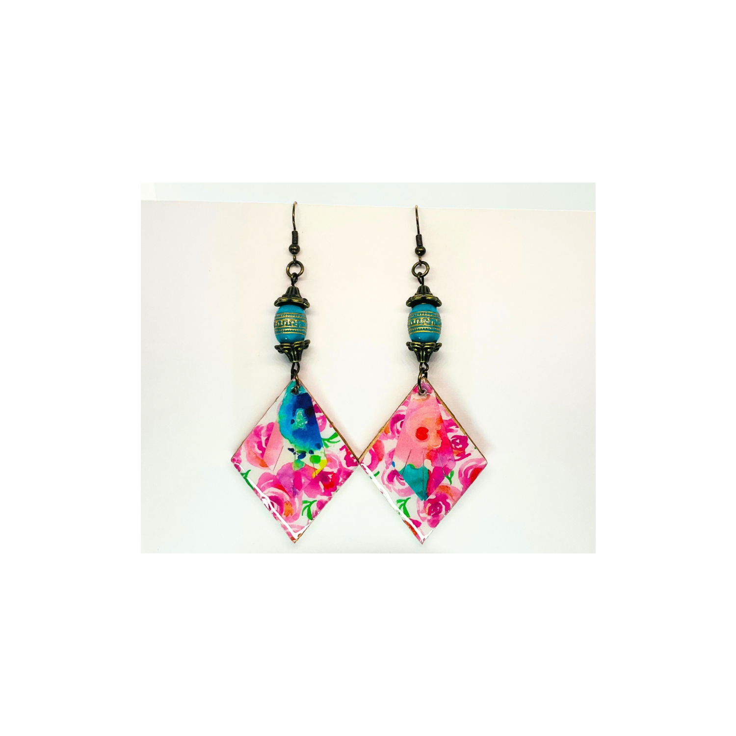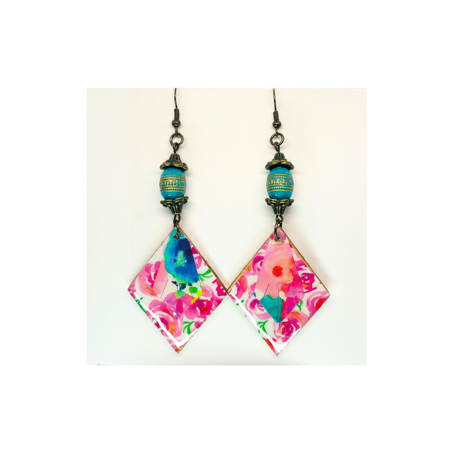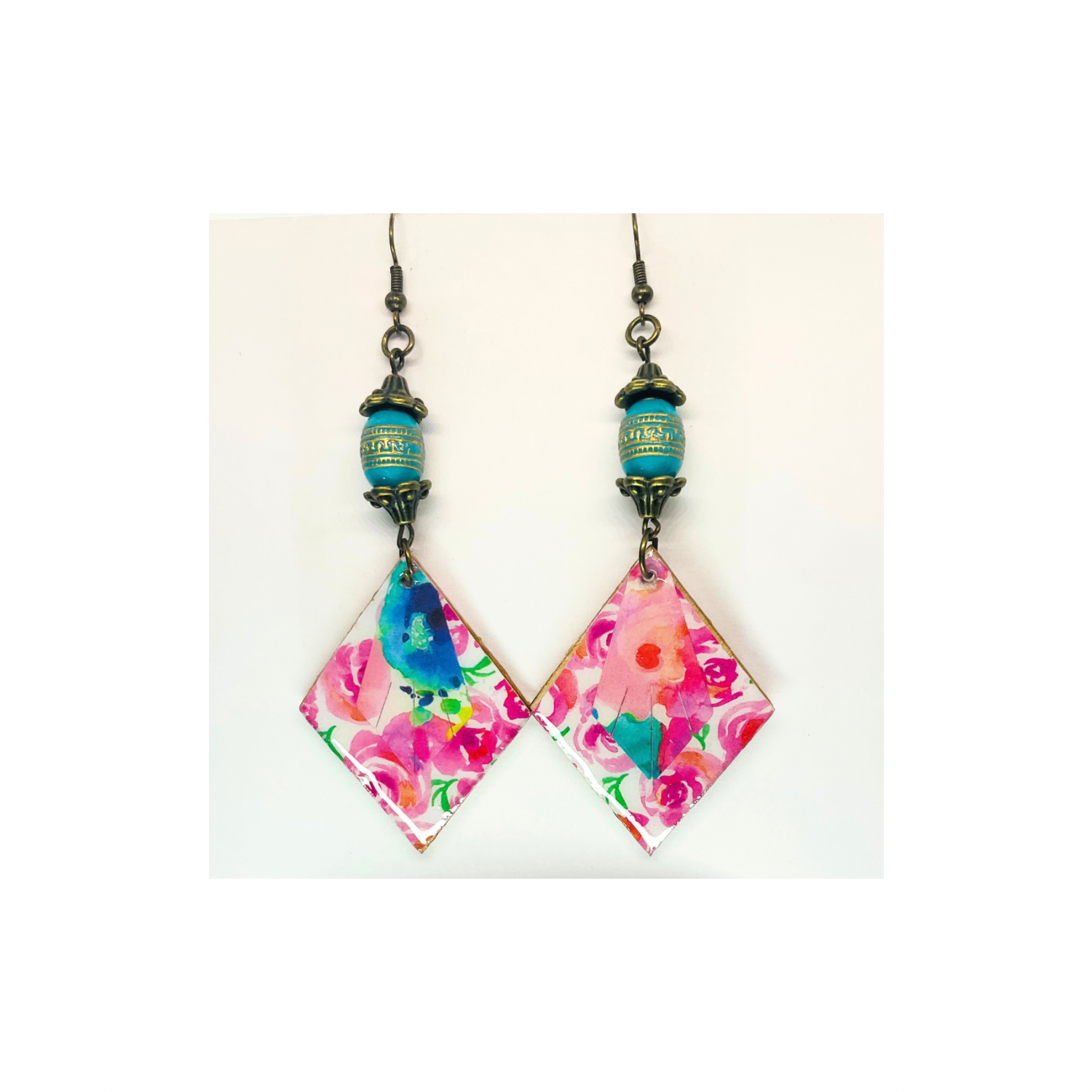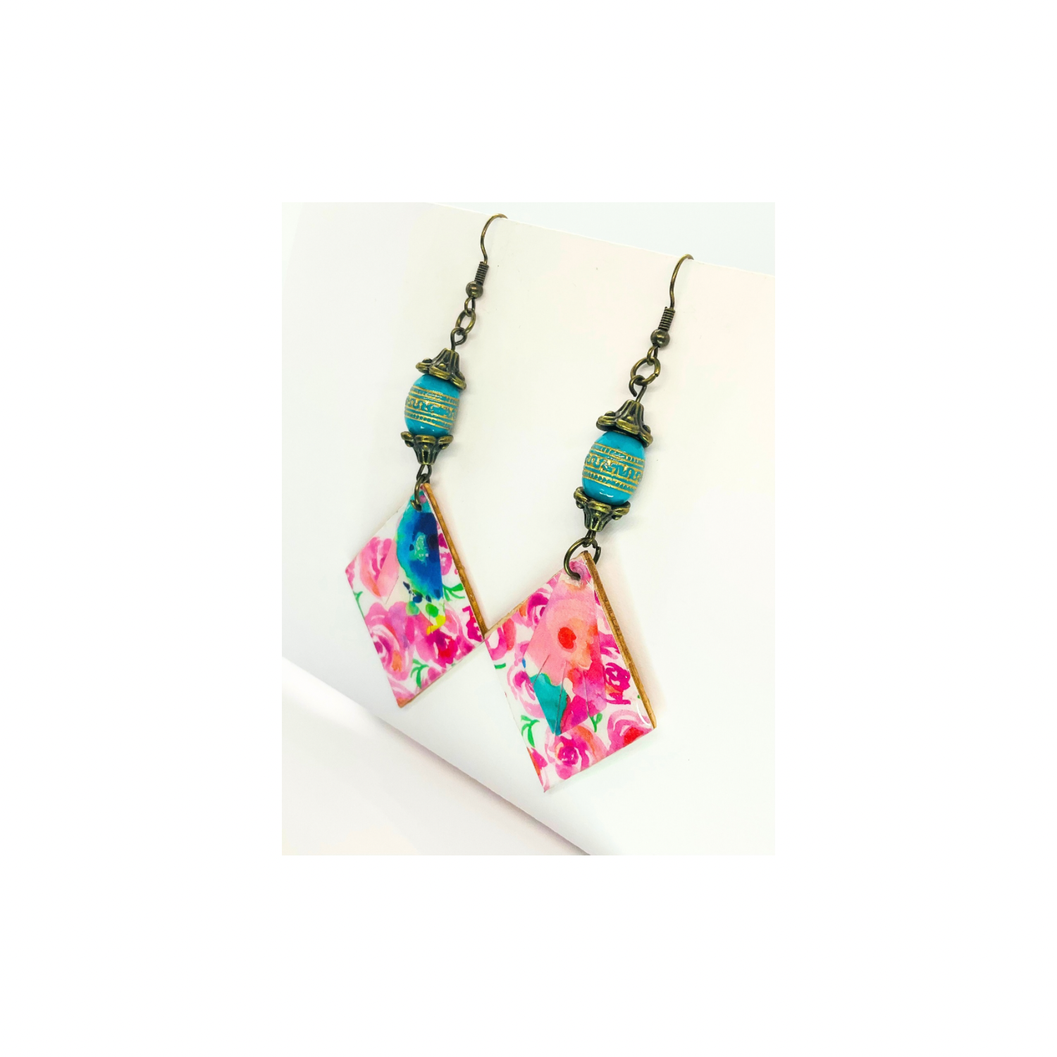 ✨ Unique Design: This BOHO-style drop earring boasts a distinctive look. Crafted from wood and decoupage-layered flower card stock, it features a turquoise boho bead on a wooden diamond shape. The bead is encased in bronze end caps, adding a sophisticated touch. Each piece is handmade, ensuring uniqueness. No two earrings are identical.