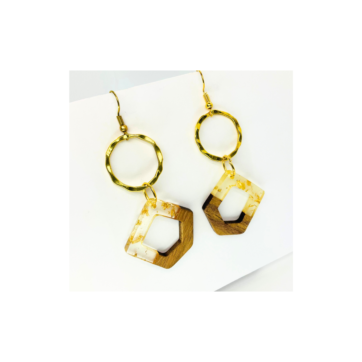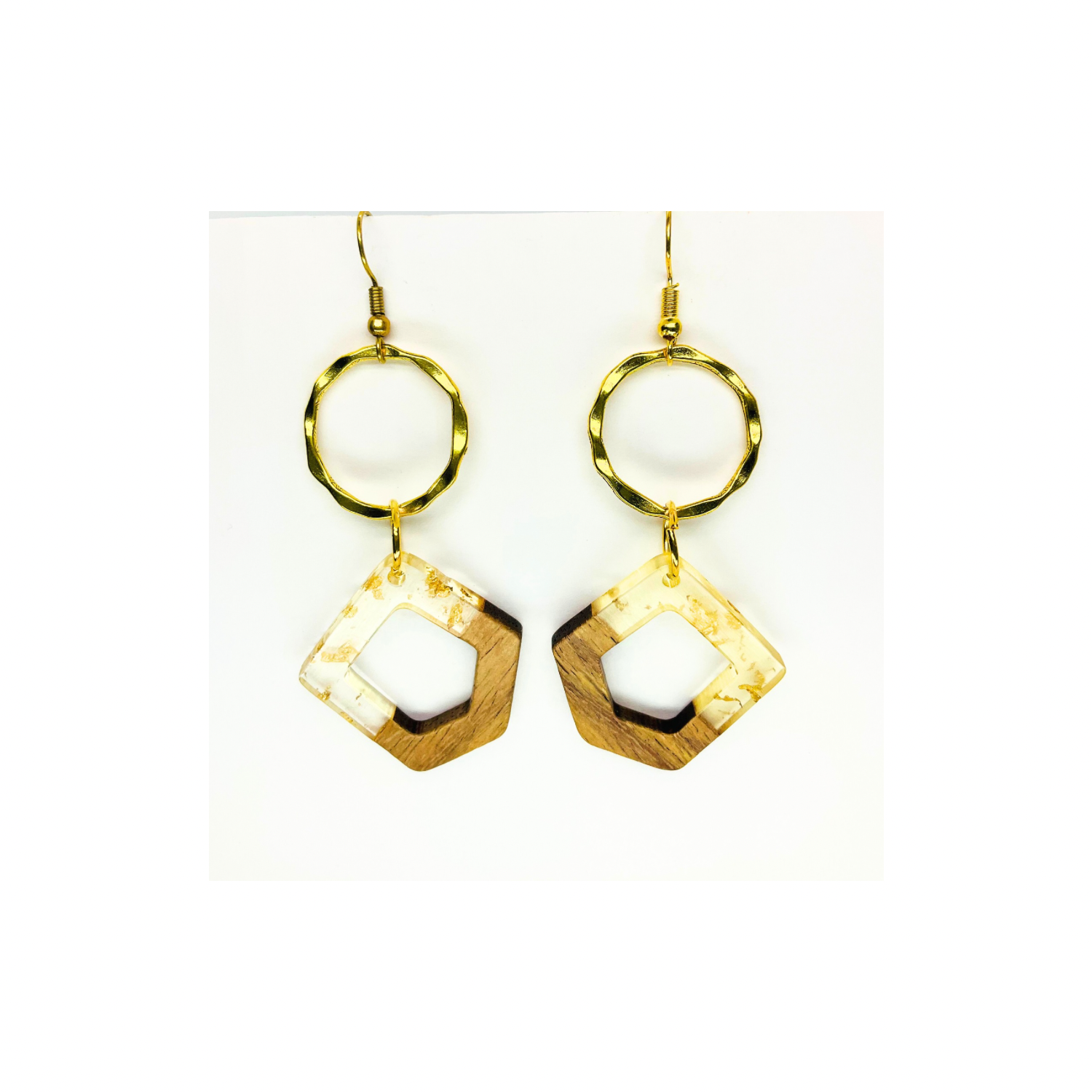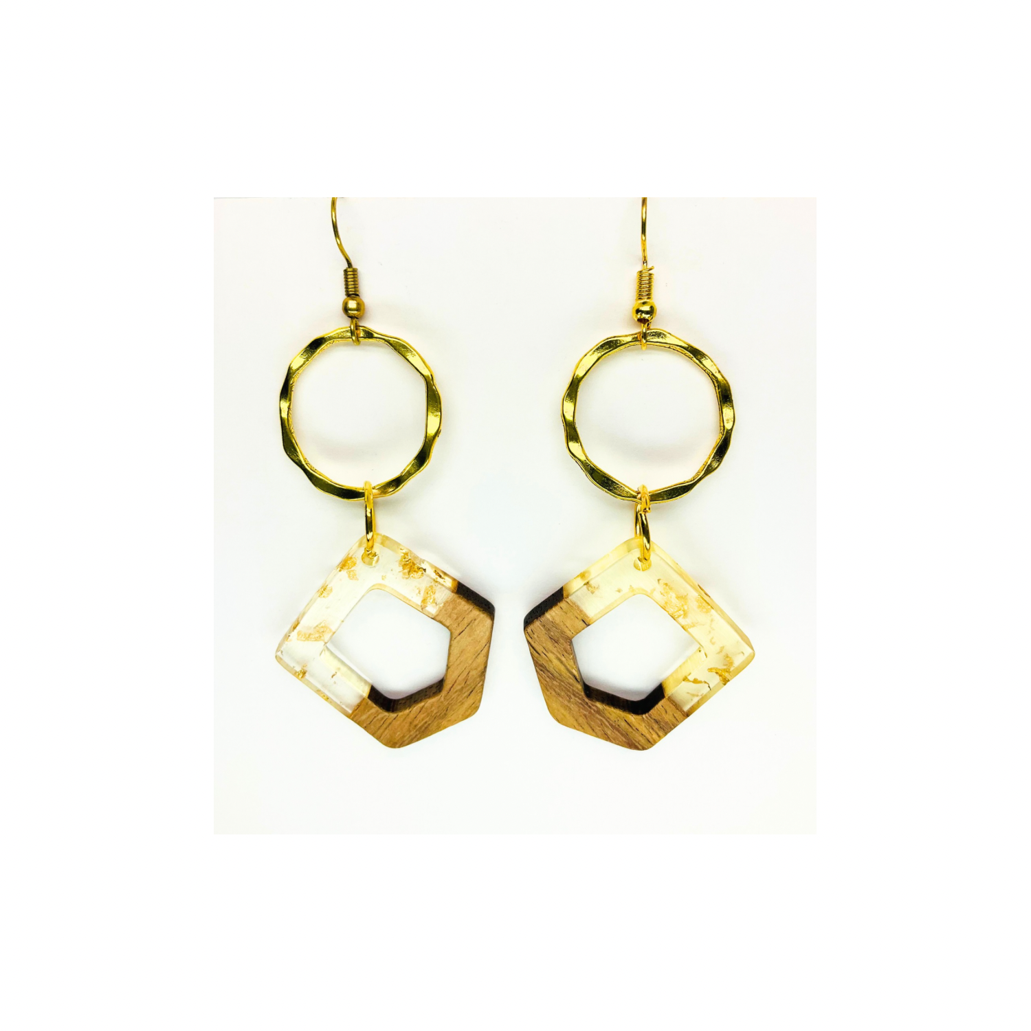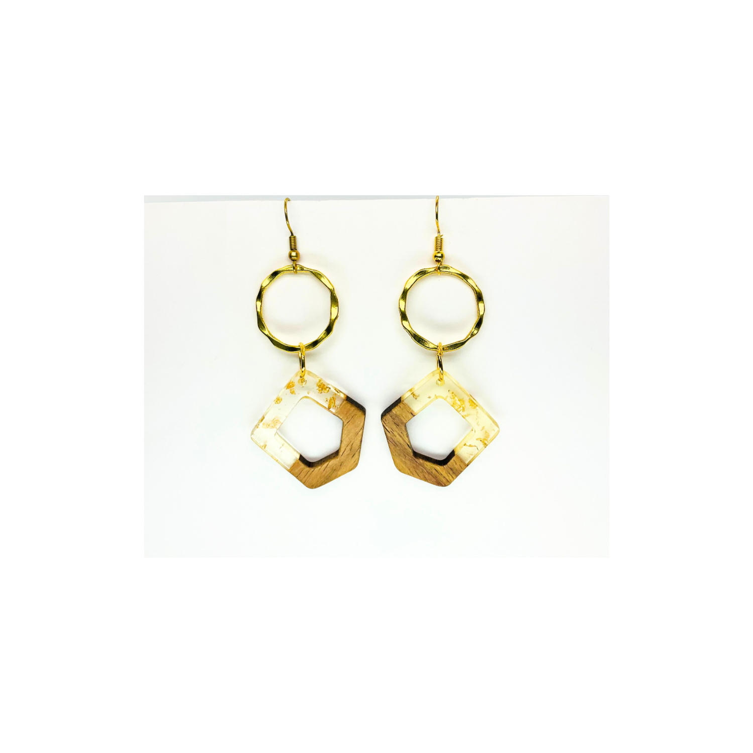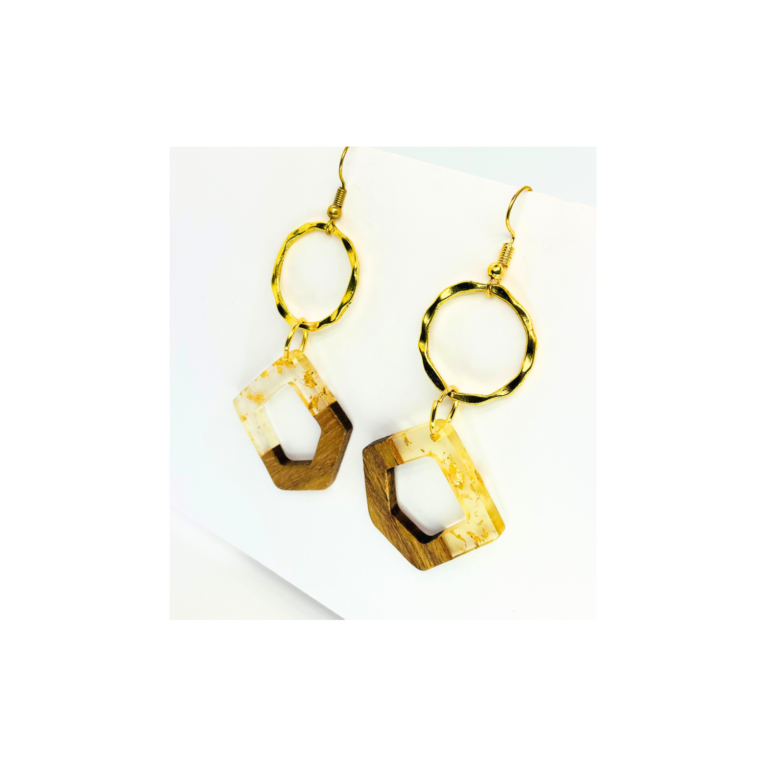 Discover the Boho Wood Collection Dangle Earrings, featuring a gold-tone geometric design. These earrings combine circular hoops with square pendants, creating a unique look. Perfect for adding a touch of bohemian flair to any outfit. The design is both stylish and versatile, making it suitable for a variety of occasions.