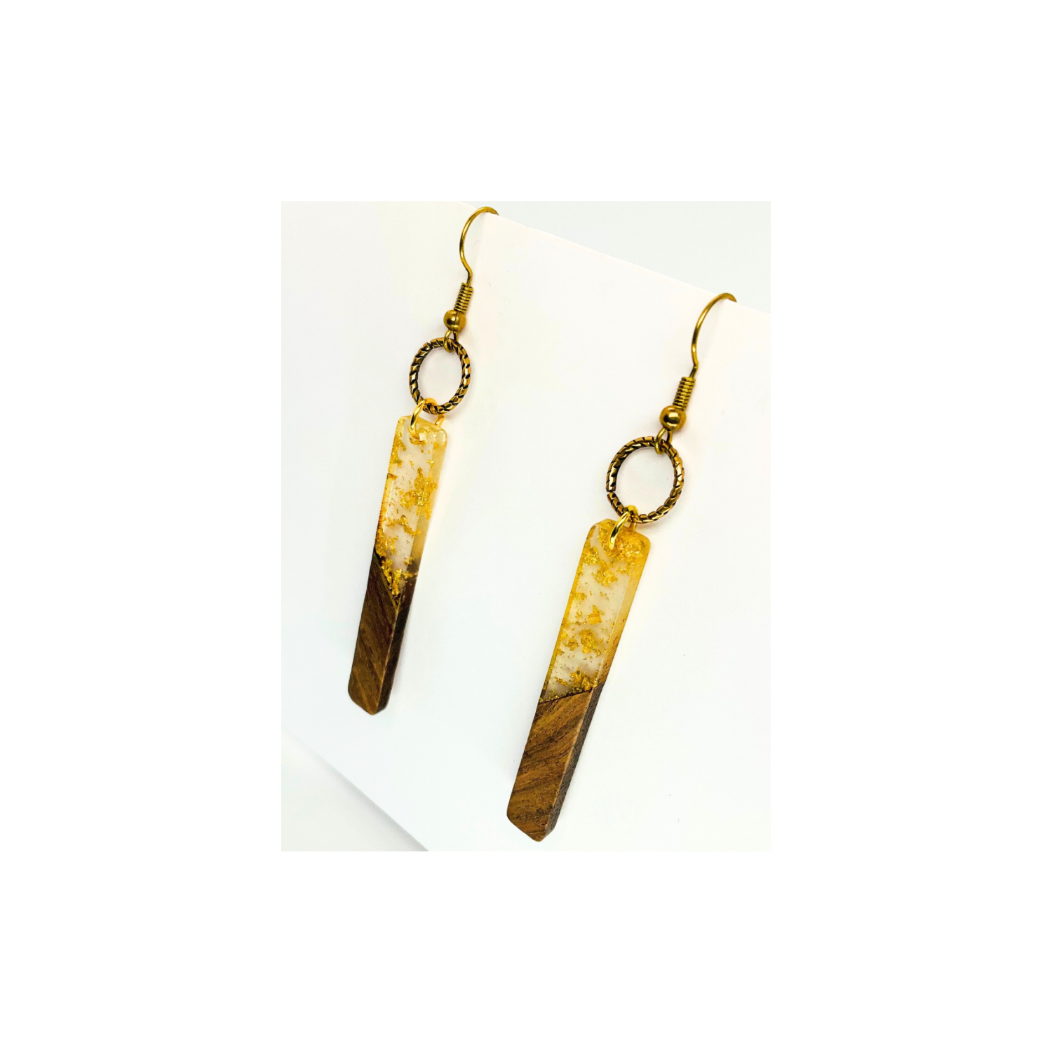 Discover the Boho Wood Collection Long Dangle Earring. This piece features a wooden design with gold accents, perfect for any bohemian style. The earrings dangle gracefully, adding a touch of sophistication to your look. Ideal for those who appreciate natural wood elements with a chic gold finish.