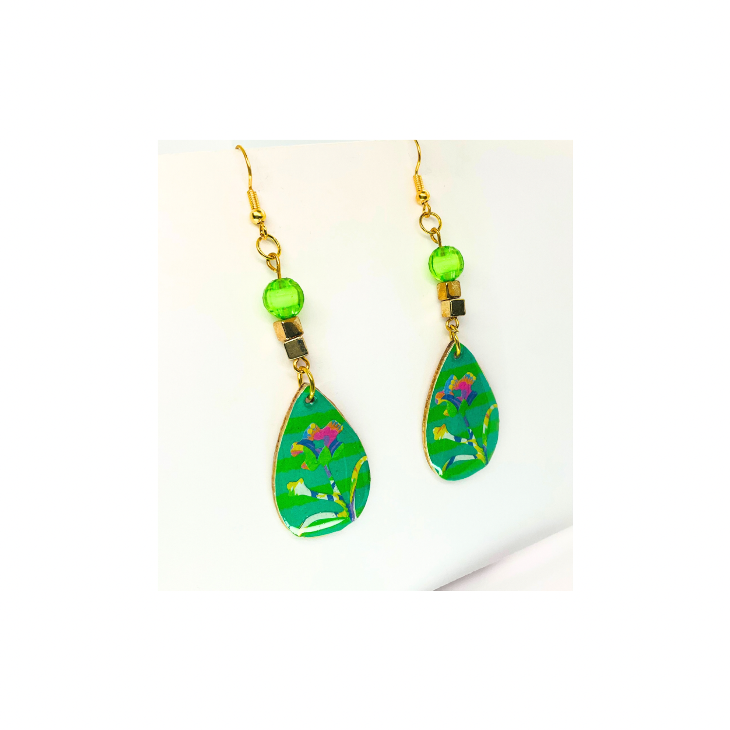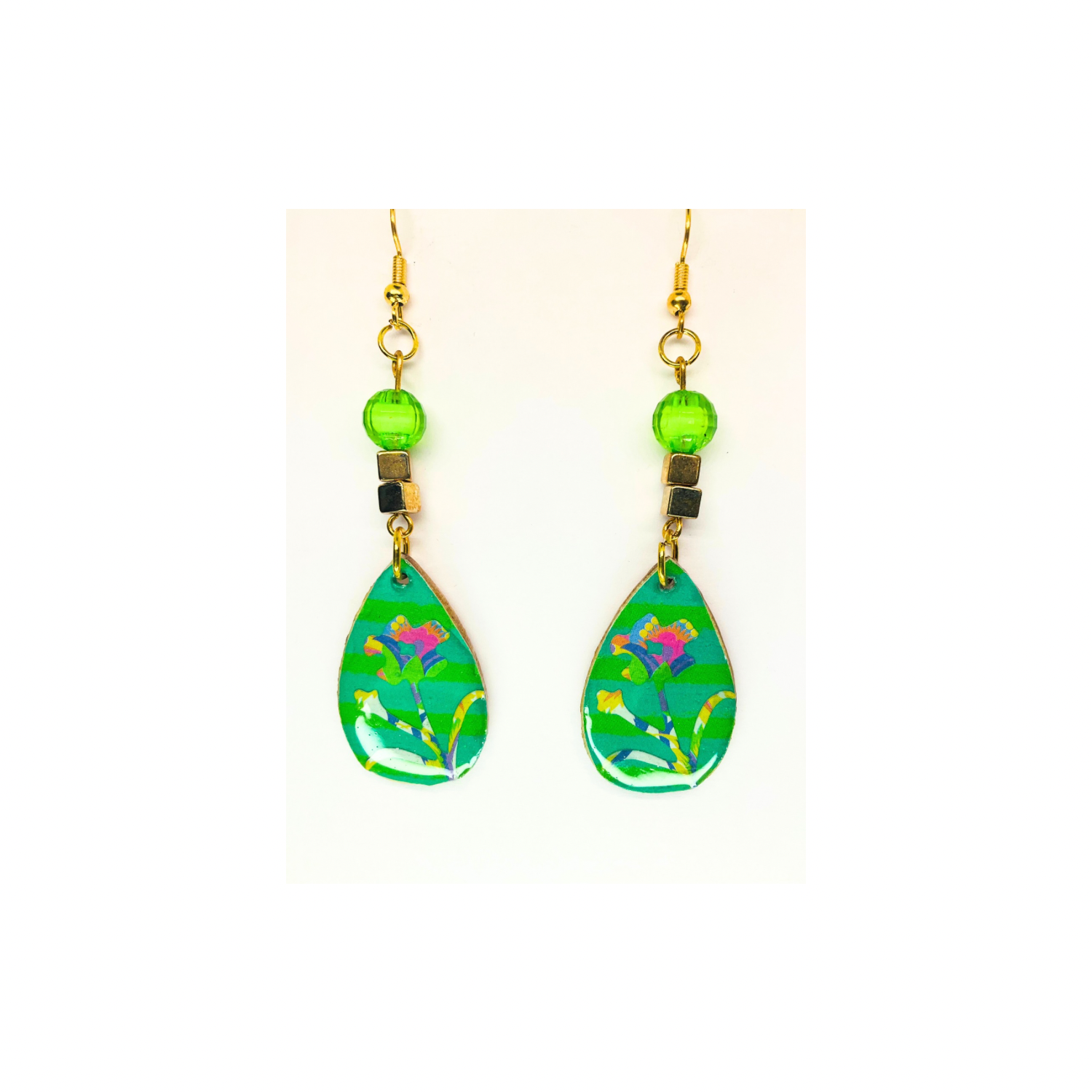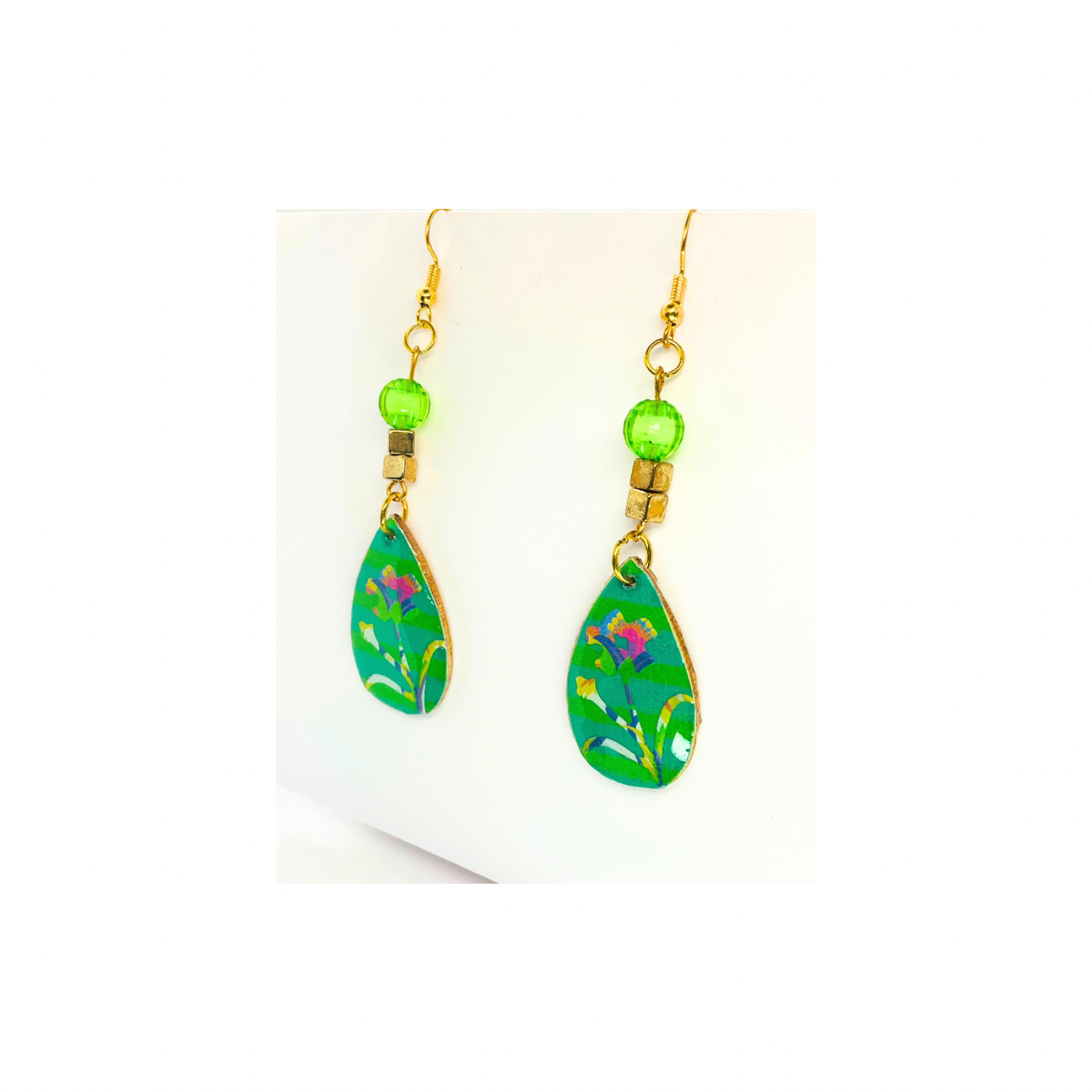 β¨ Handcrafted Elegance: This boho-style drop earring features a wood teardrop shape adorned with a decoupage layered flower cardstock. It's embellished with a bright green bead at the top. The set includes two beautiful square gold beads, adding a touch of sophistication. Each piece is unique, crafted one at a time with care and love.