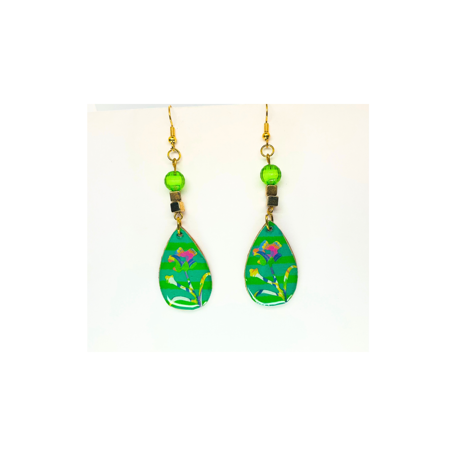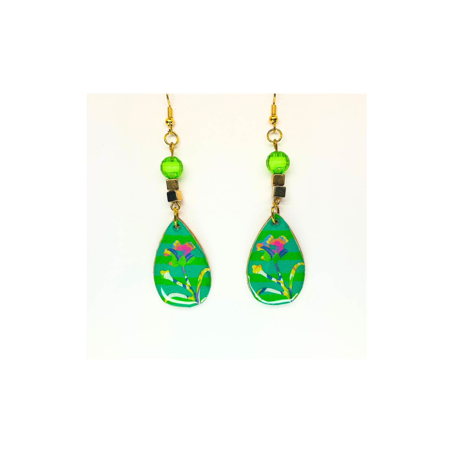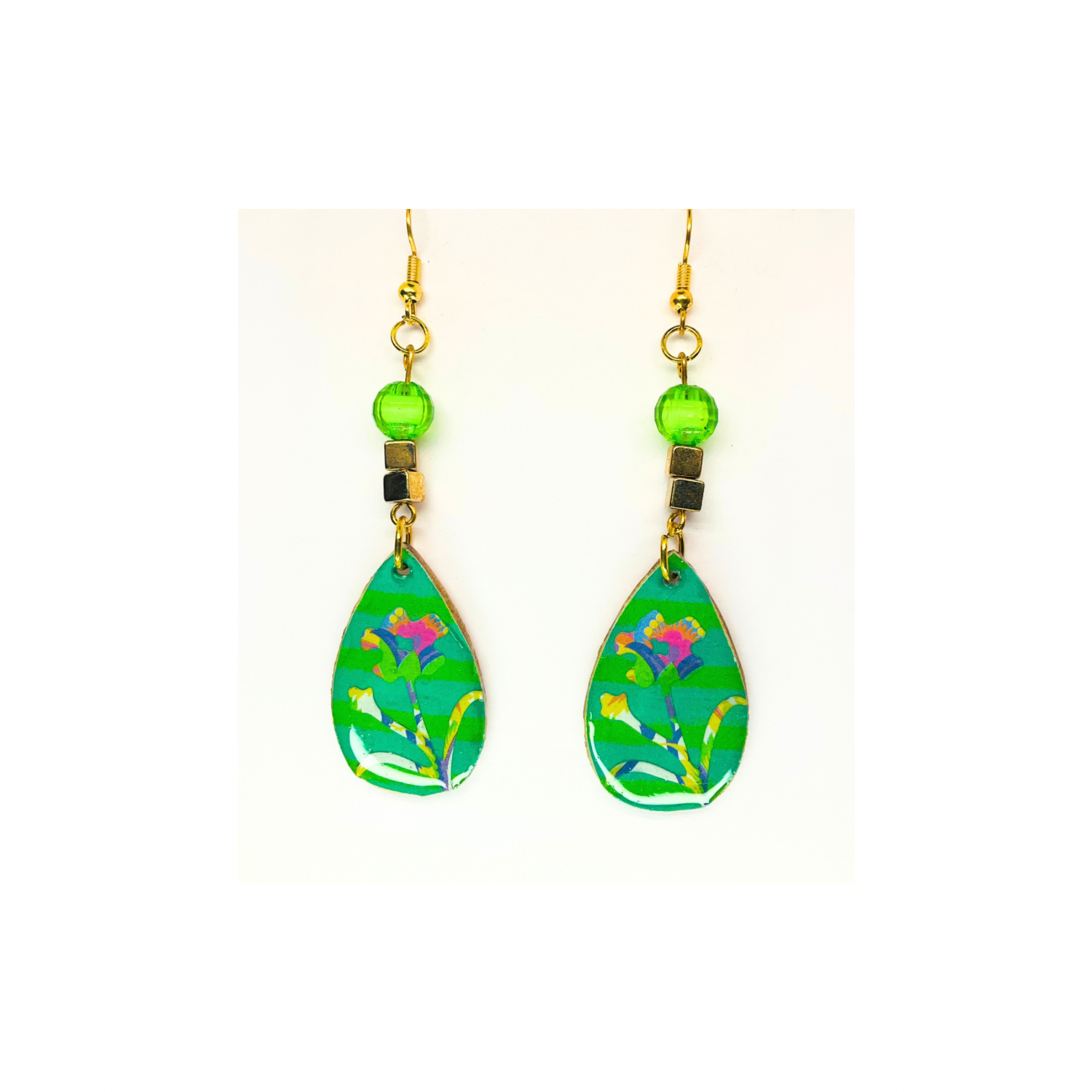 β¨ Handcrafted Elegance: This boho-style drop earring features a wood teardrop shape adorned with a decoupage layered flower cardstock. It's embellished with a bright green bead at the top. The set includes two beautiful square gold beads, adding a touch of sophistication. Each piece is unique, crafted one at a time with care and love.