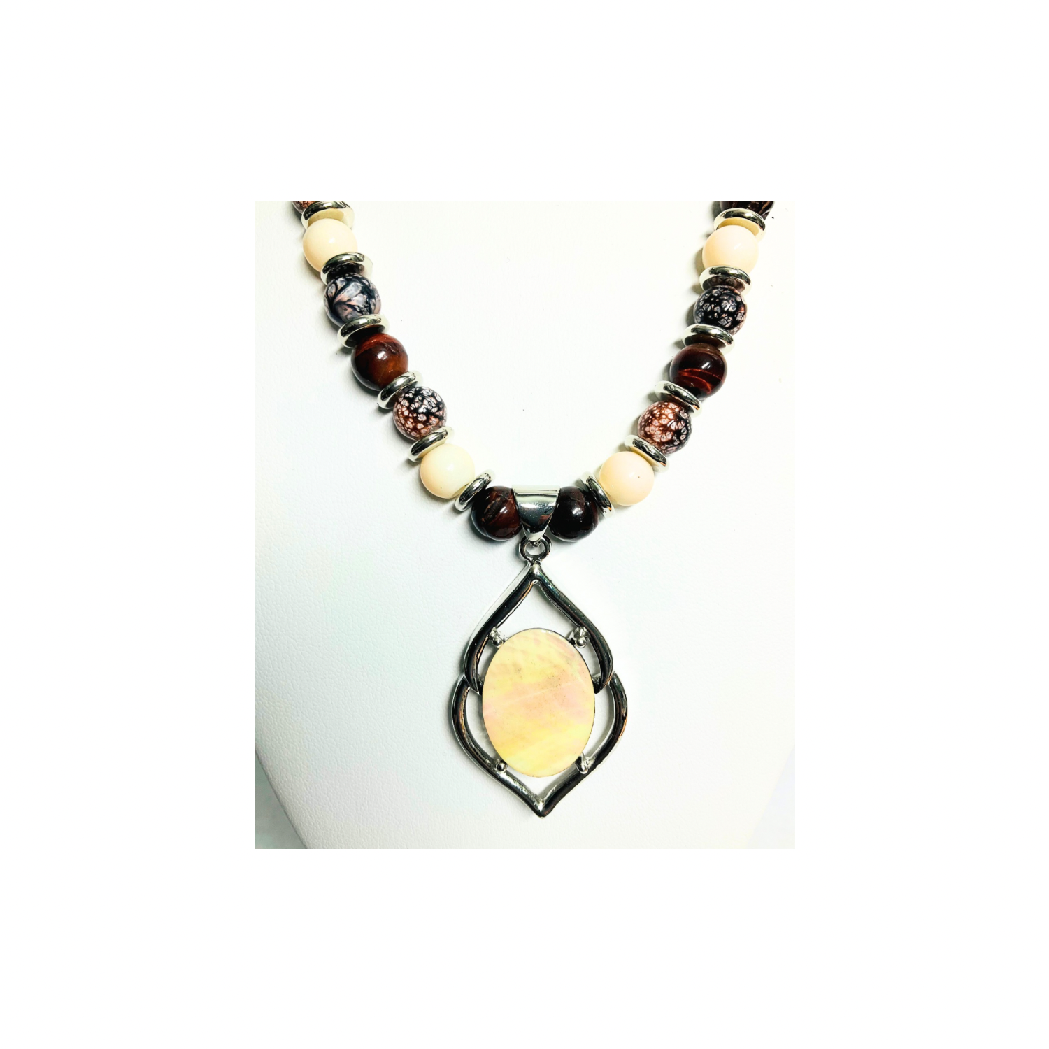 This necklace features a beautiful combination of brown and cream colors, complemented by silver accents. The 18-inch length ensures a versatile fit for a wide range of outfits. The beaded design adds a touch of elegance, making it perfect for enhancing your look.