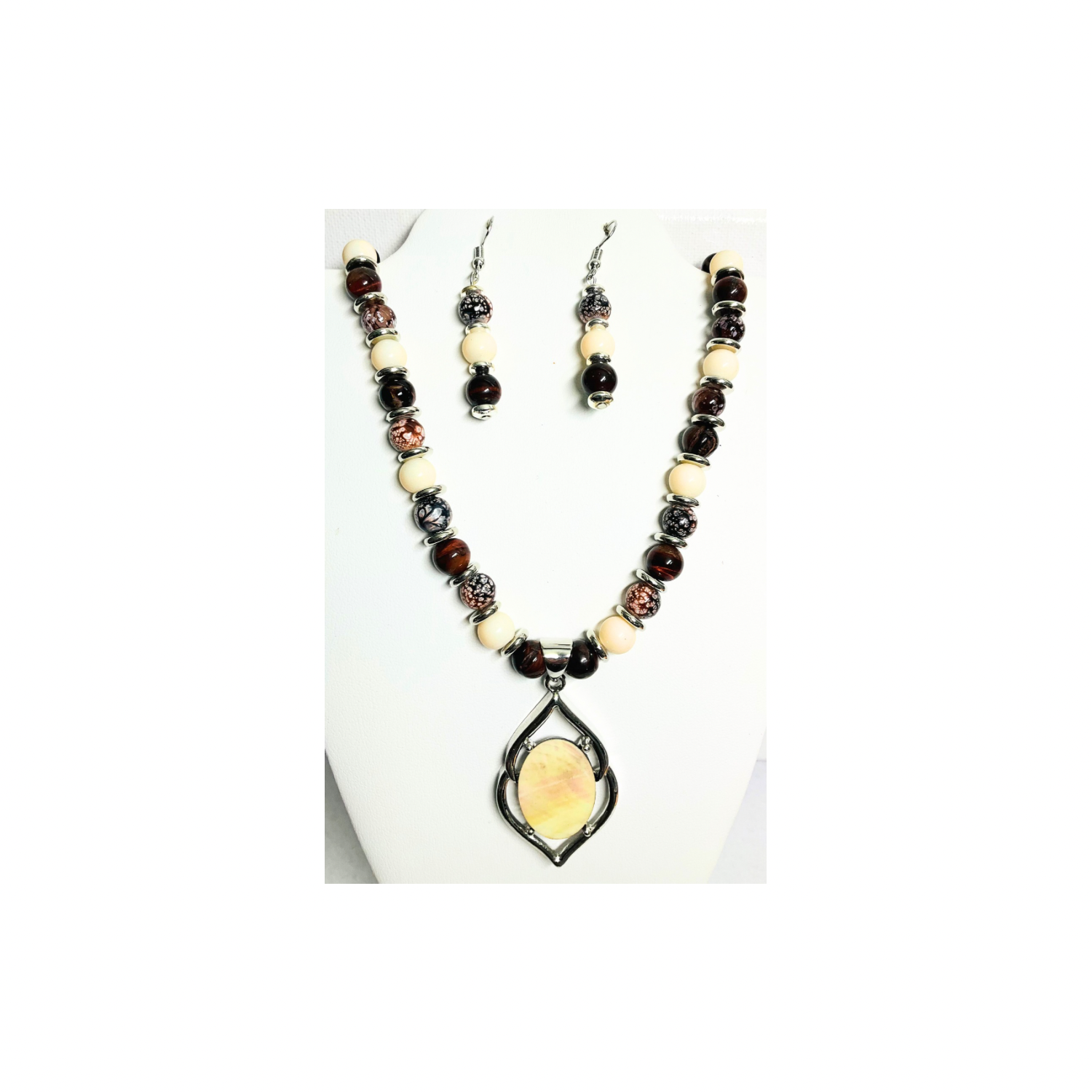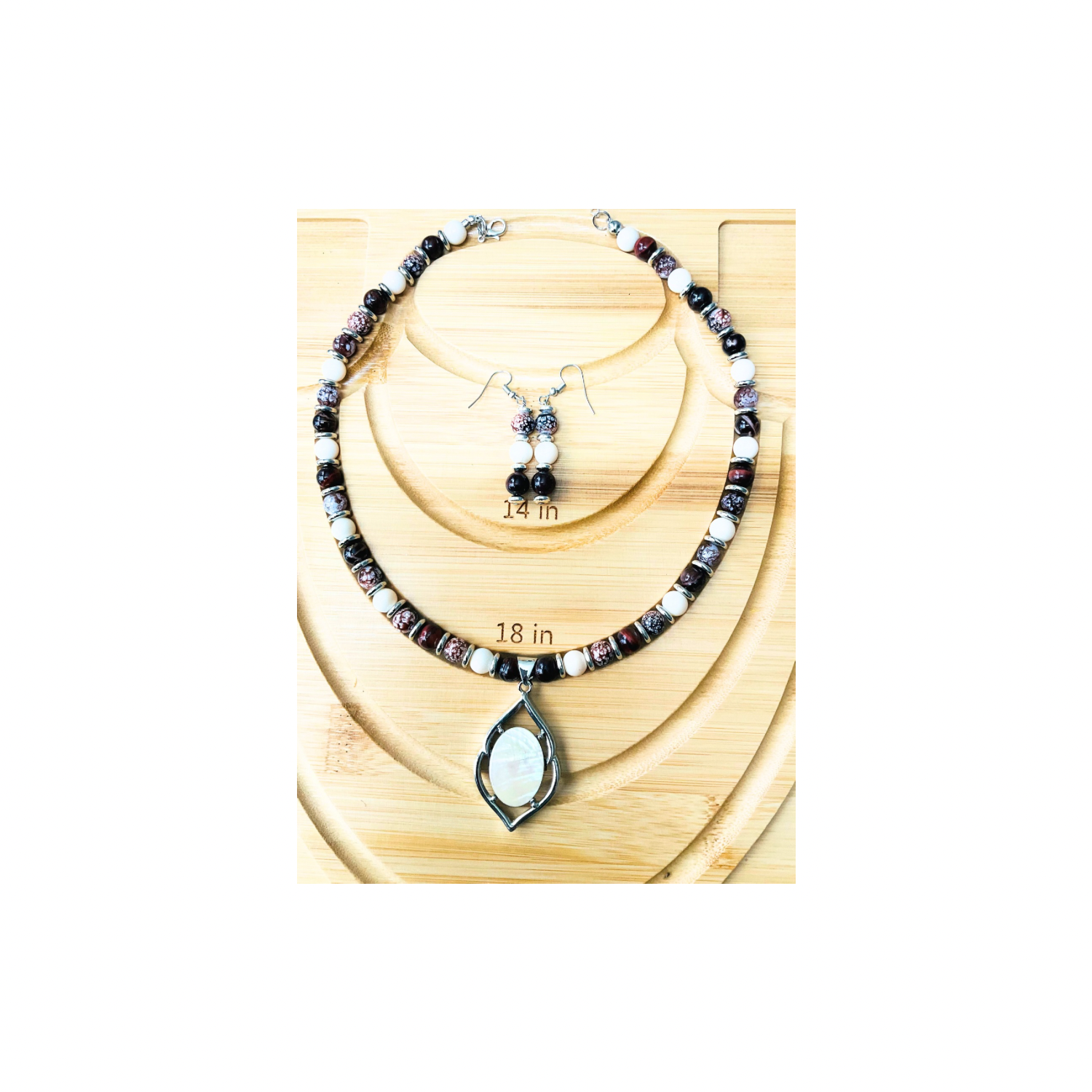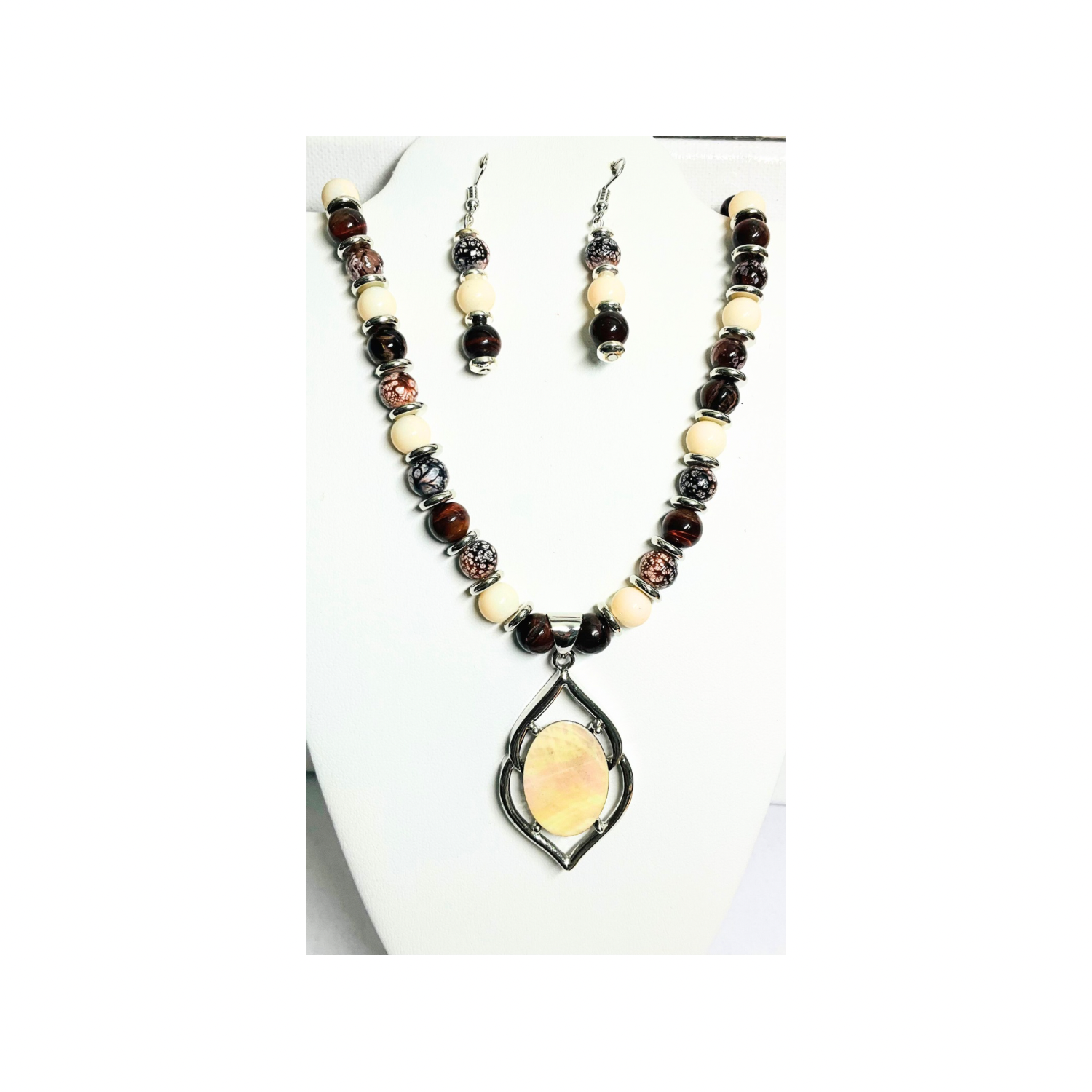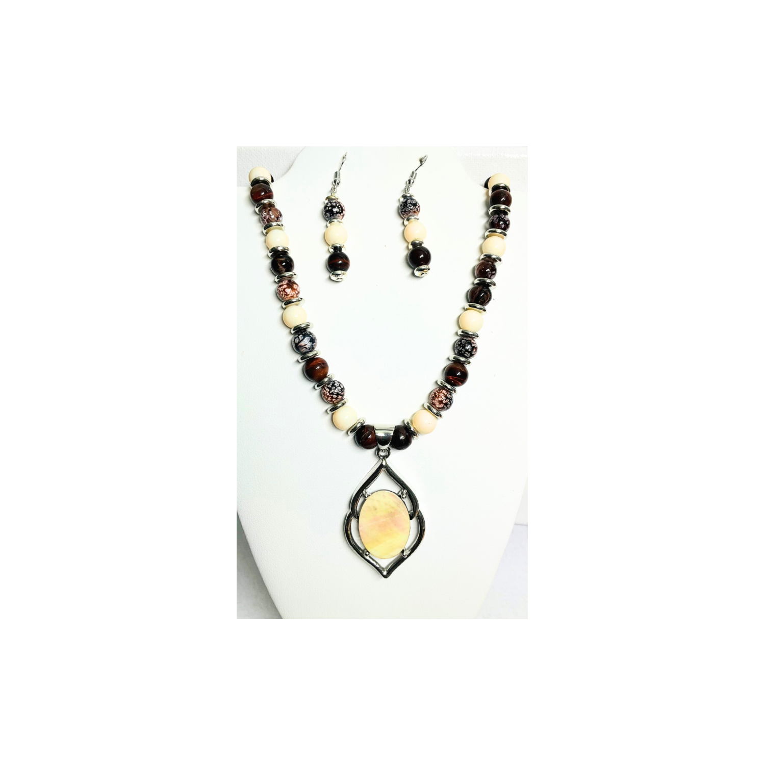 Beaded Necklace and Dangle Earring Set: Mother of Pearl Pendant