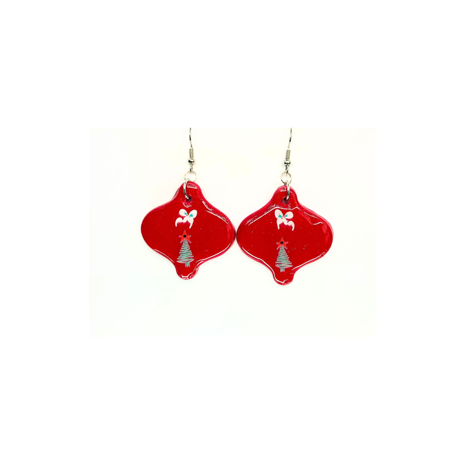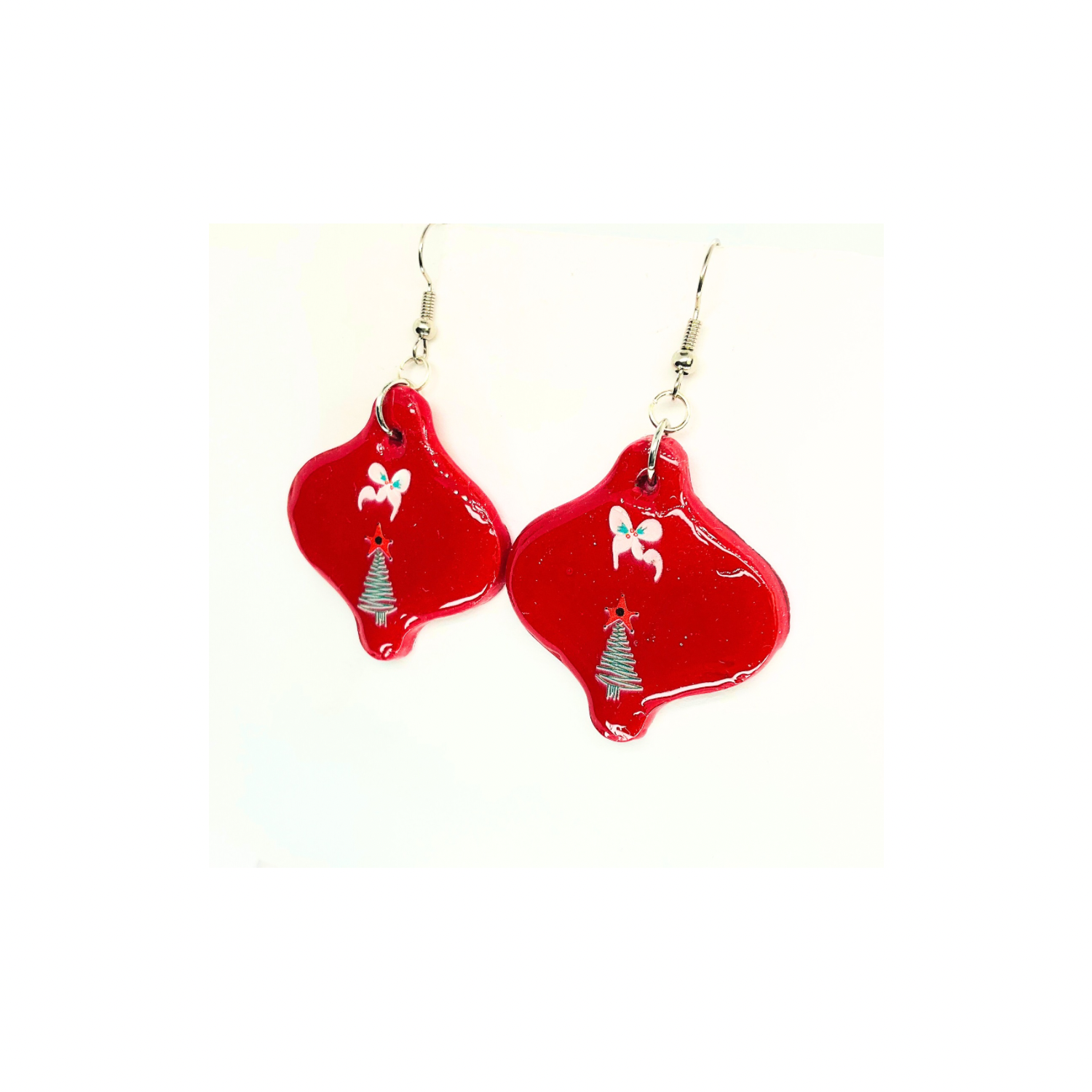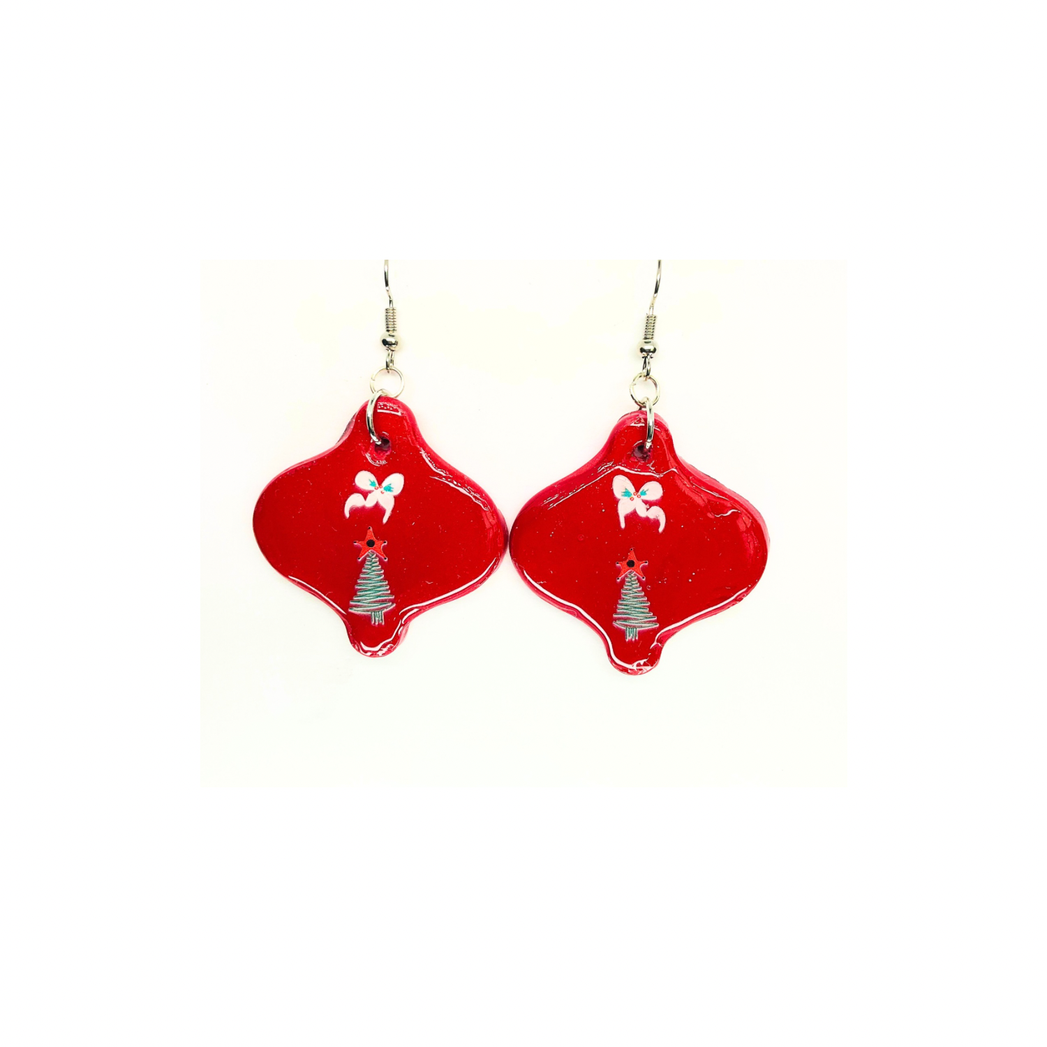 Dangle earrings featuring a festive design inspired by the Christmas in July collection. These earrings are perfect for adding a touch of holiday cheer to your outfit. The red ornament with tree embellishment is a standout piece, making them ideal for those who love unique, themed accessories.