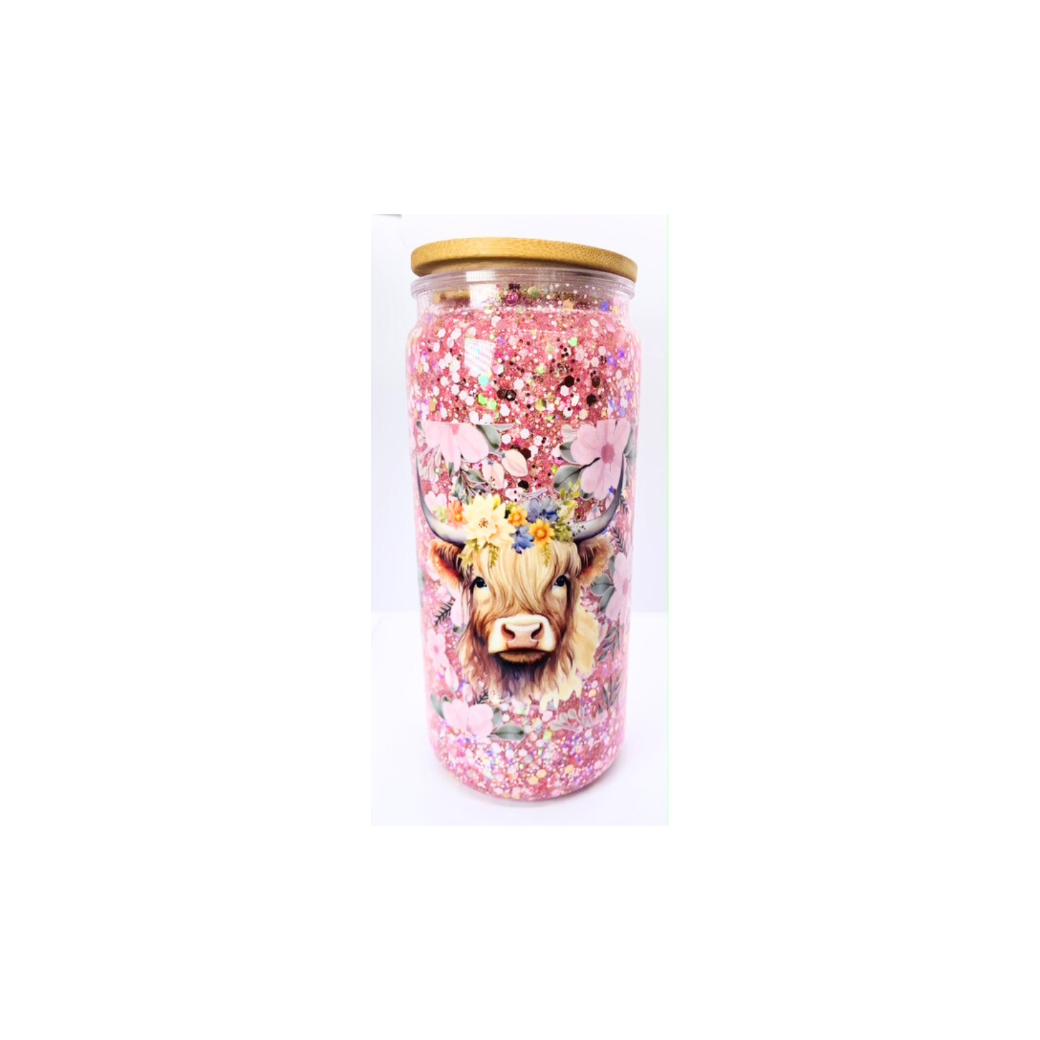 - Each tumbler features a unique pink sparkle design inspired by a Highland cow.