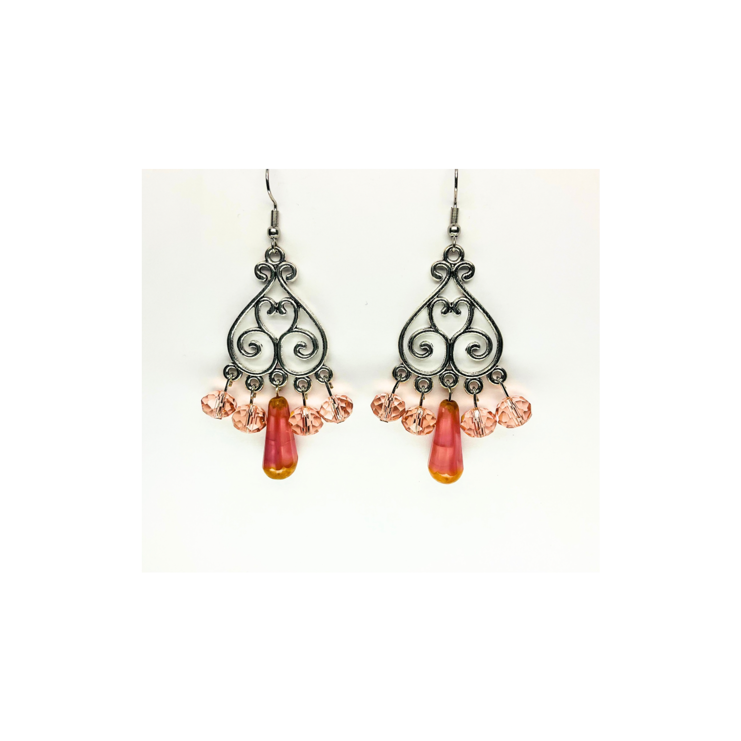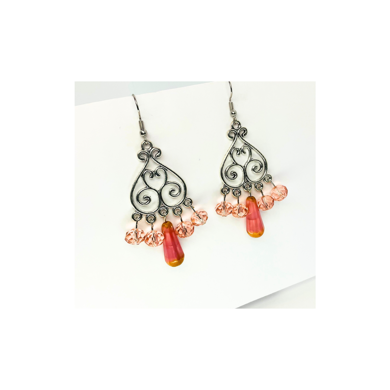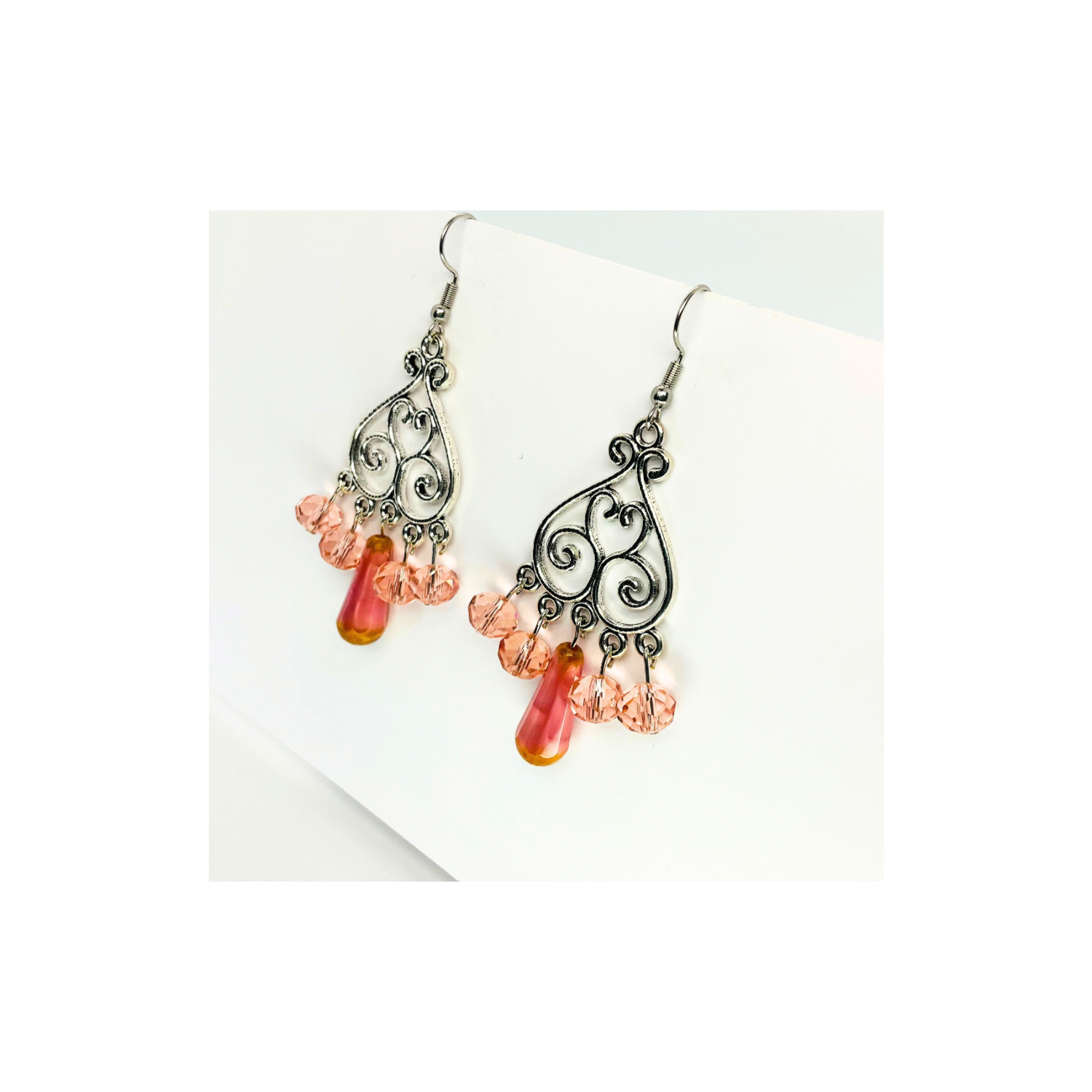 Crystal Chandelier Collection Teardrop Dangle Earrings with Pink and Orange Beads and Intricate Design