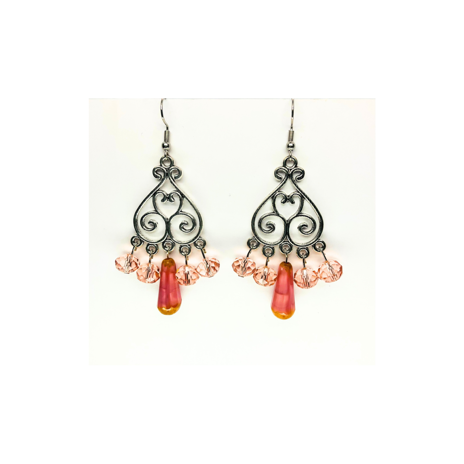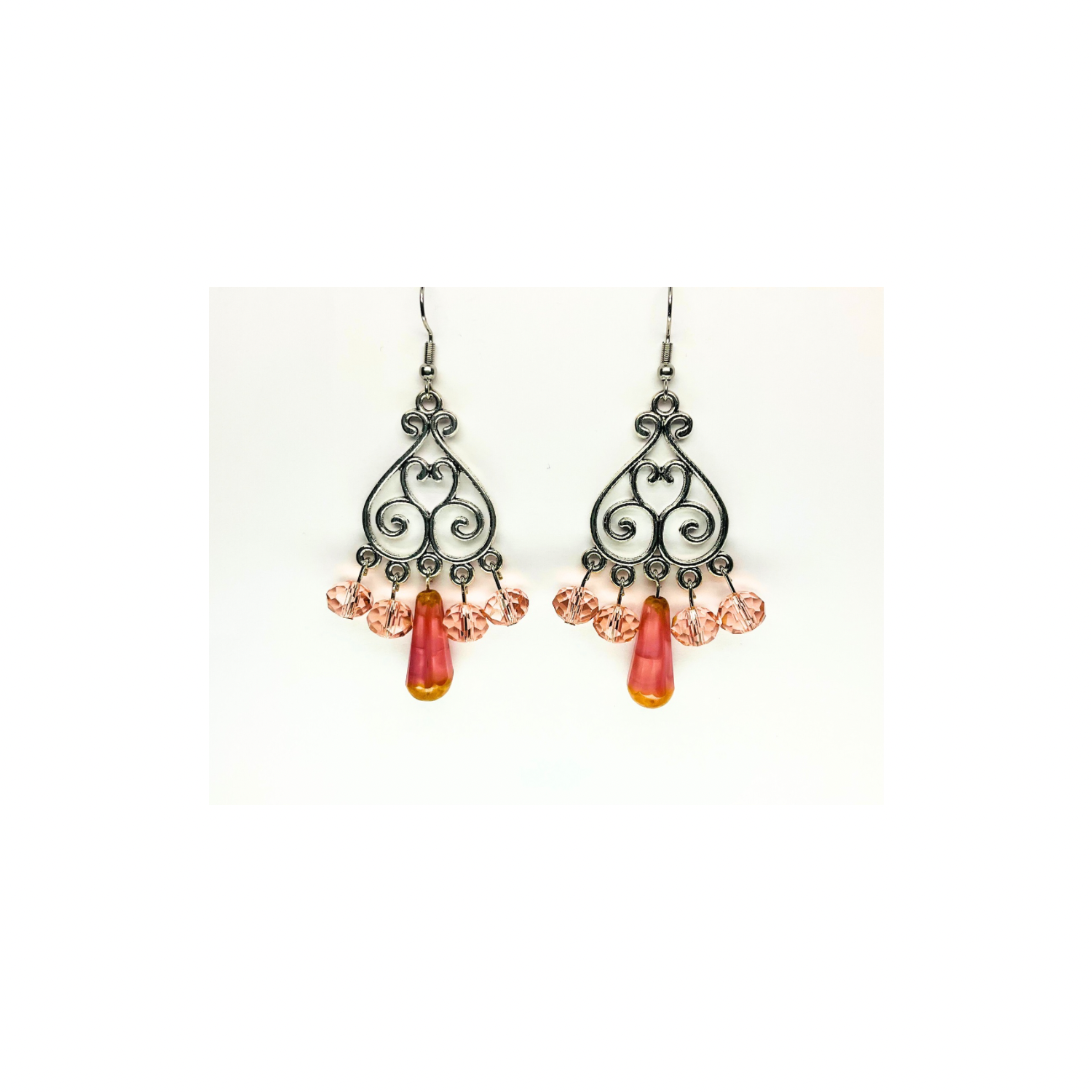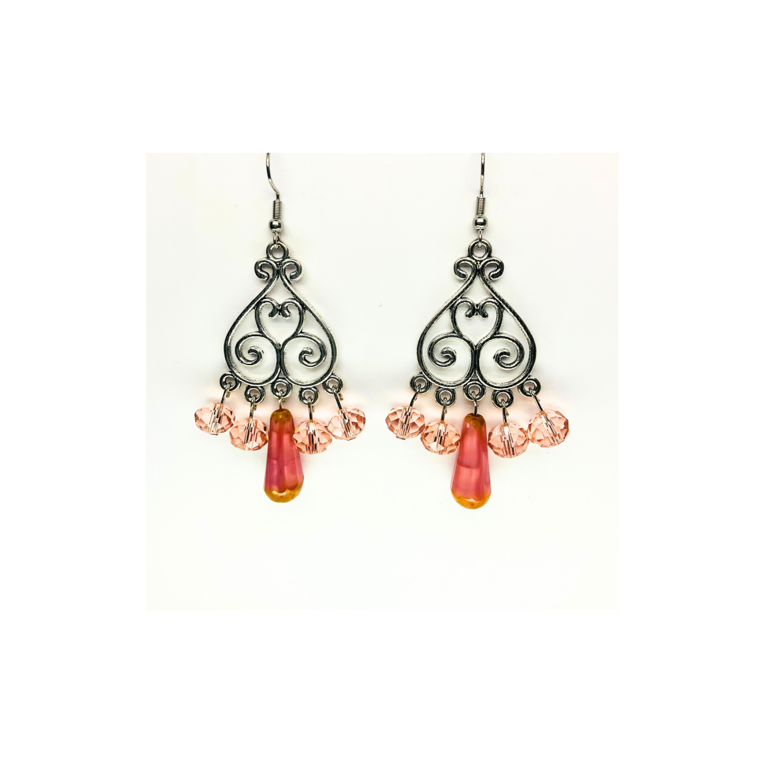 Crystal Chandelier Collection Teardrop Dangle Earrings with Pink and Orange Beads and Intricate Design