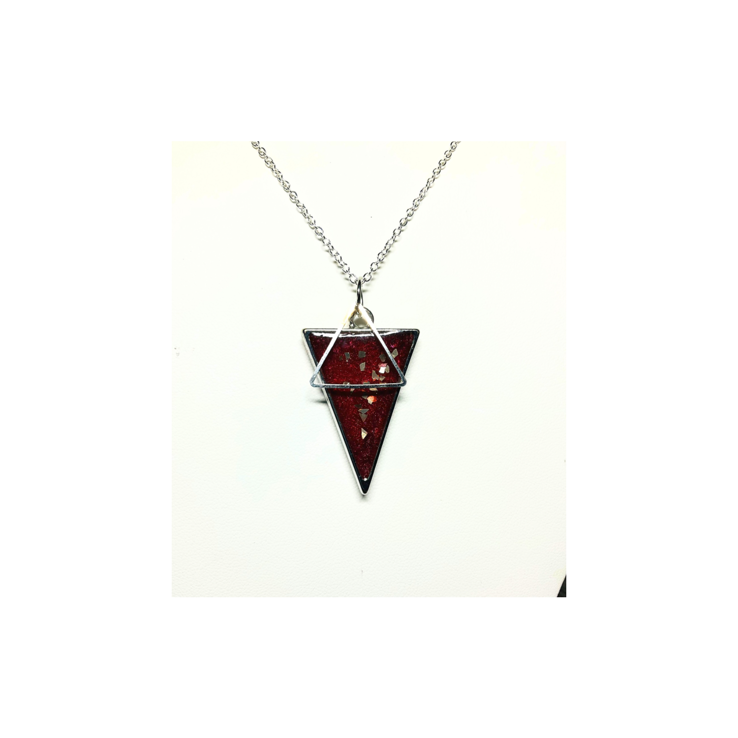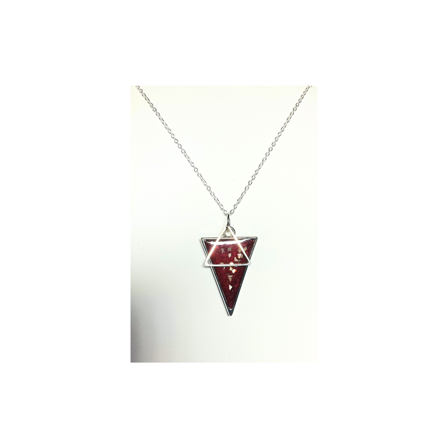 β¨ Discover the elegance of the Deep Red and Silver Triangle Necklace. This stunning piece features a bold triangle design in deep red, complemented by silver accents. The necklace is elegantly paired with an 18-inch silver chain, making it a versatile accessory for any outfit. Perfect for those who appreciate modern jewelry with a touch of sophistication.