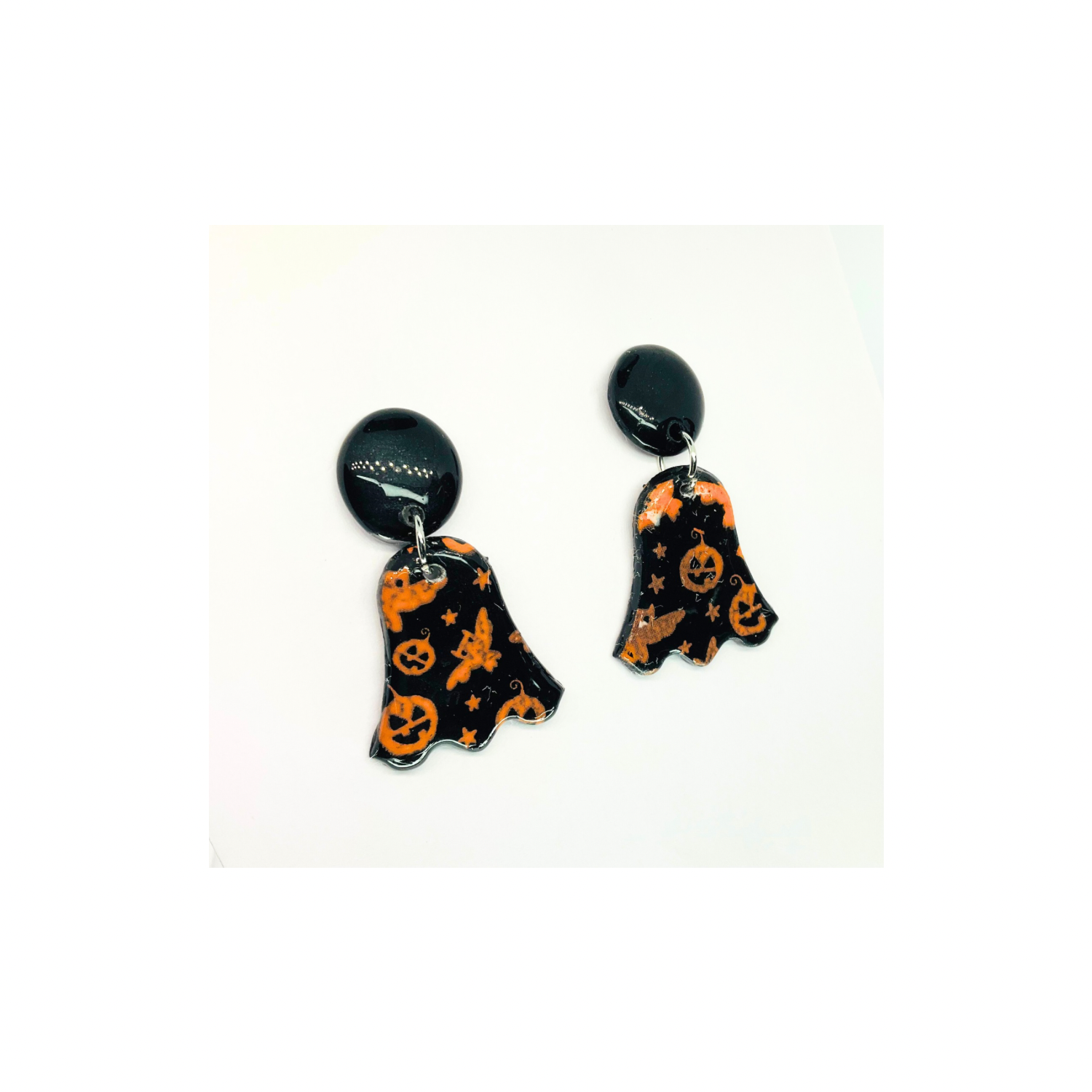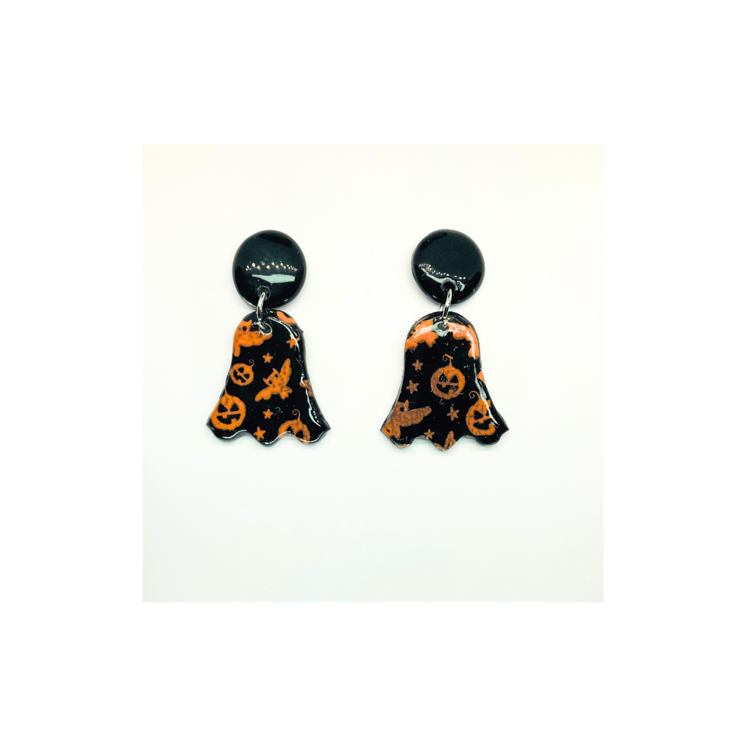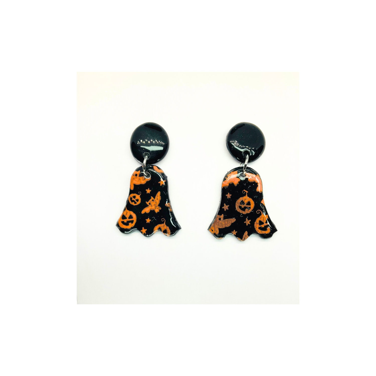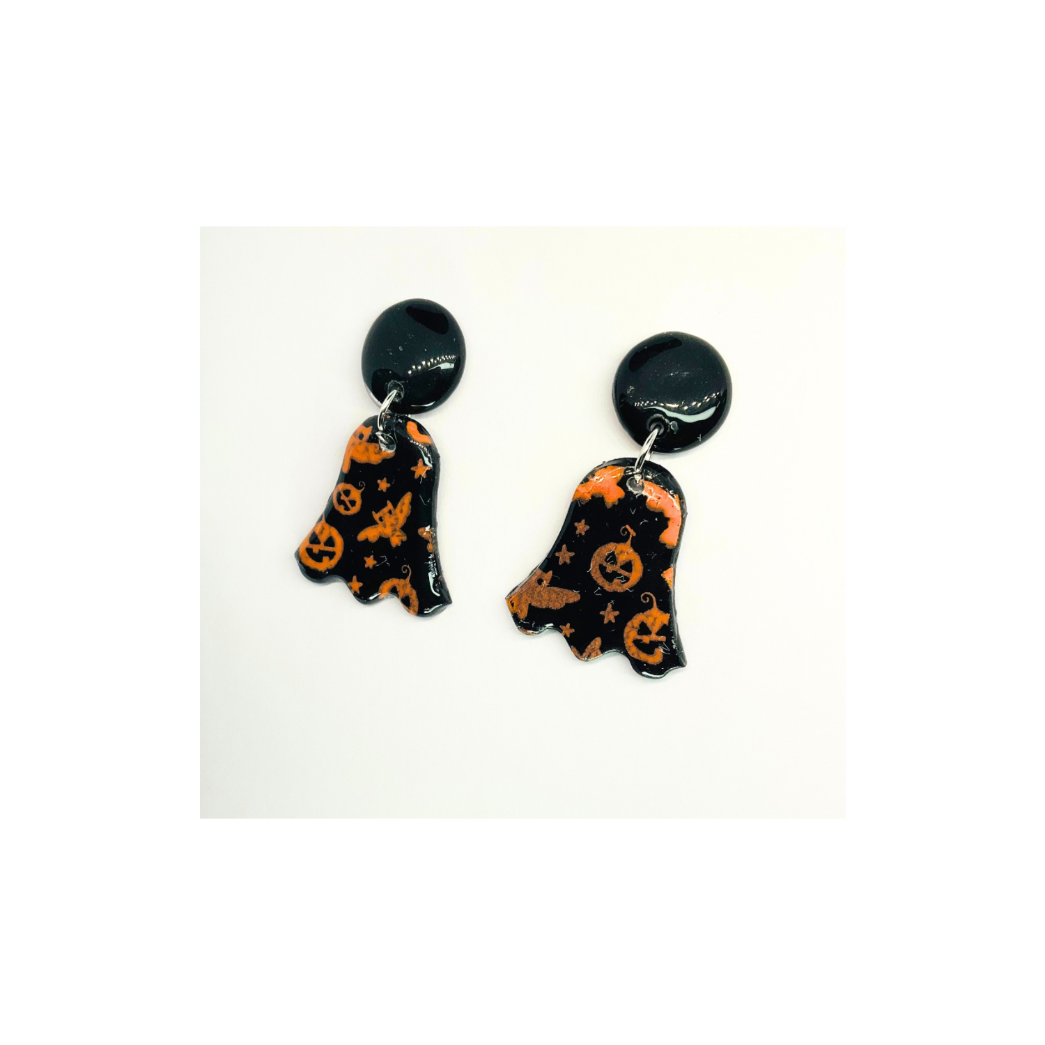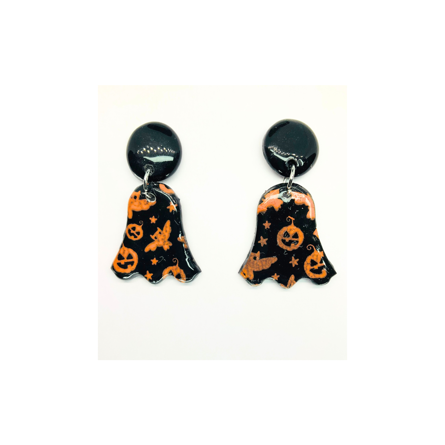These earrings are perfect for Halloween enthusiasts. The design features a ghostly black and orange color scheme, adorned with a stud button dangle. Ideal for adding a festive touch to your outfit.