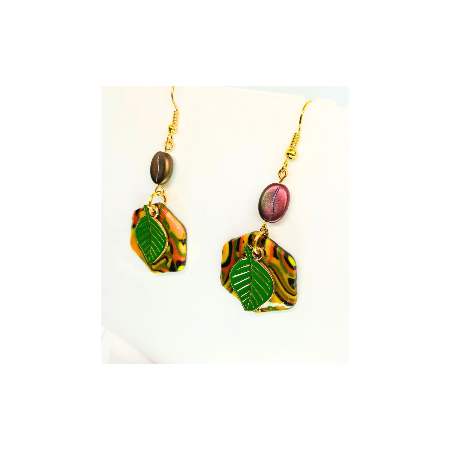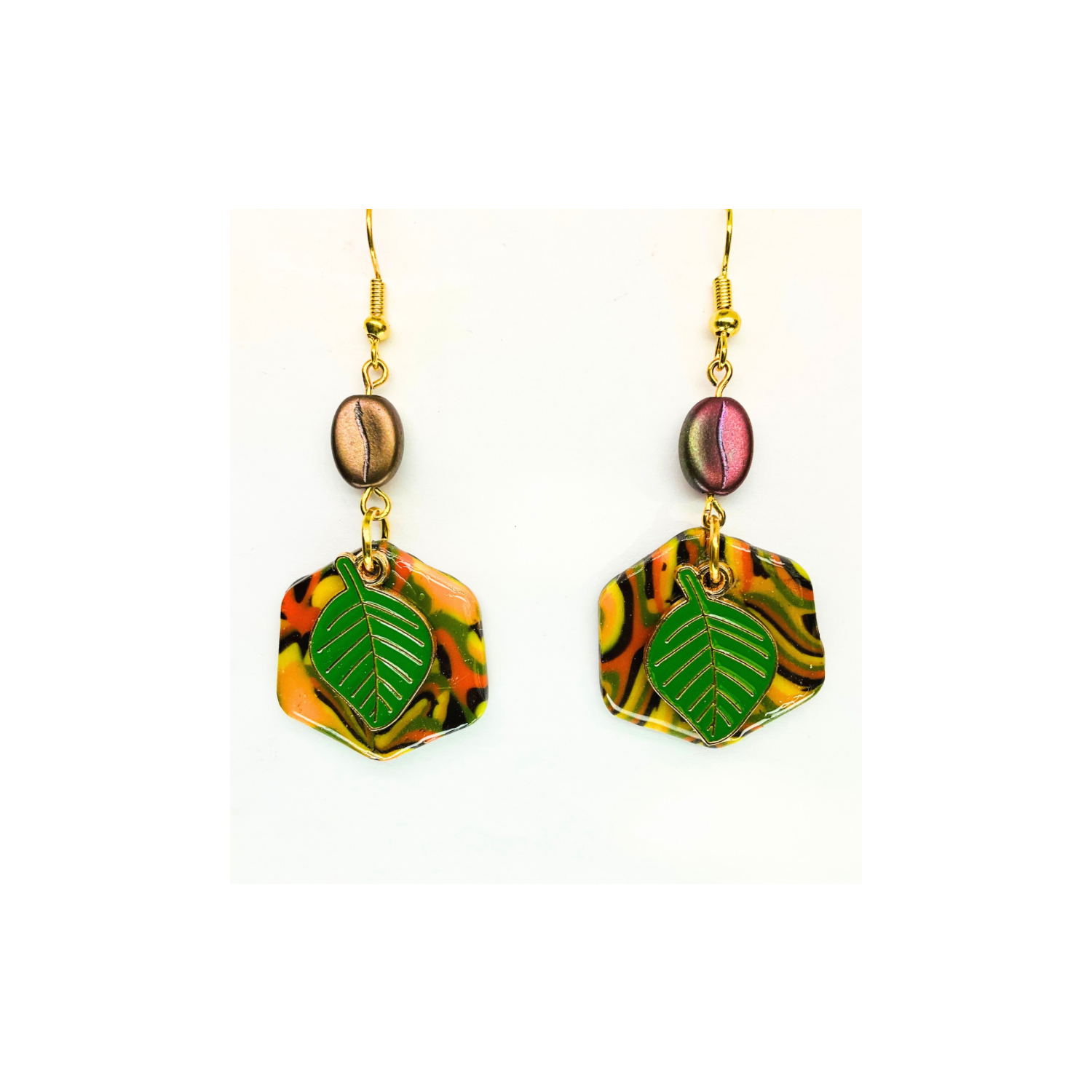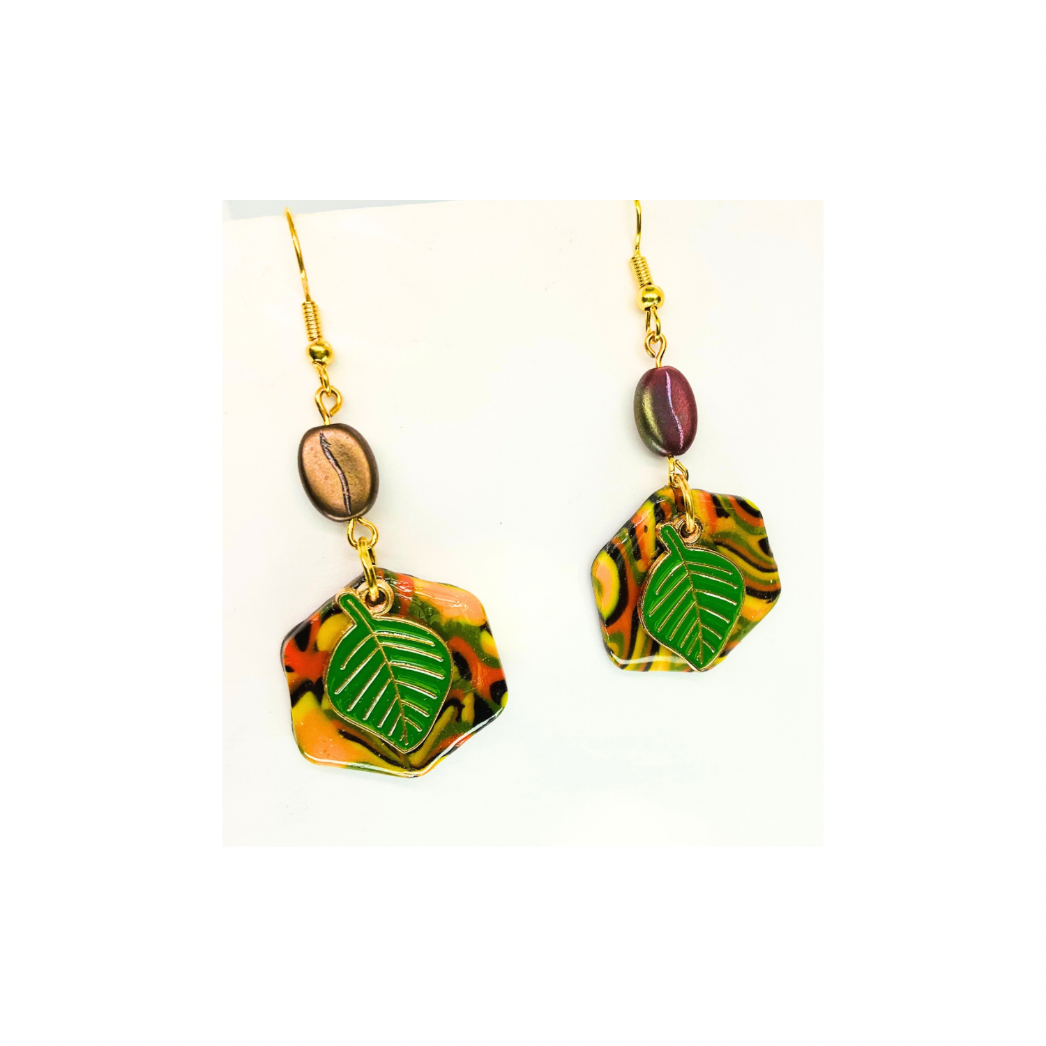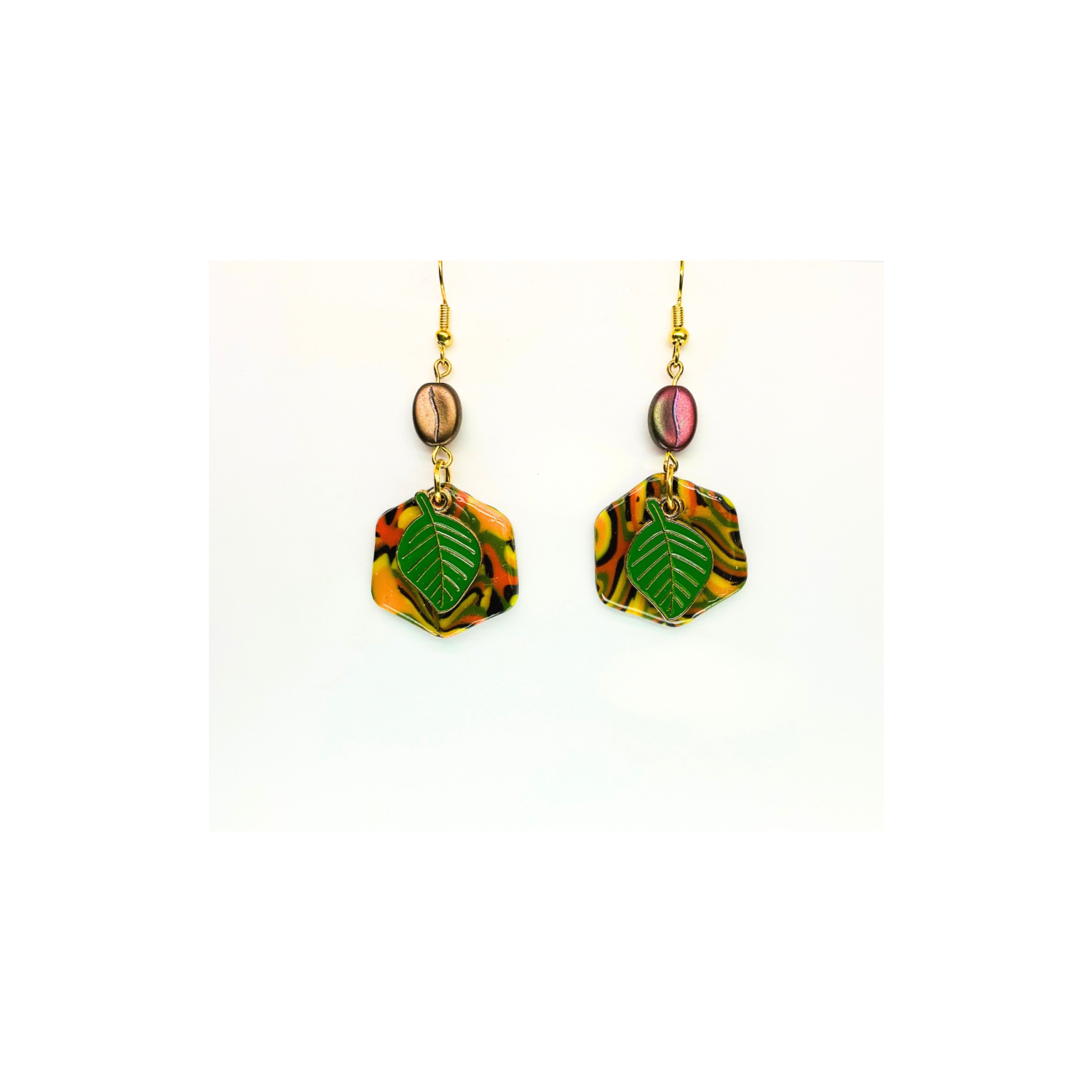 The colorful hexagon design on the earrings brings a splash of color. It's not just a decorative element, but also adds structure to the leaf charm. This unique combination makes the earrings stand out, making them a favorite accessory for any outfit.