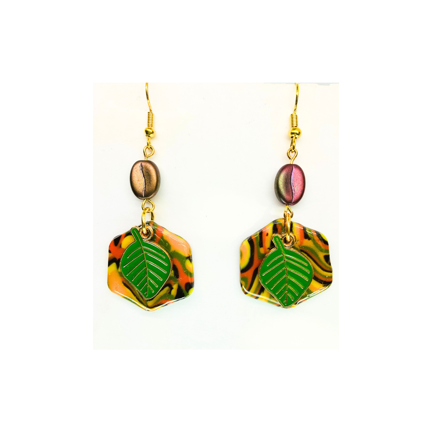 Fall Collection Deep Green Leaf Charm Dangle Earrings with Colorful Hexagon Design and Gold Hooks