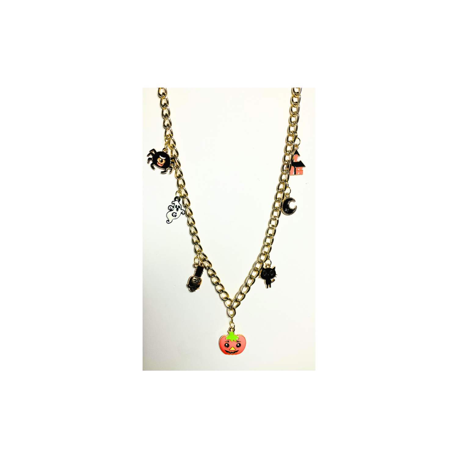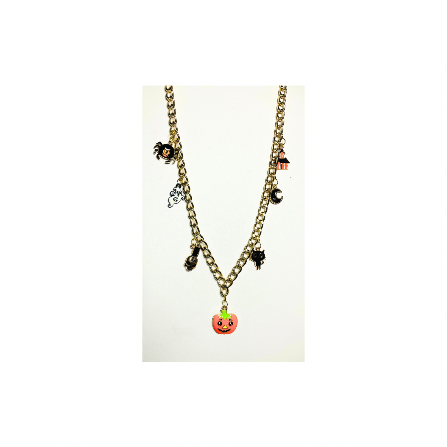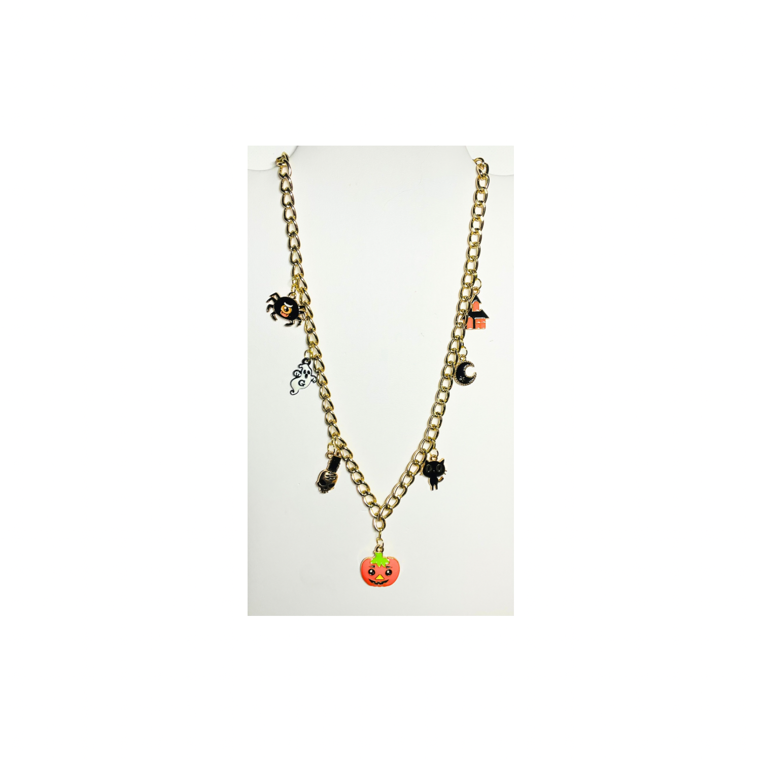 This necklace is a delightful addition to your Halloween collection, combining charm and style. Perfect for those looking to add a festive touch to their outfit.