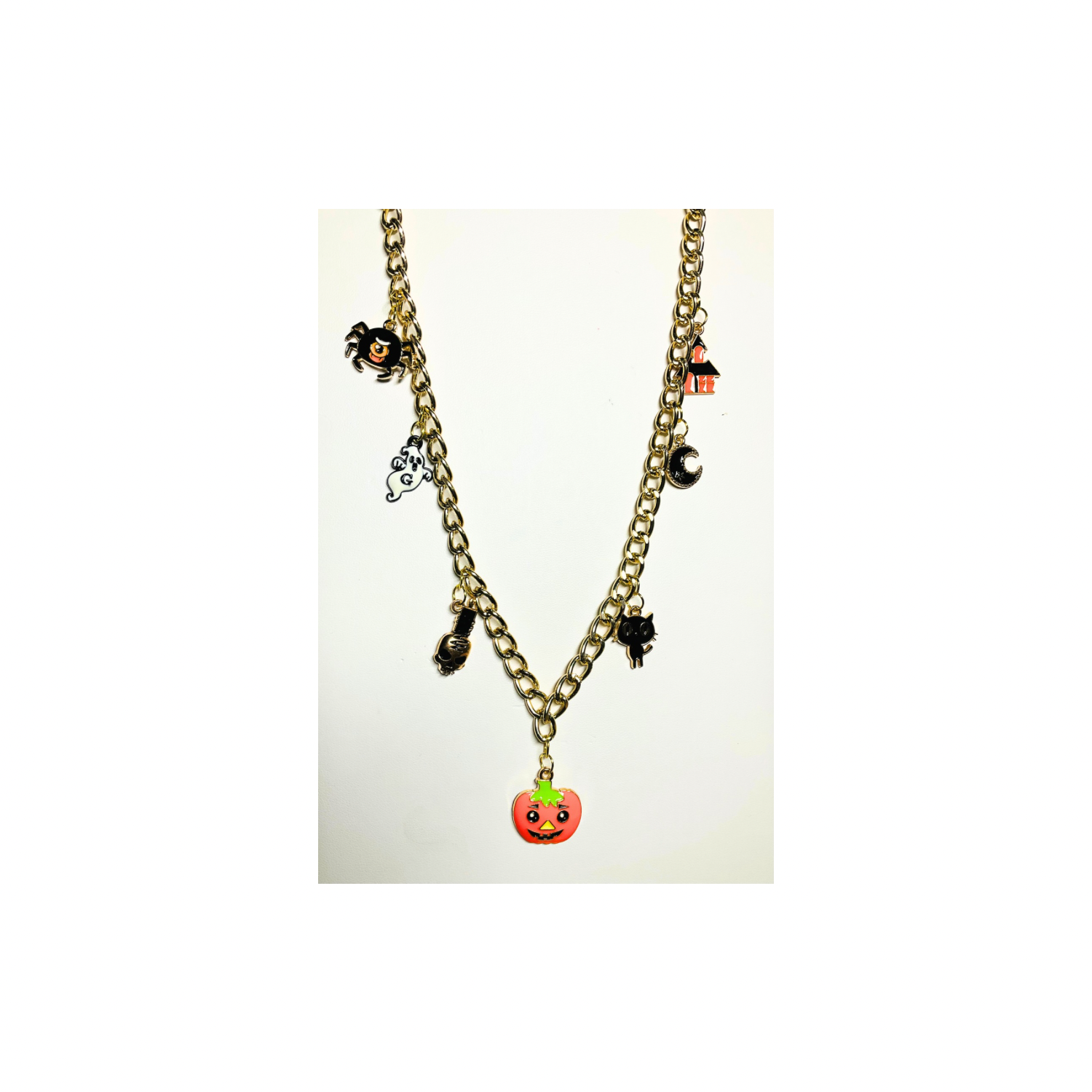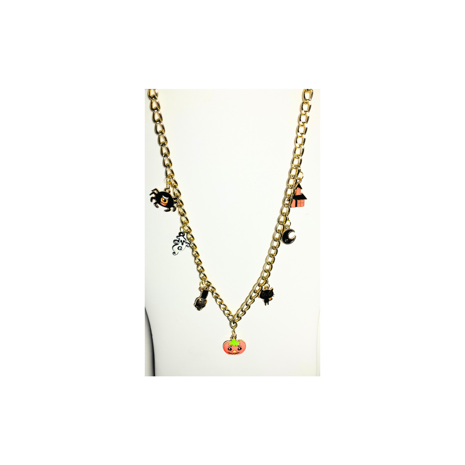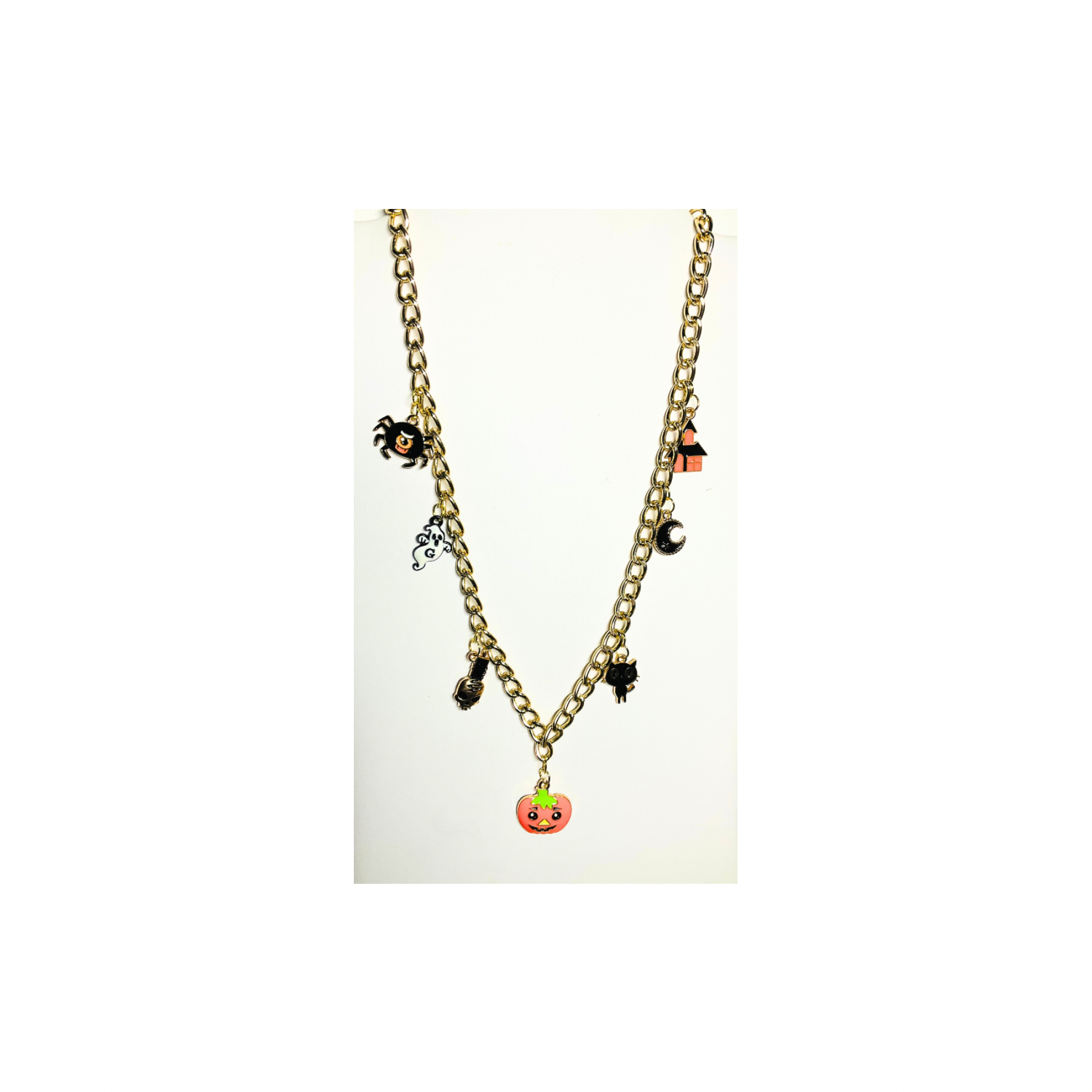 This necklace is a delightful addition to your Halloween collection, combining charm and style. Perfect for those looking to add a festive touch to their outfit.