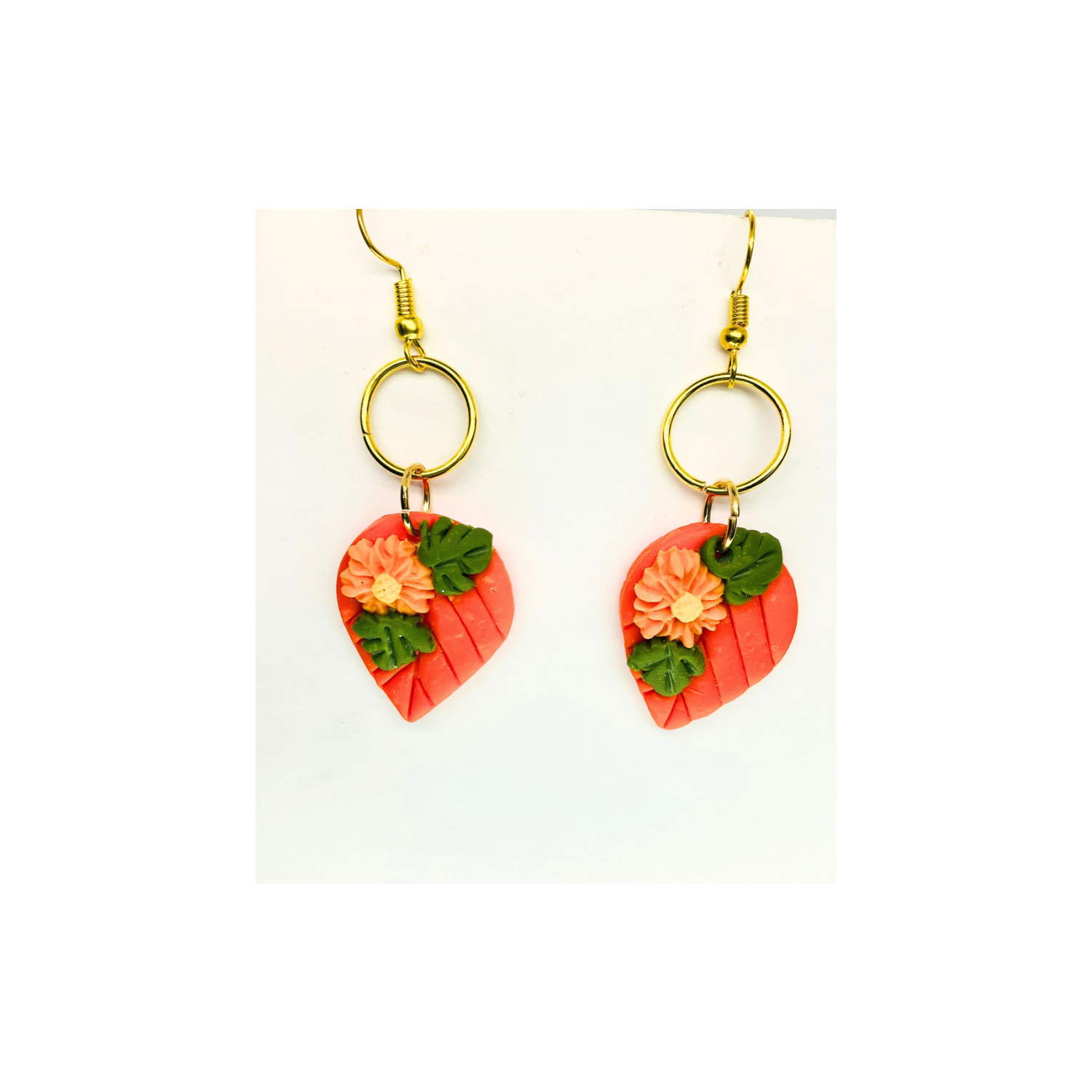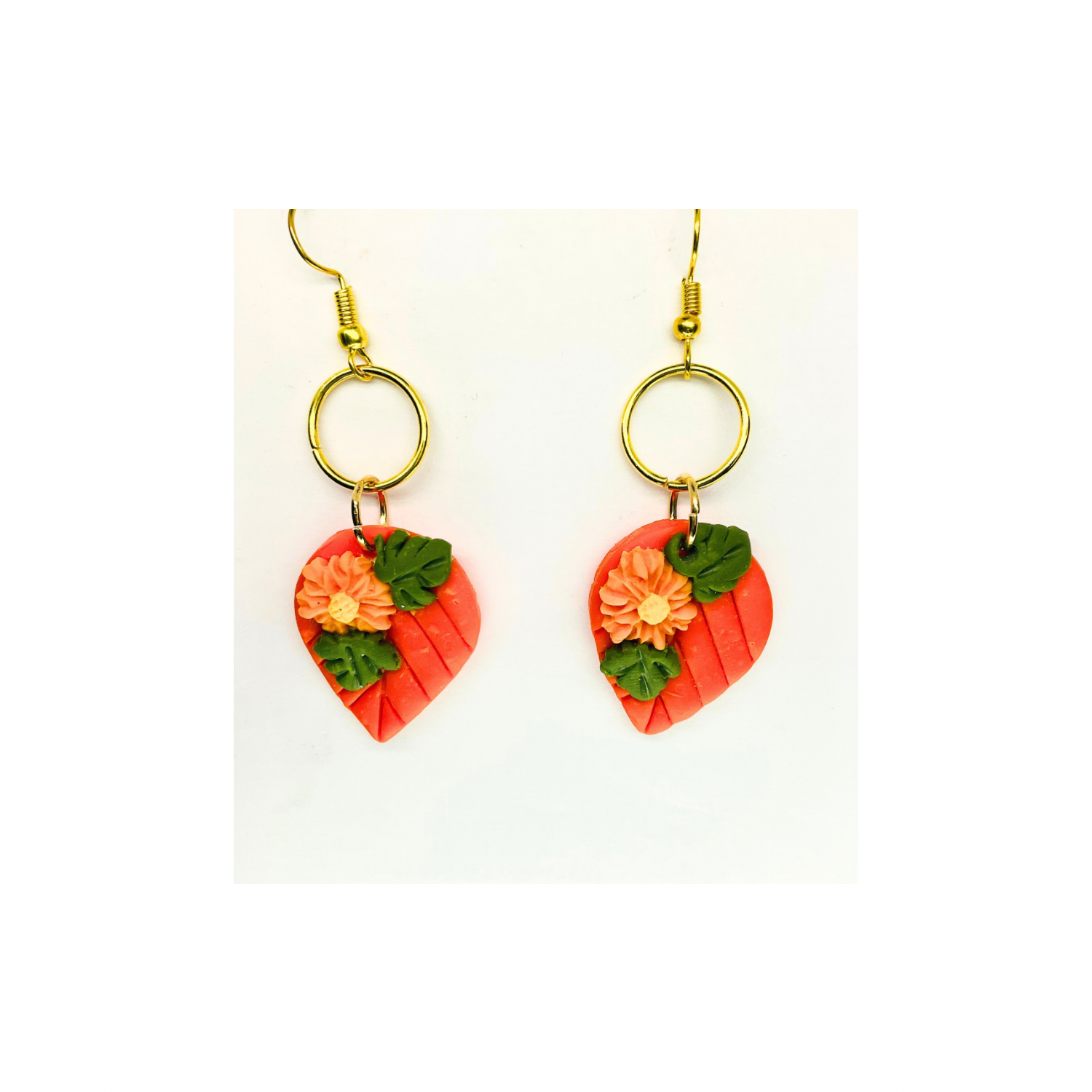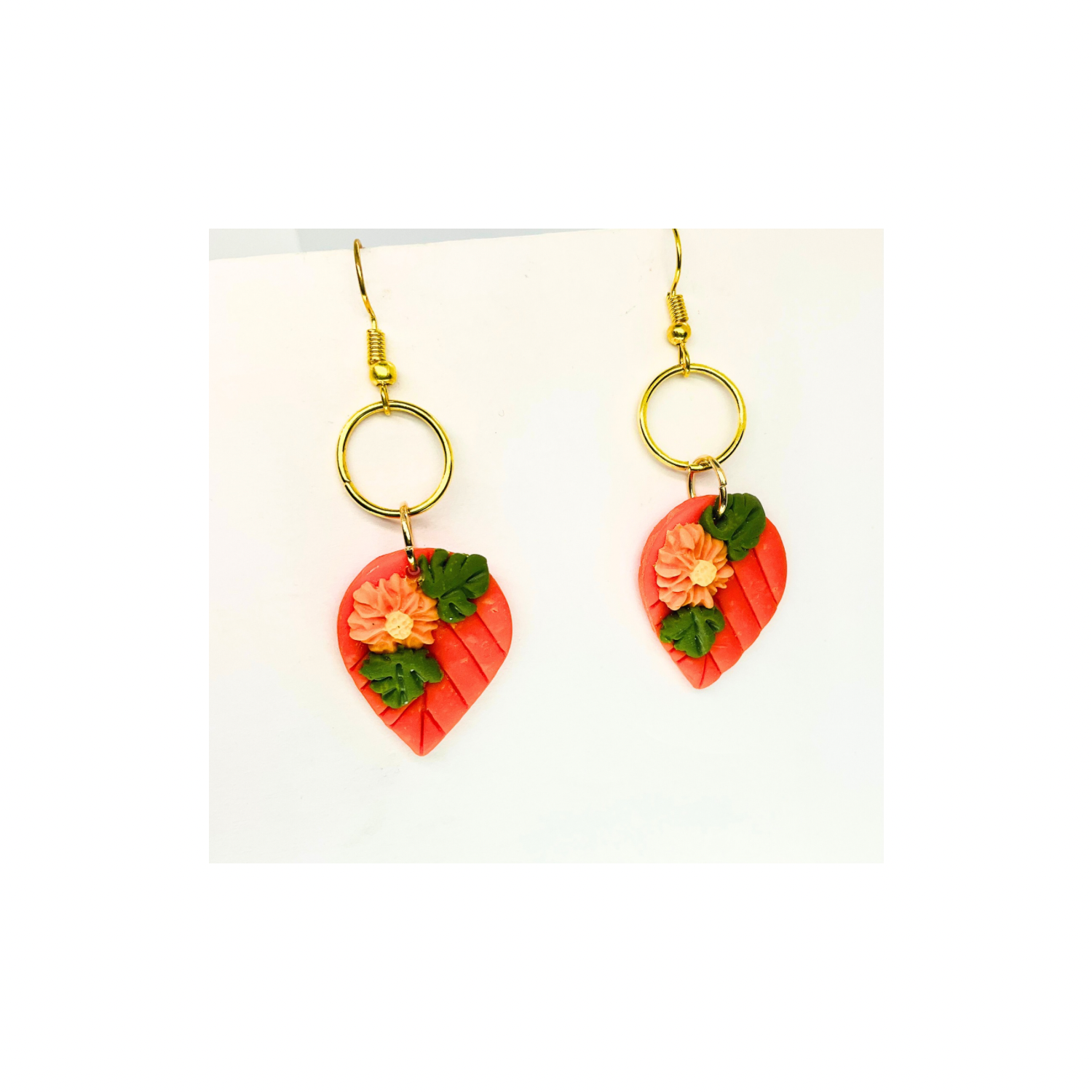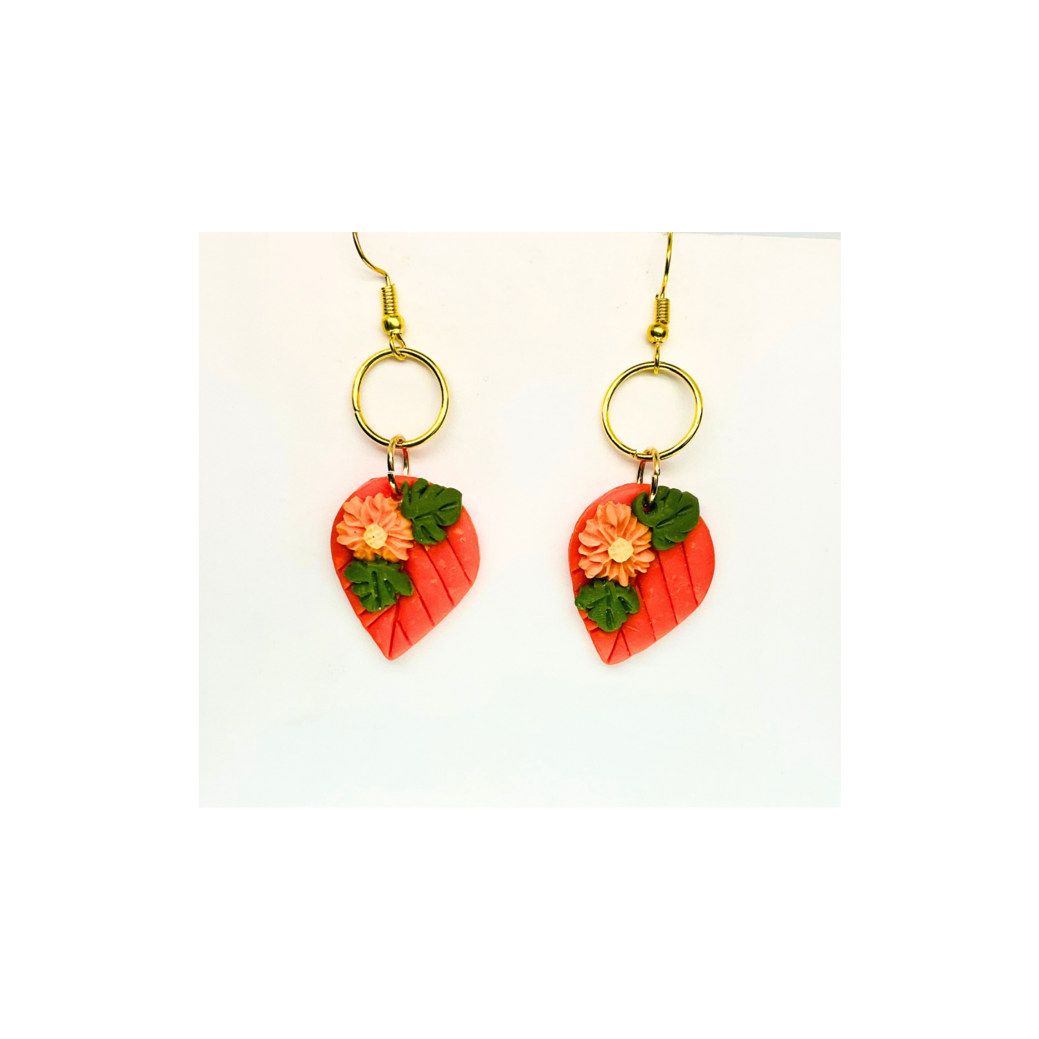 - Image shows a pair of orange leaf-shaped earrings hanging elegantly.