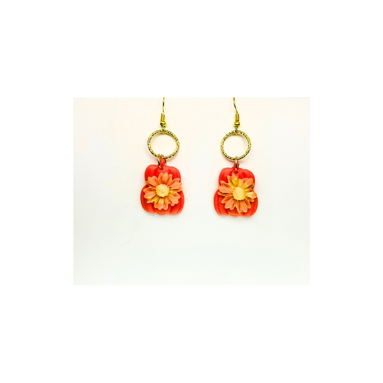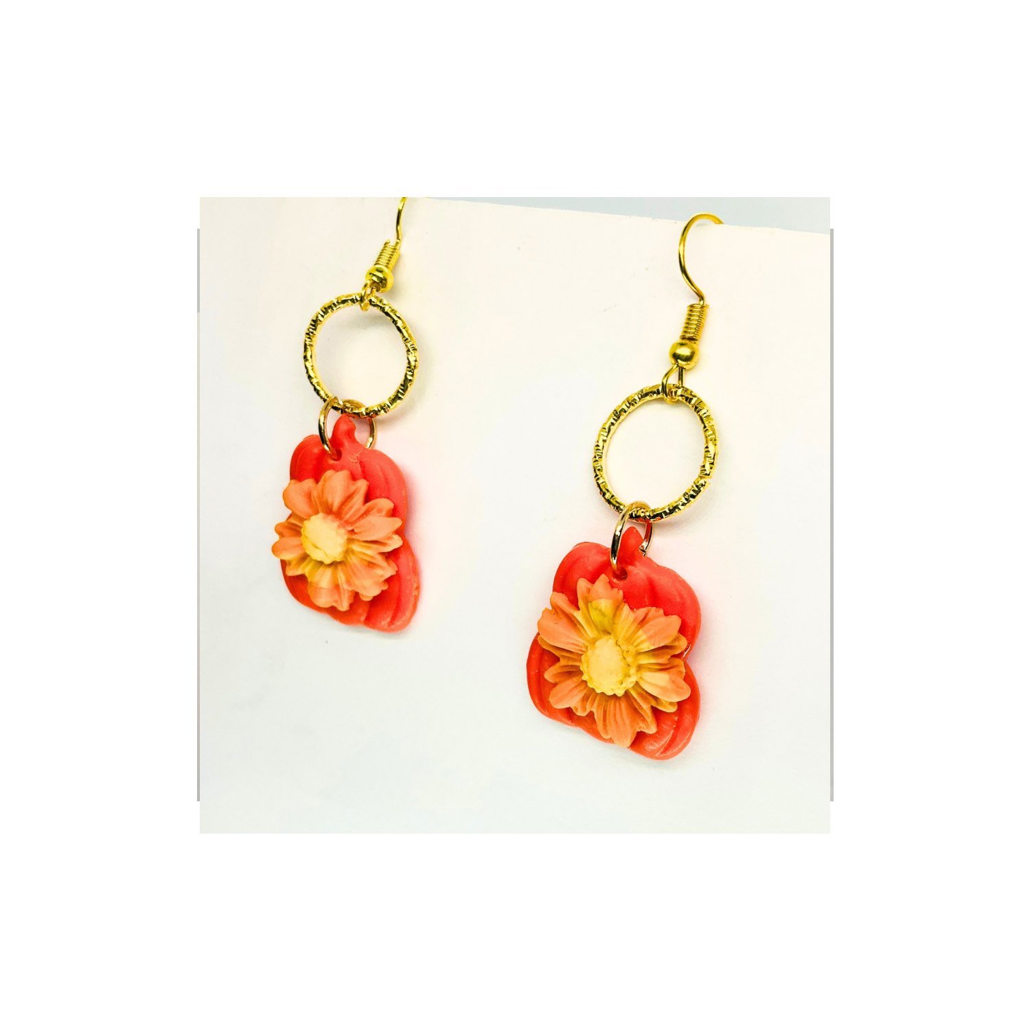 - The earring features a large flower dangle, adding a unique flair to your look. It complements the orange stacked pumpkins, creating a cohesive and stylish ensemble. Ideal for those who love to express their love for fall through accessories.