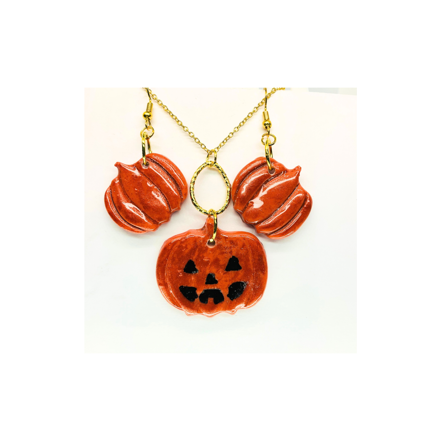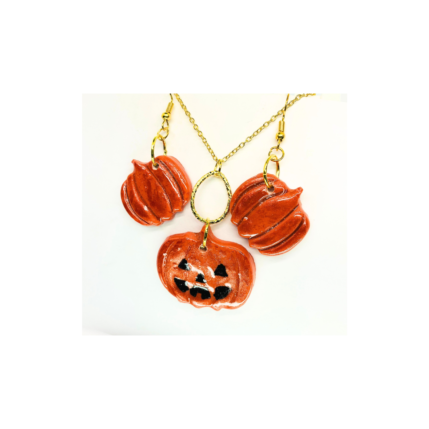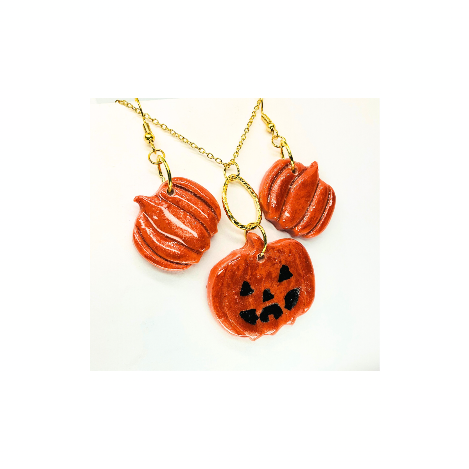 - Includes a pumpkin pendant and dangle earrings. - Ideal for autumn-themed events. - Enhance your style effortlessly with this set. - No additional specifications or materials are provided.