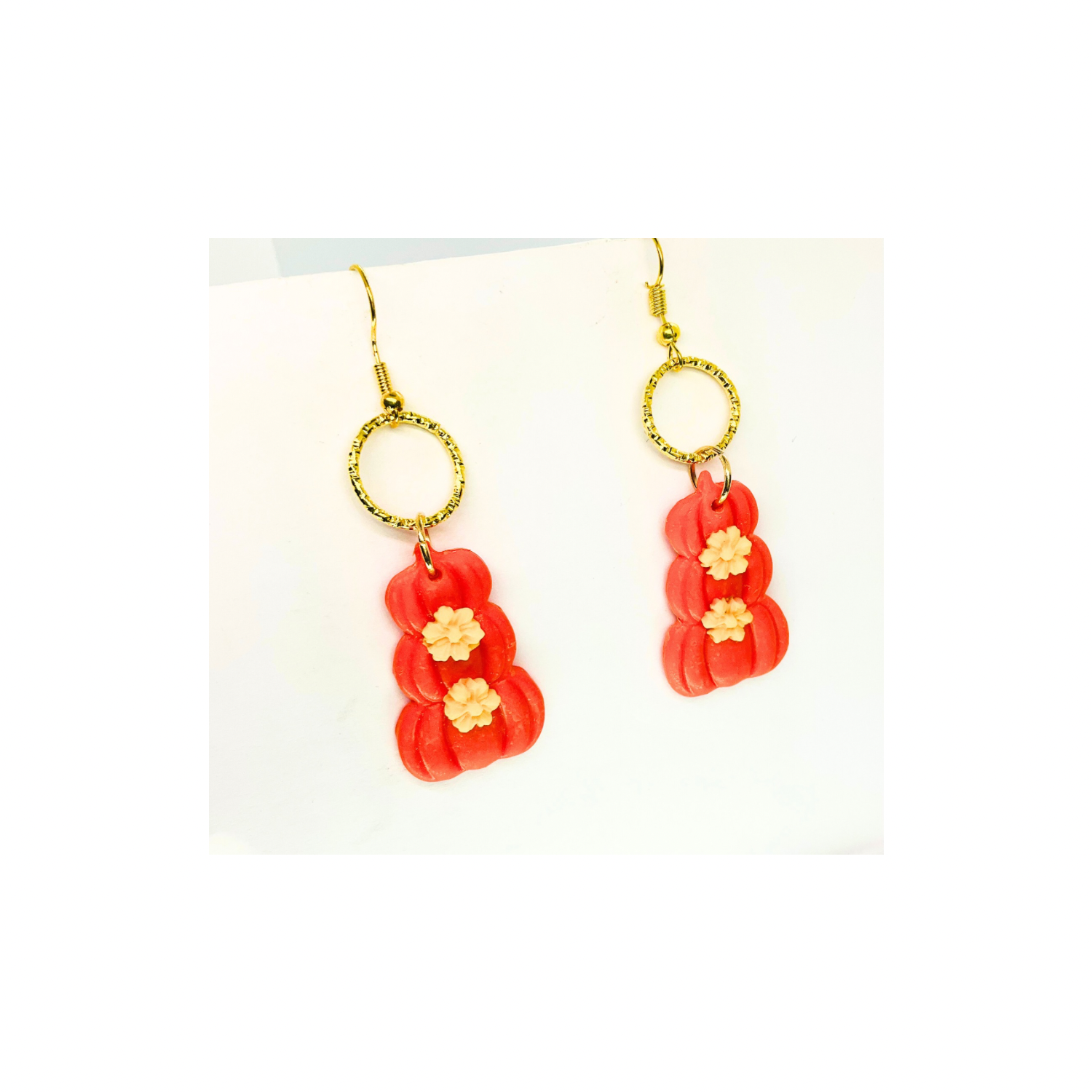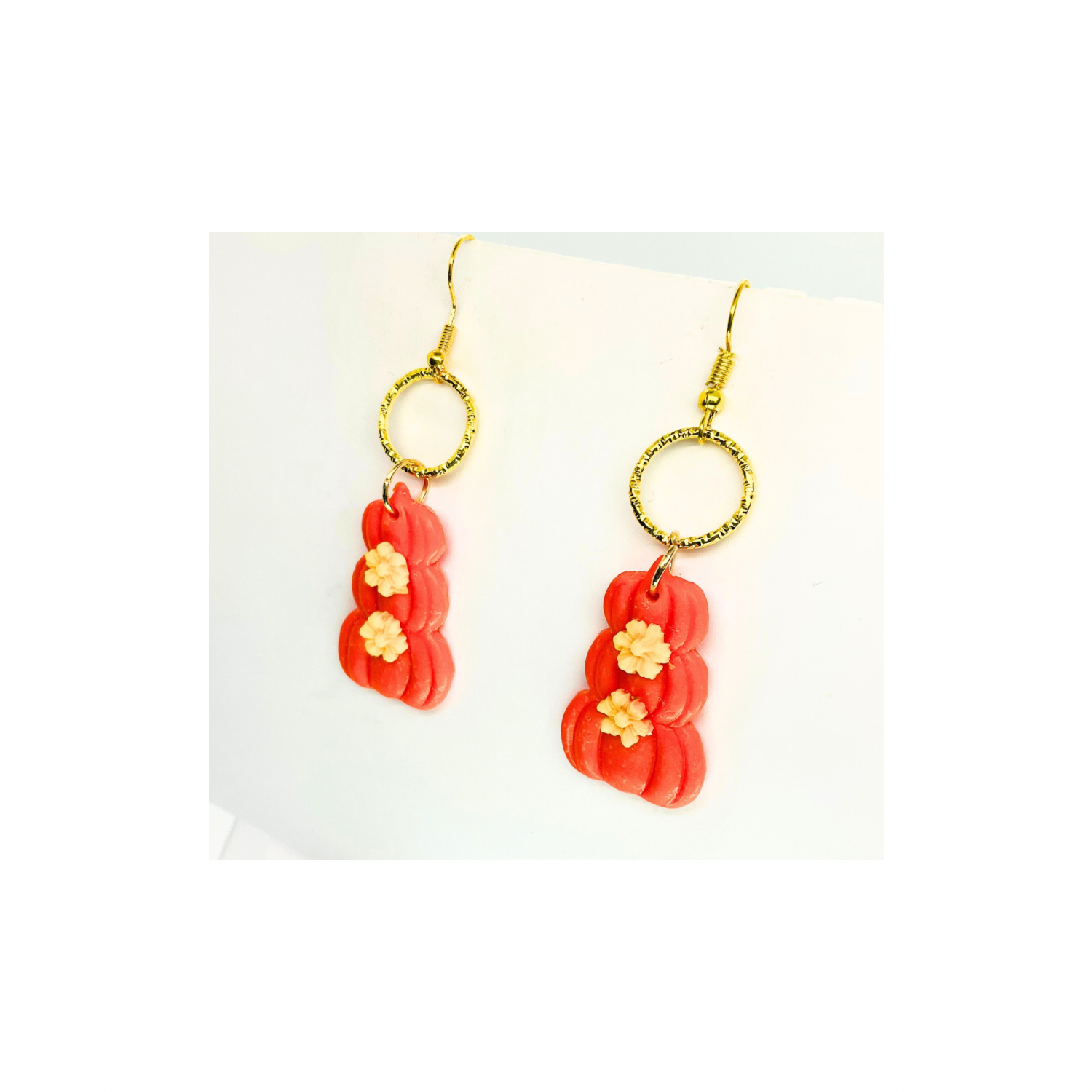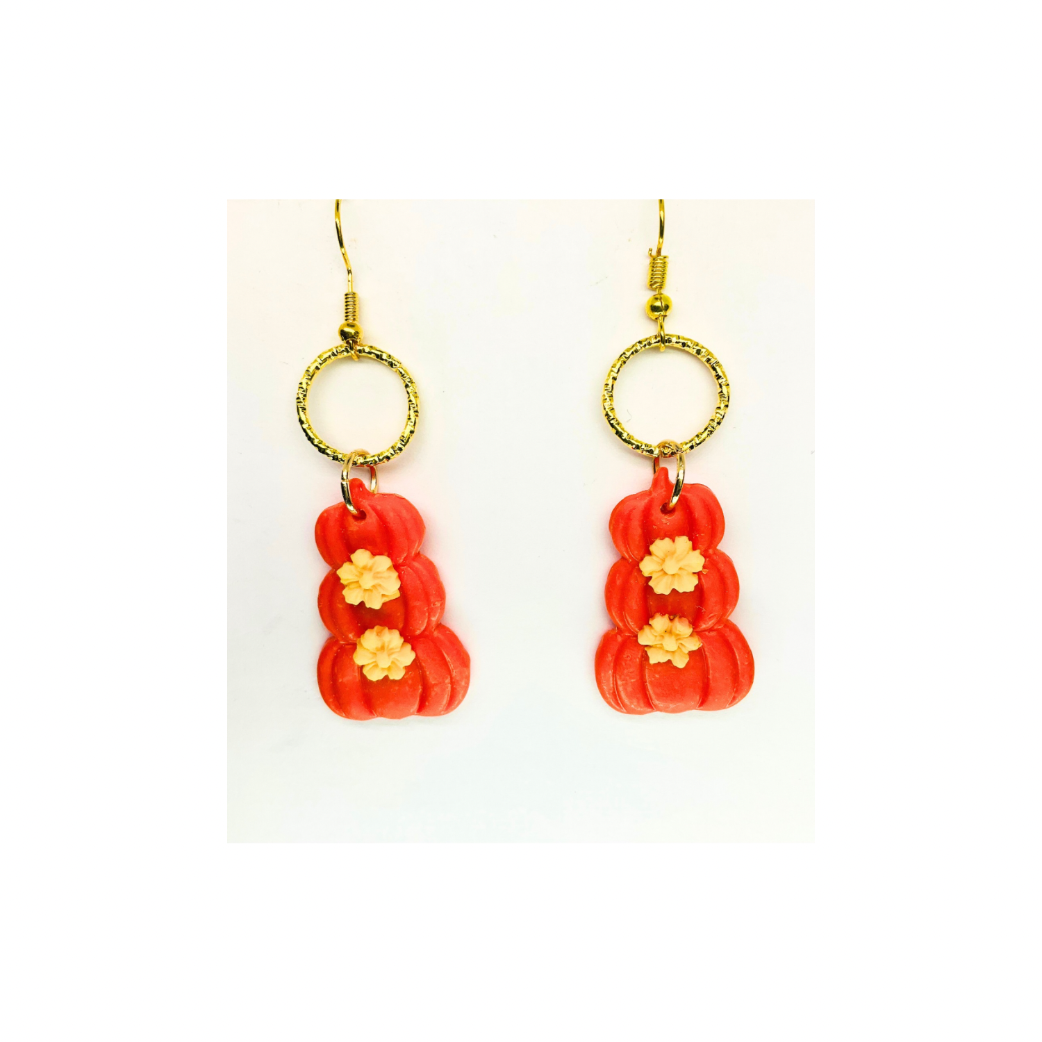 The earrings showcase a stacked pumpkin design, making them a standout piece. The yellow flower dangle complements the orange, creating a harmonious look.