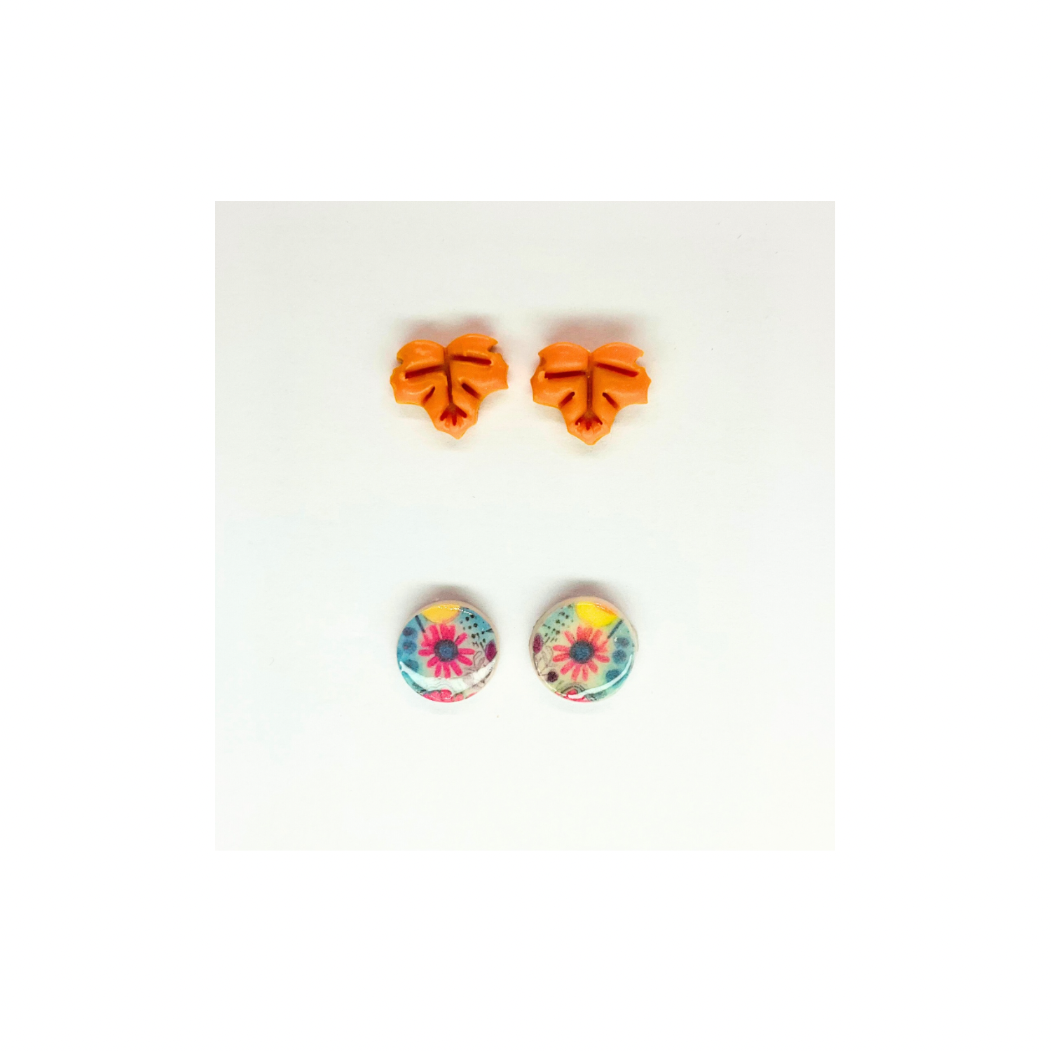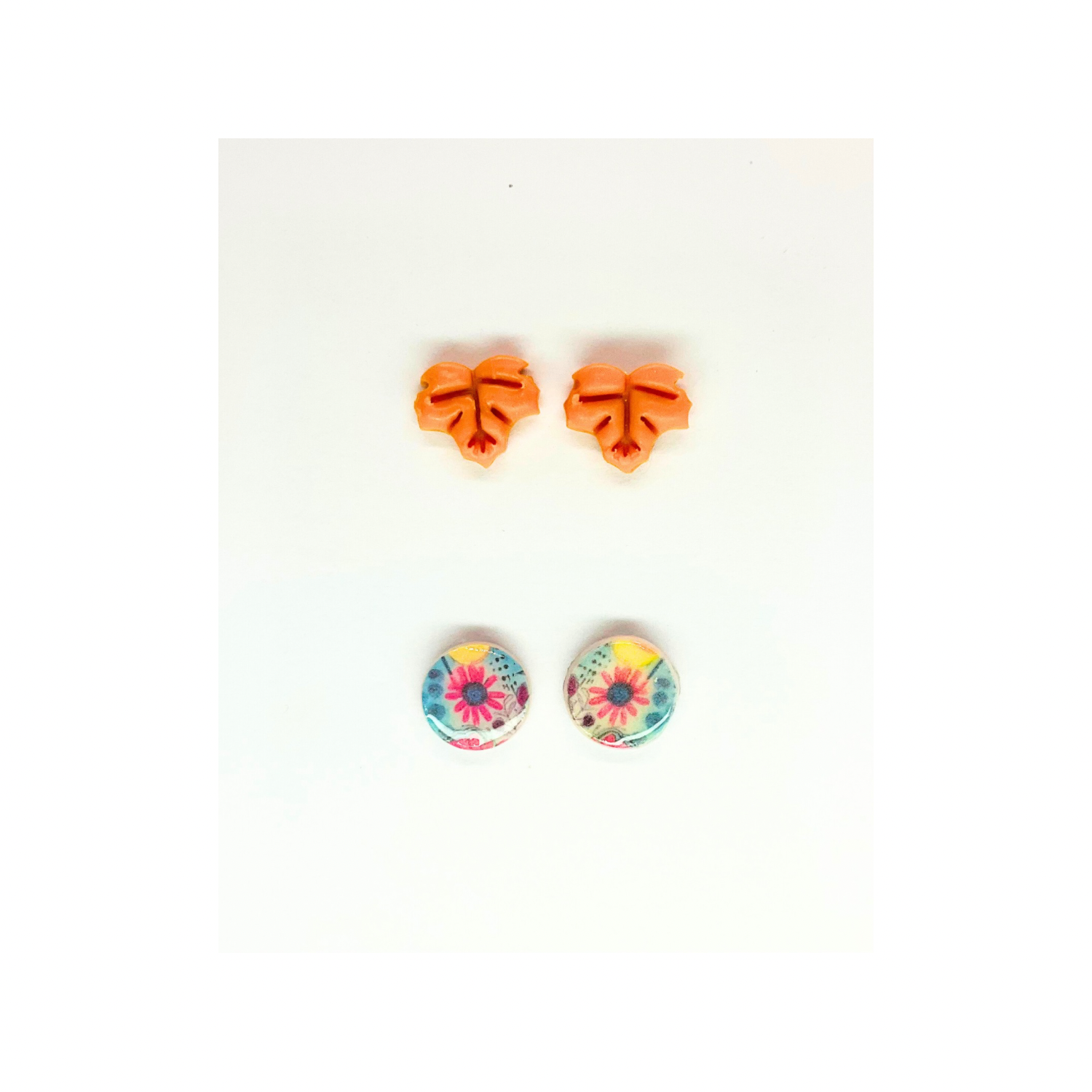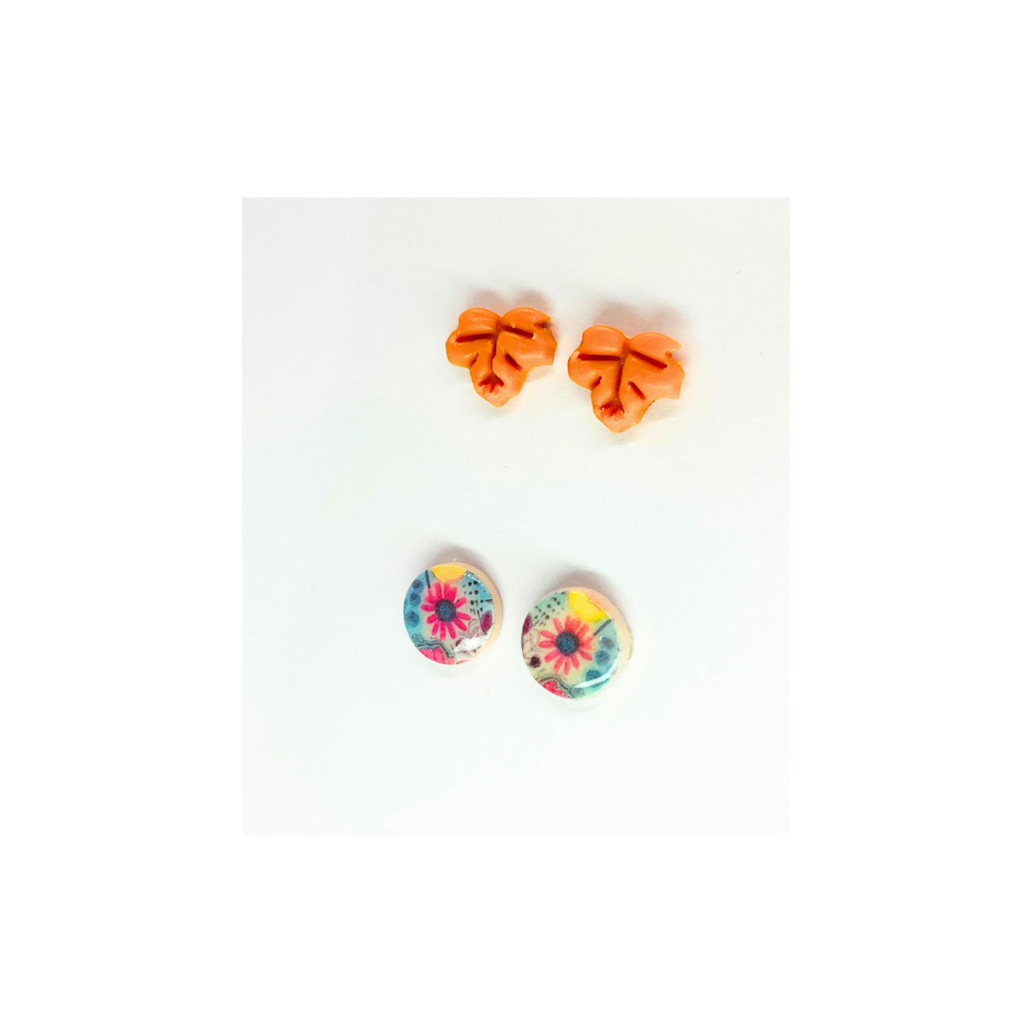 Embrace the autumn vibe with these charming earrings. The design features vibrant orange leaves and colorful floral motifs. Perfect for adding a touch of nature's beauty to your outfit. These stud earrings are a delightful choice for any occasion.