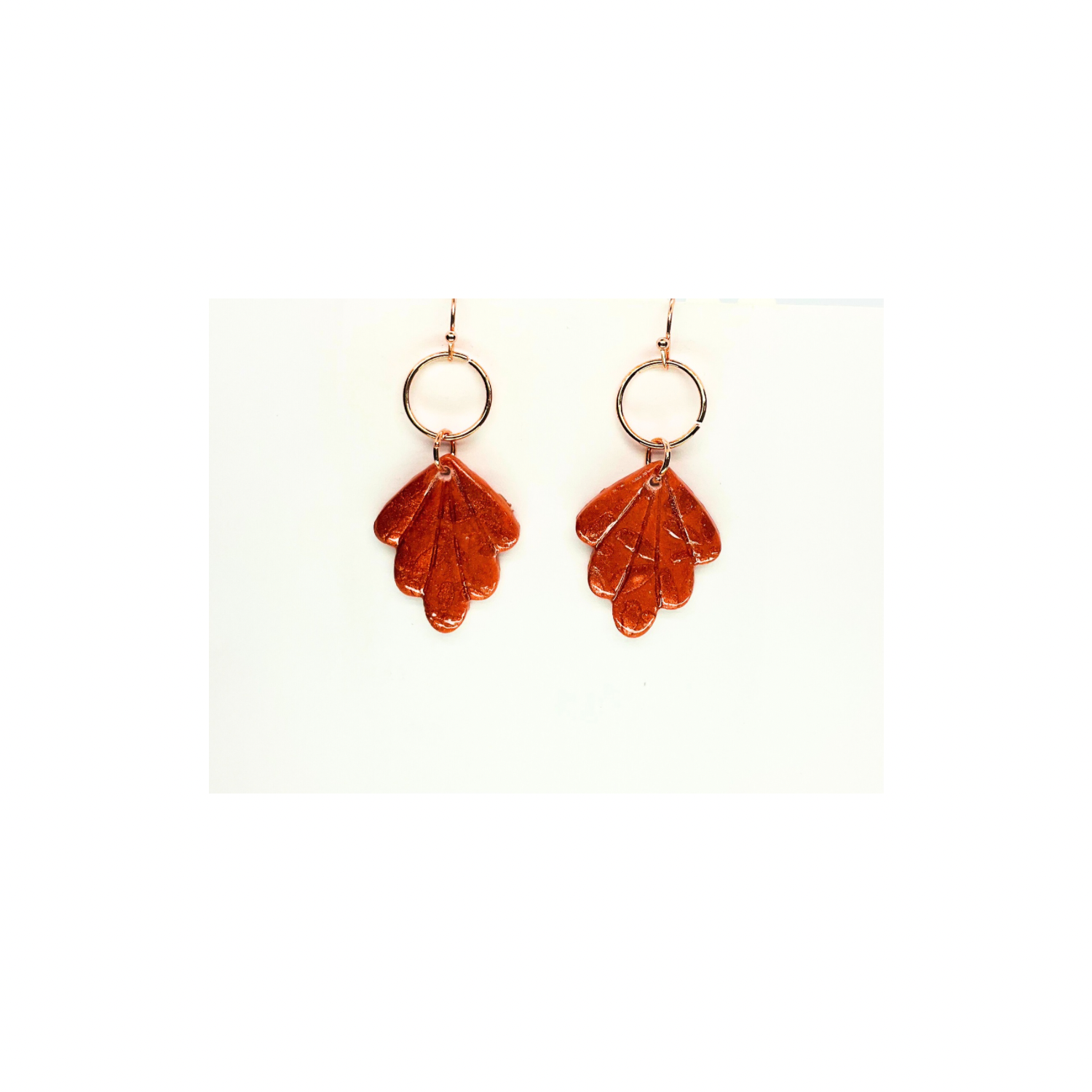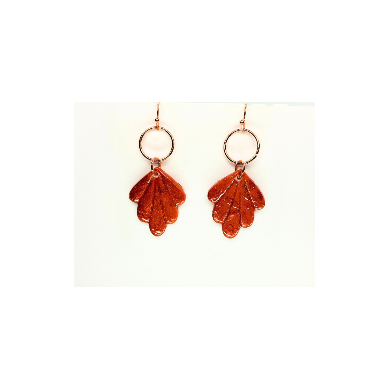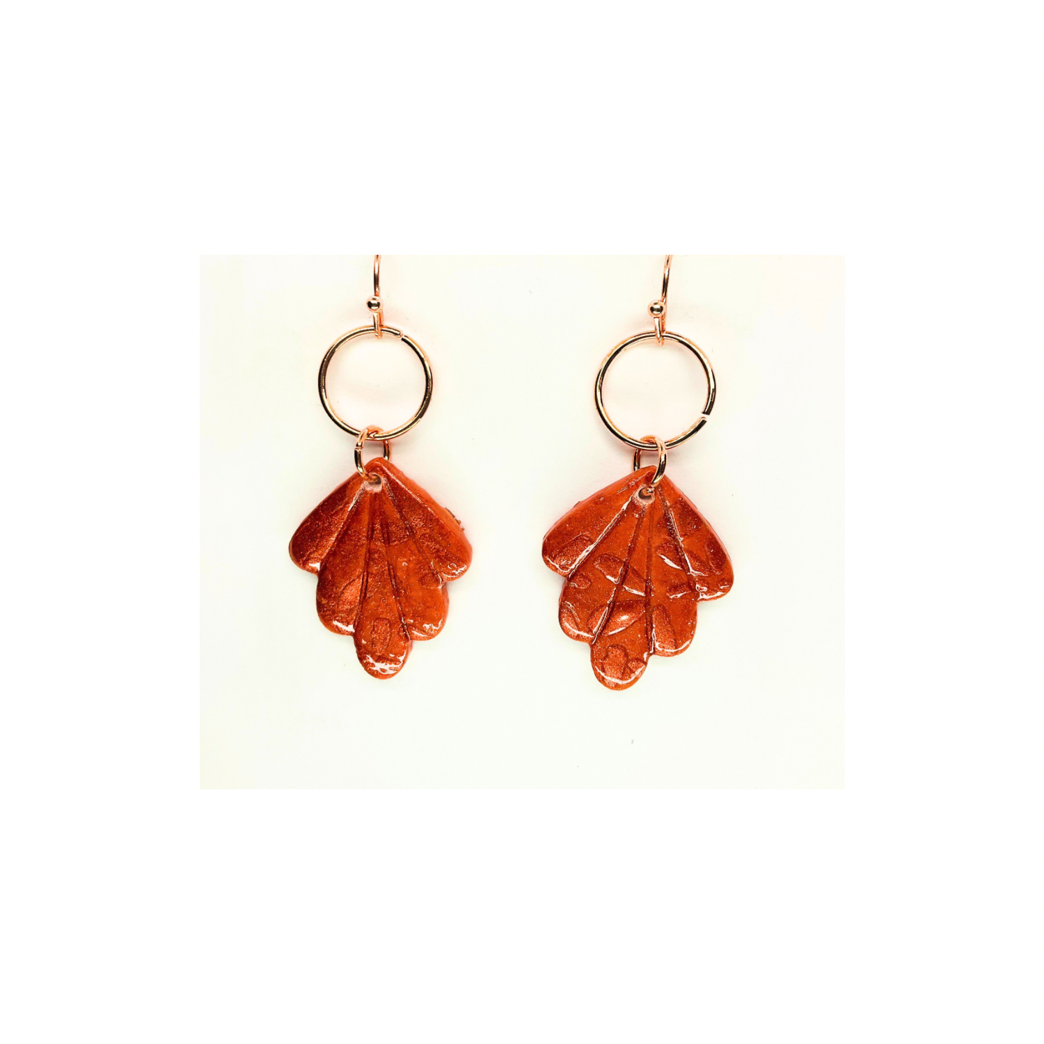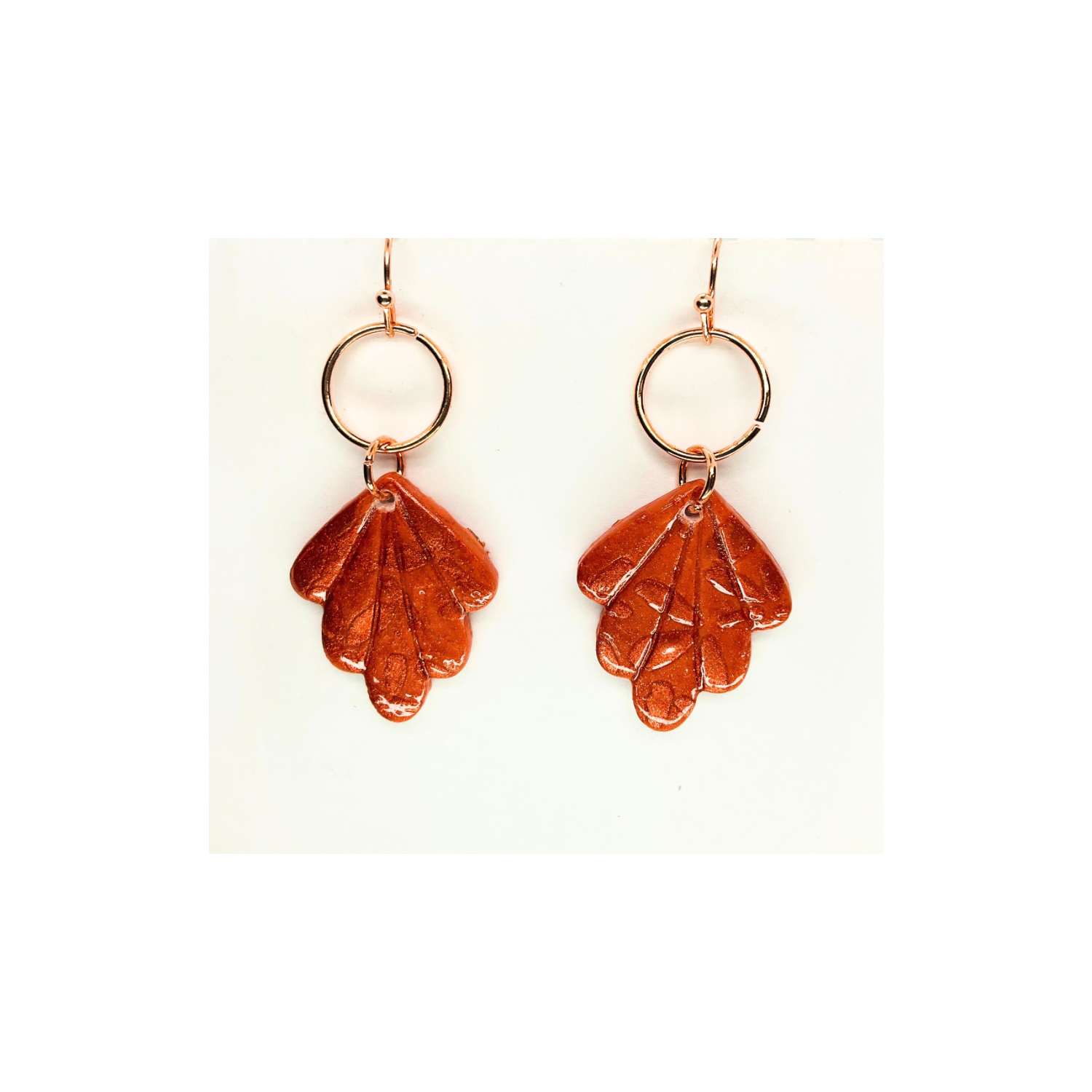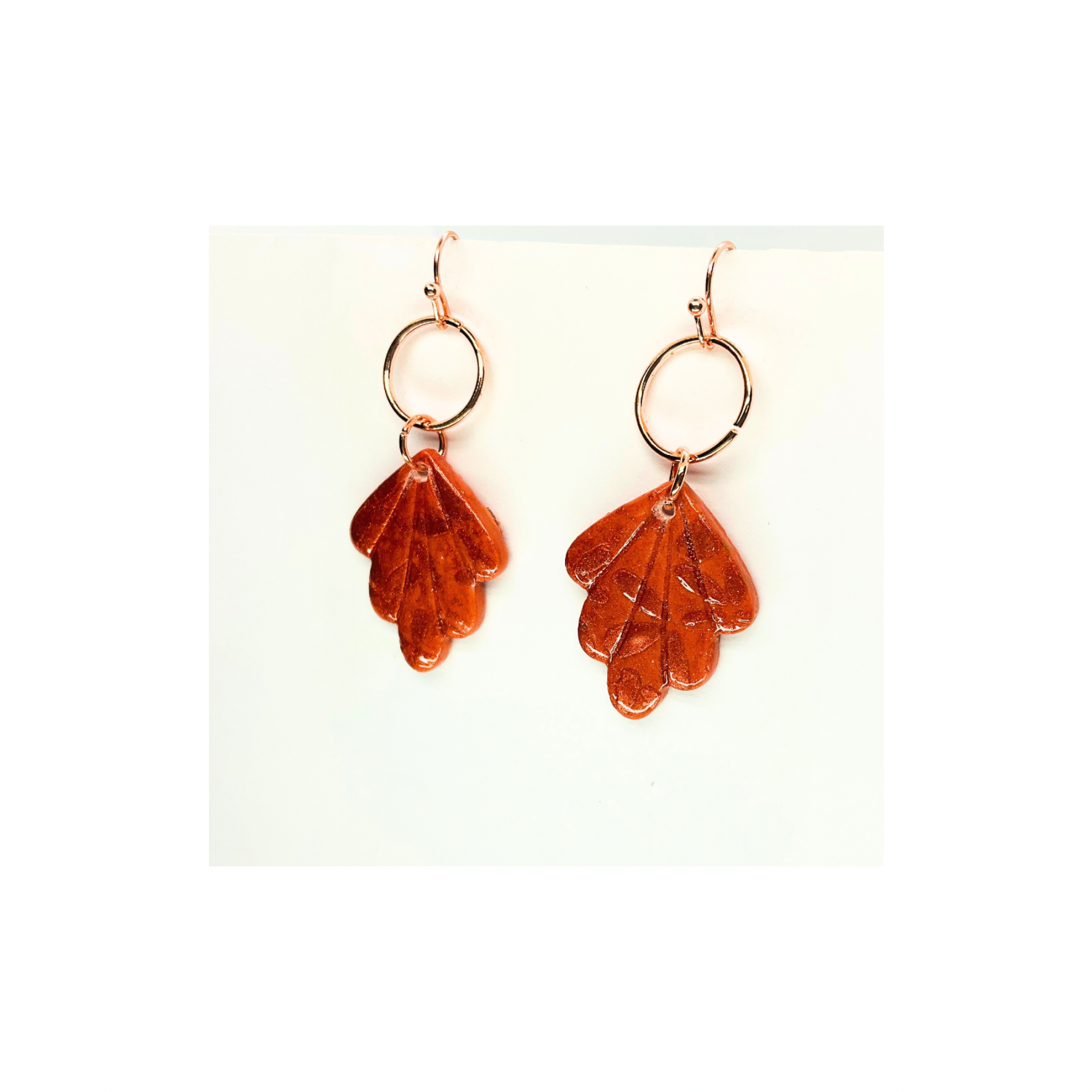 The earrings include a rose gold accent, adding a luxurious feel to the overall design. This subtle detail elevates the earrings, making them suitable for various occasions. The combination of the orange leaf shape and rose gold creates a harmonious and stylish accessory.