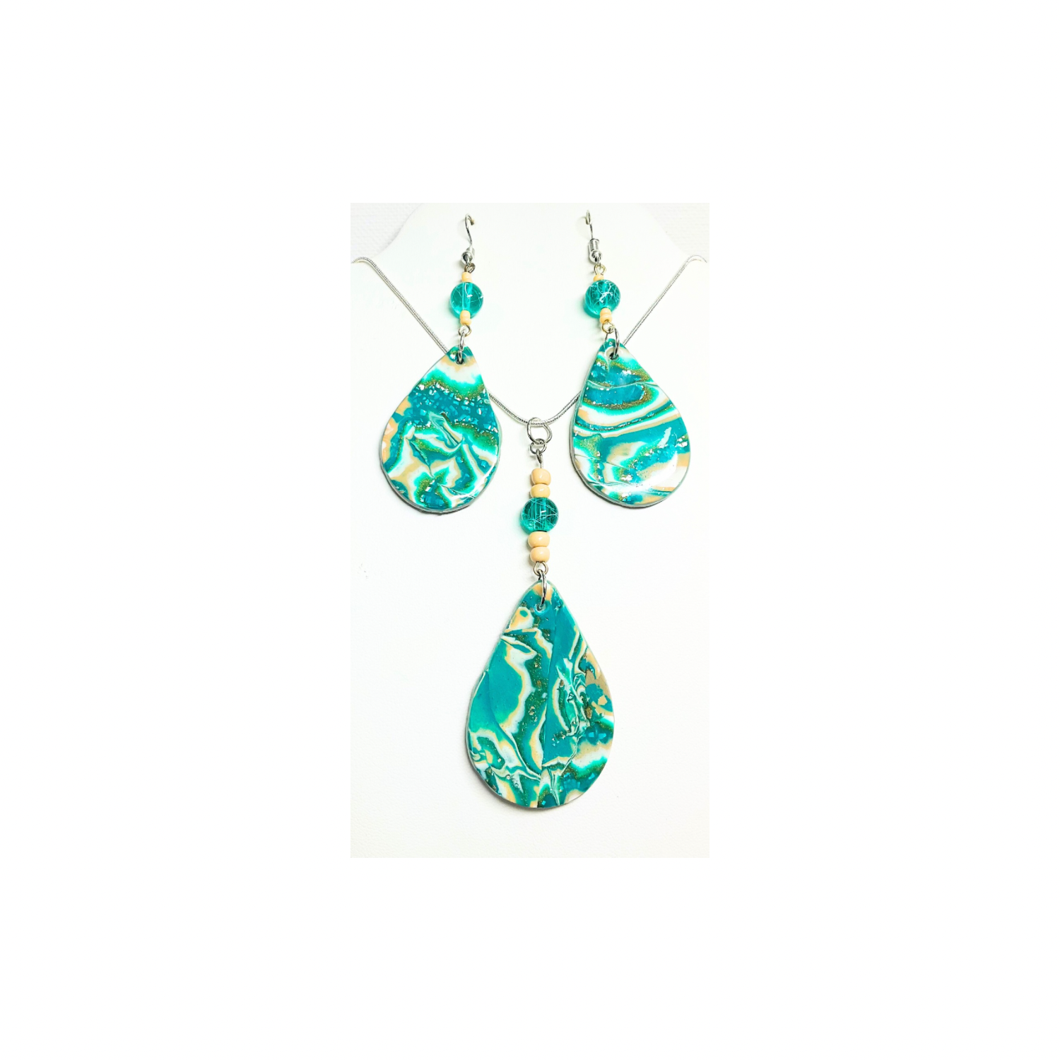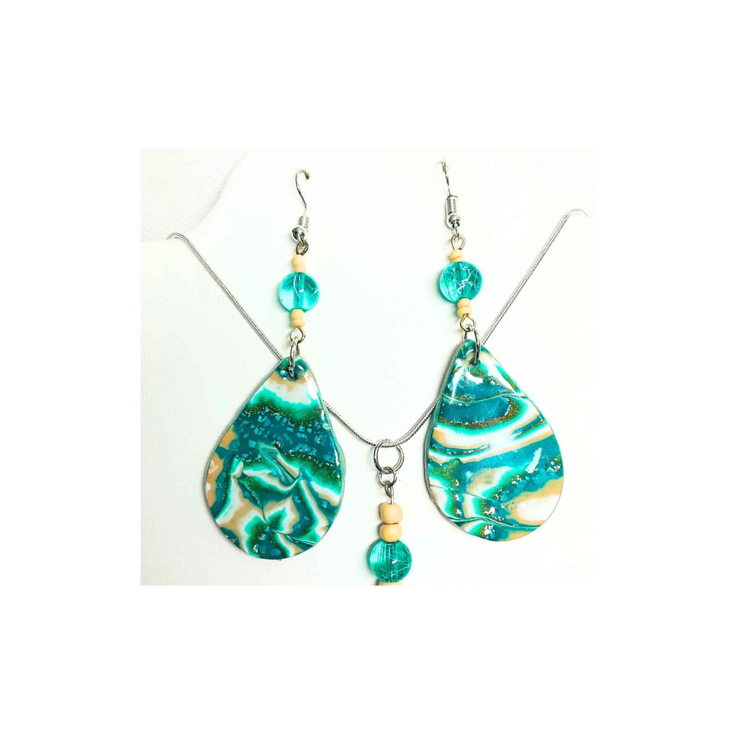 Faux oyster turquoise look with polymer clay and added beading. This set is a unique design, perfect for those who appreciate handcrafted items. Each piece is made one at a time, ensuring uniqueness. No two sets are exactly alike. Enjoy the charm of handmade artistry.