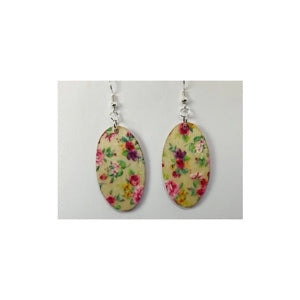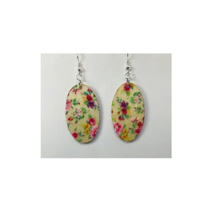 Floral lightweight wood dangle earring made with wood cutout and floral decal, and finished with resin. The floral set has a silver earwire.