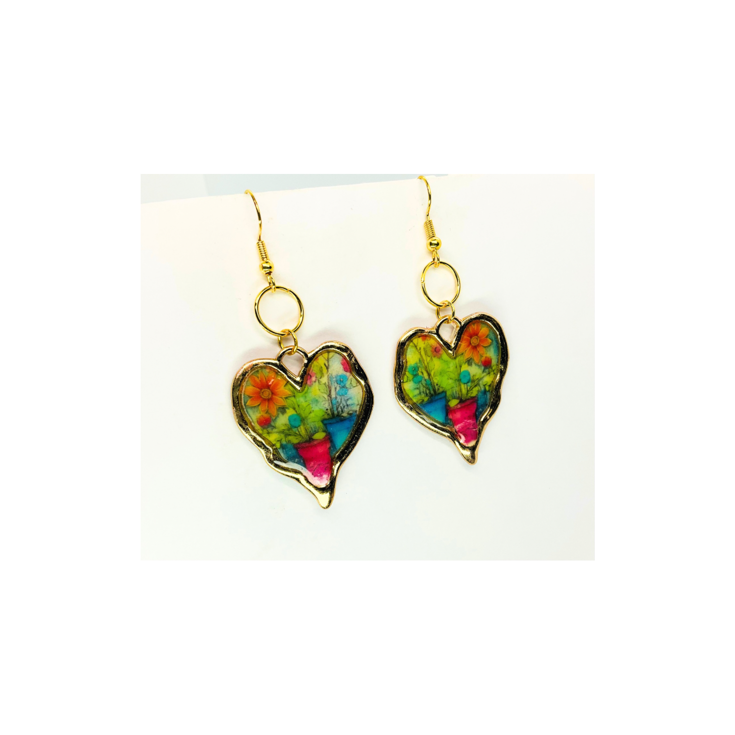 French Garden Collection Gold Heart Dangle Earrings with Vibrant Multicolor Design and Gold Tone Hooks
