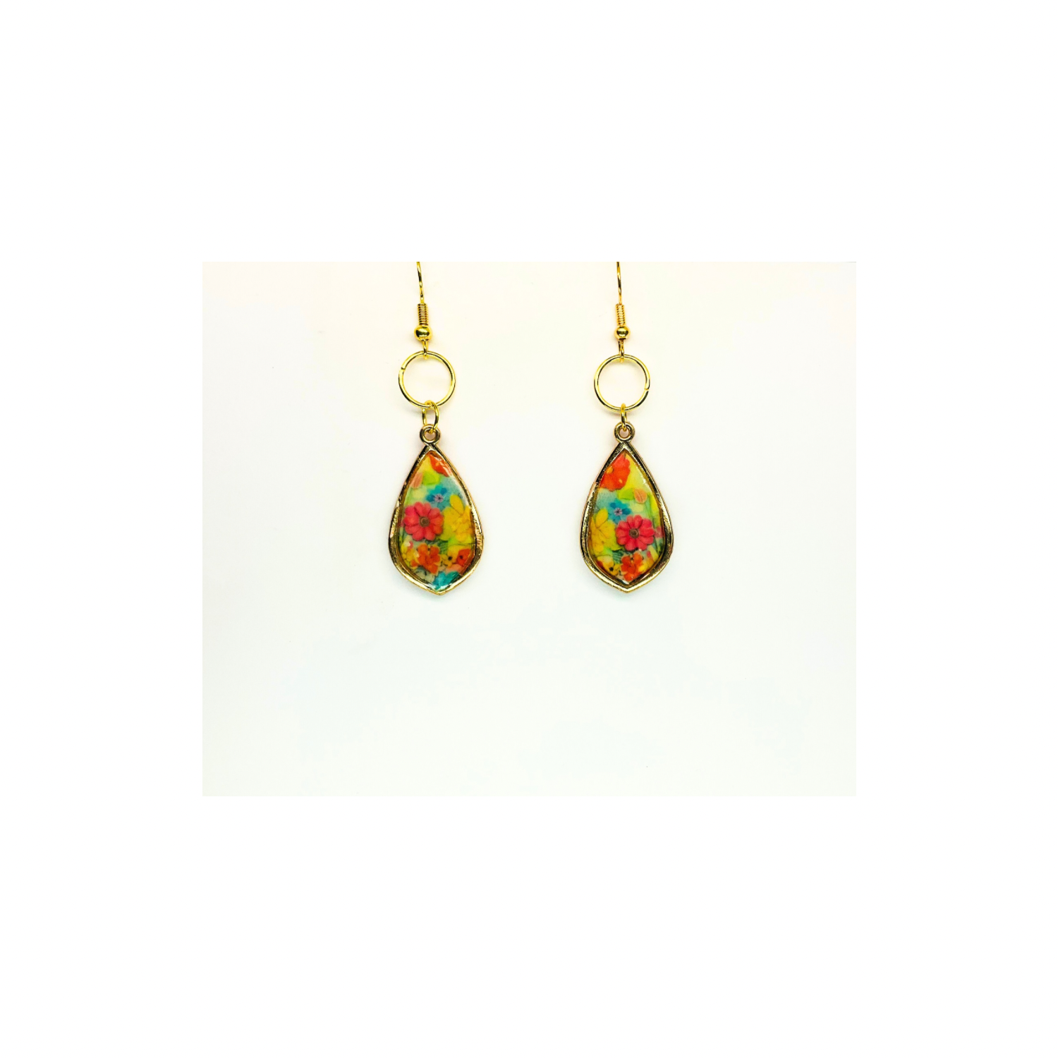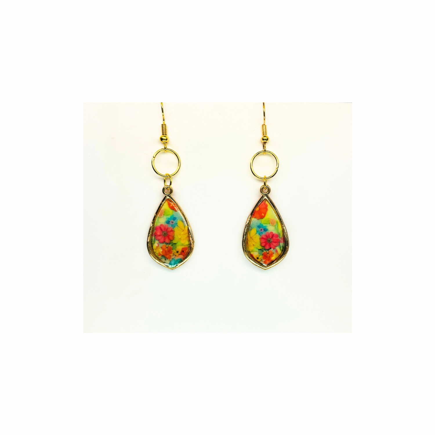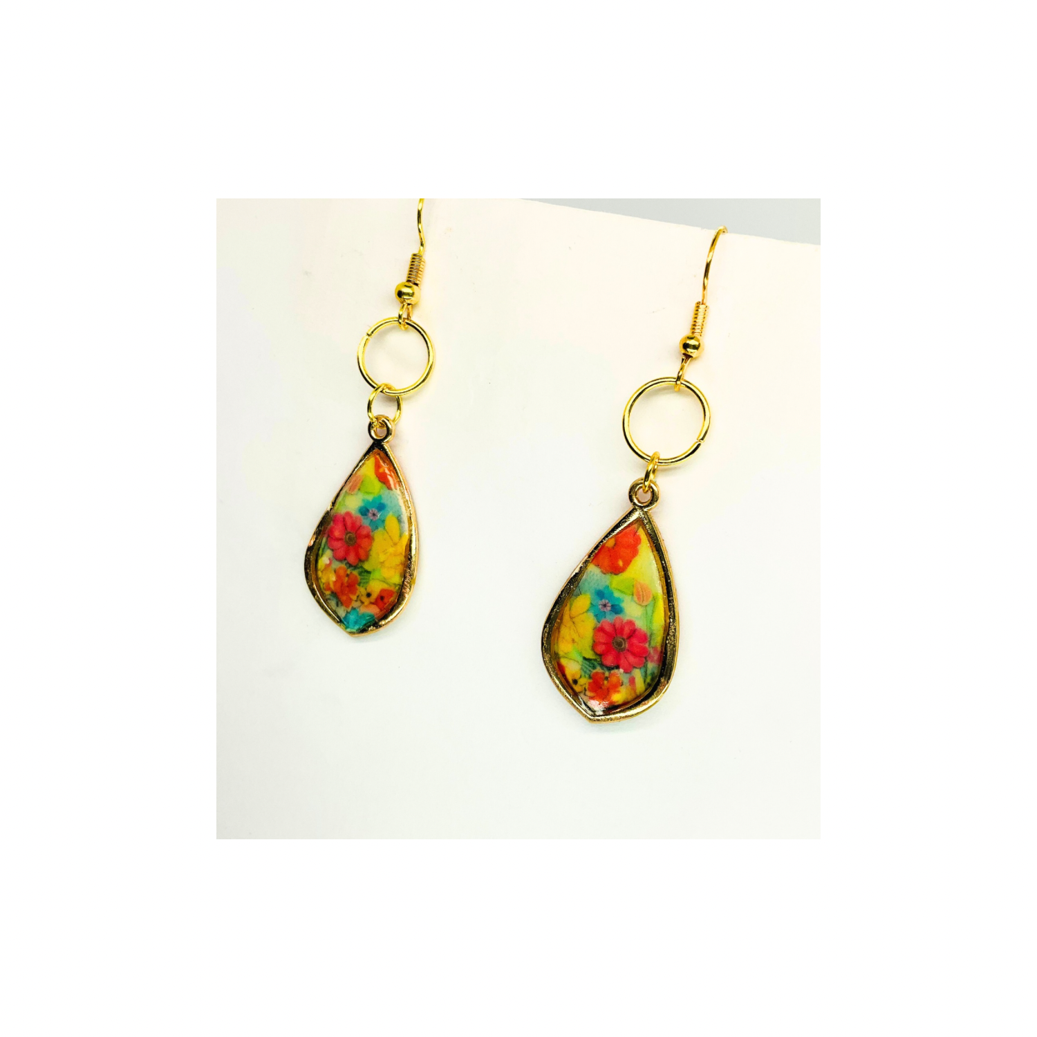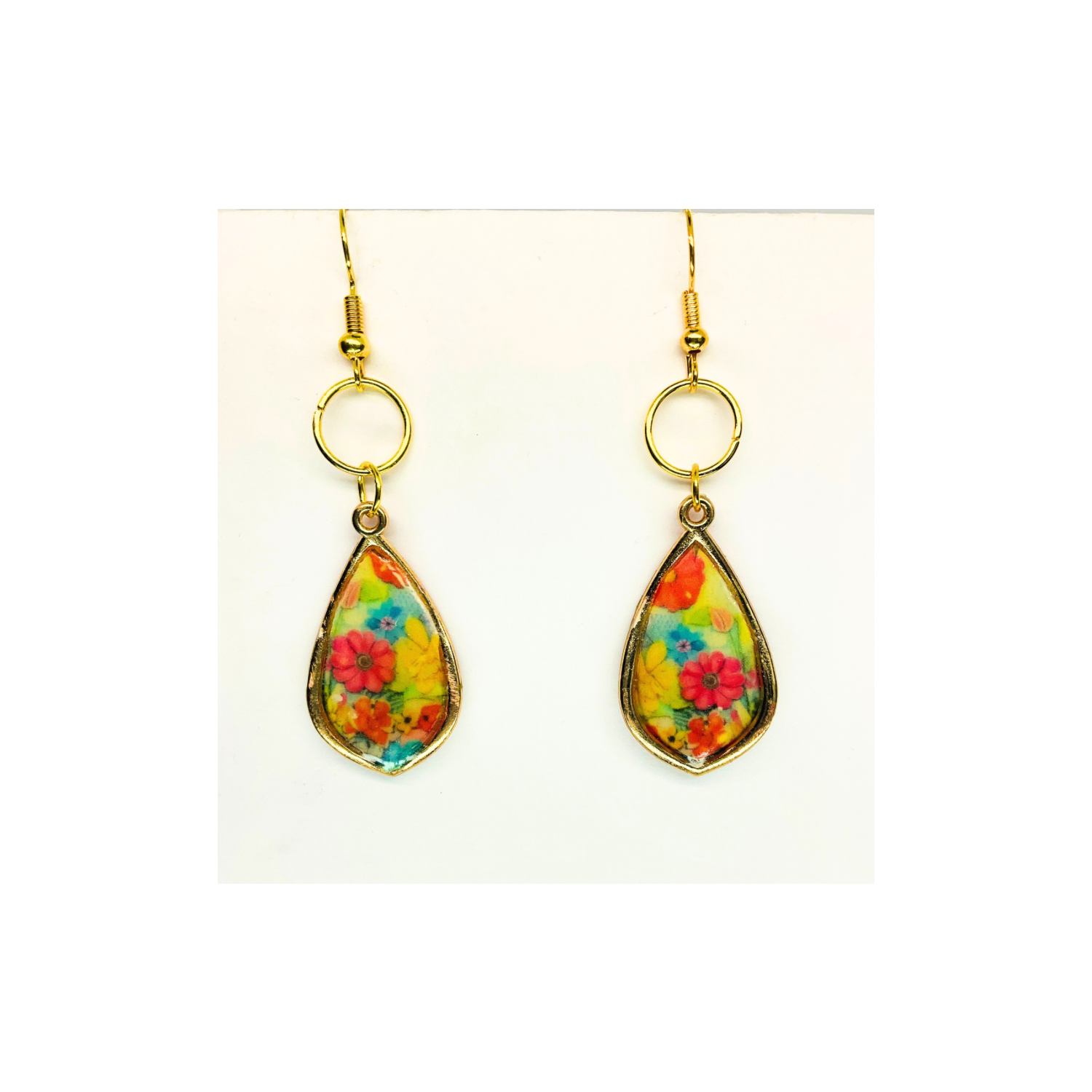 French Garden Collection Gold Teardrop Floral Dangle Earring with Vibrant Multicolor Flowers and Elegant Gold Finish