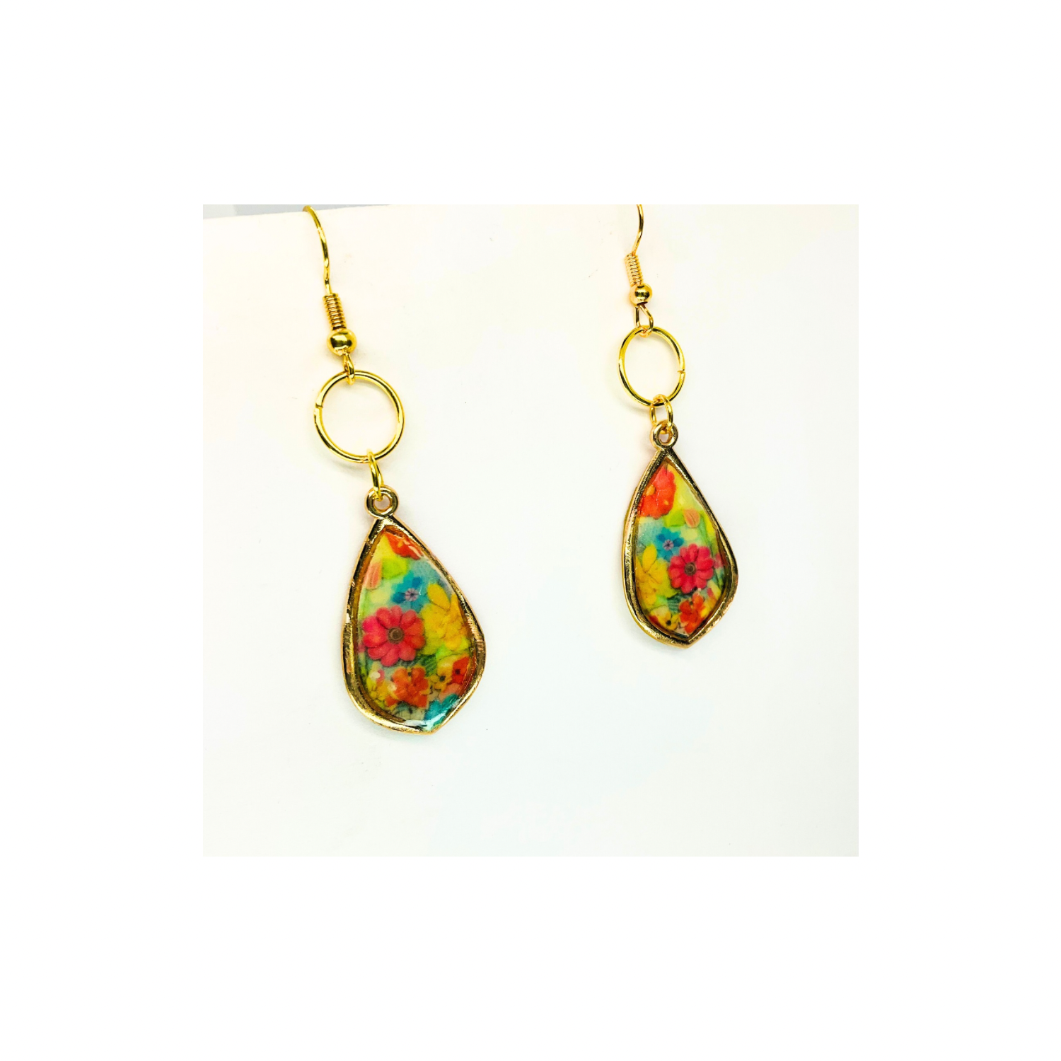 ✨ Elegant Design: The Gold Teardrop Floral Dangle Earring features vibrant multicolor flowers. This piece boasts an elegant gold finish, enhancing its visual appeal. Perfect for those who appreciate floral motifs in their jewelry.