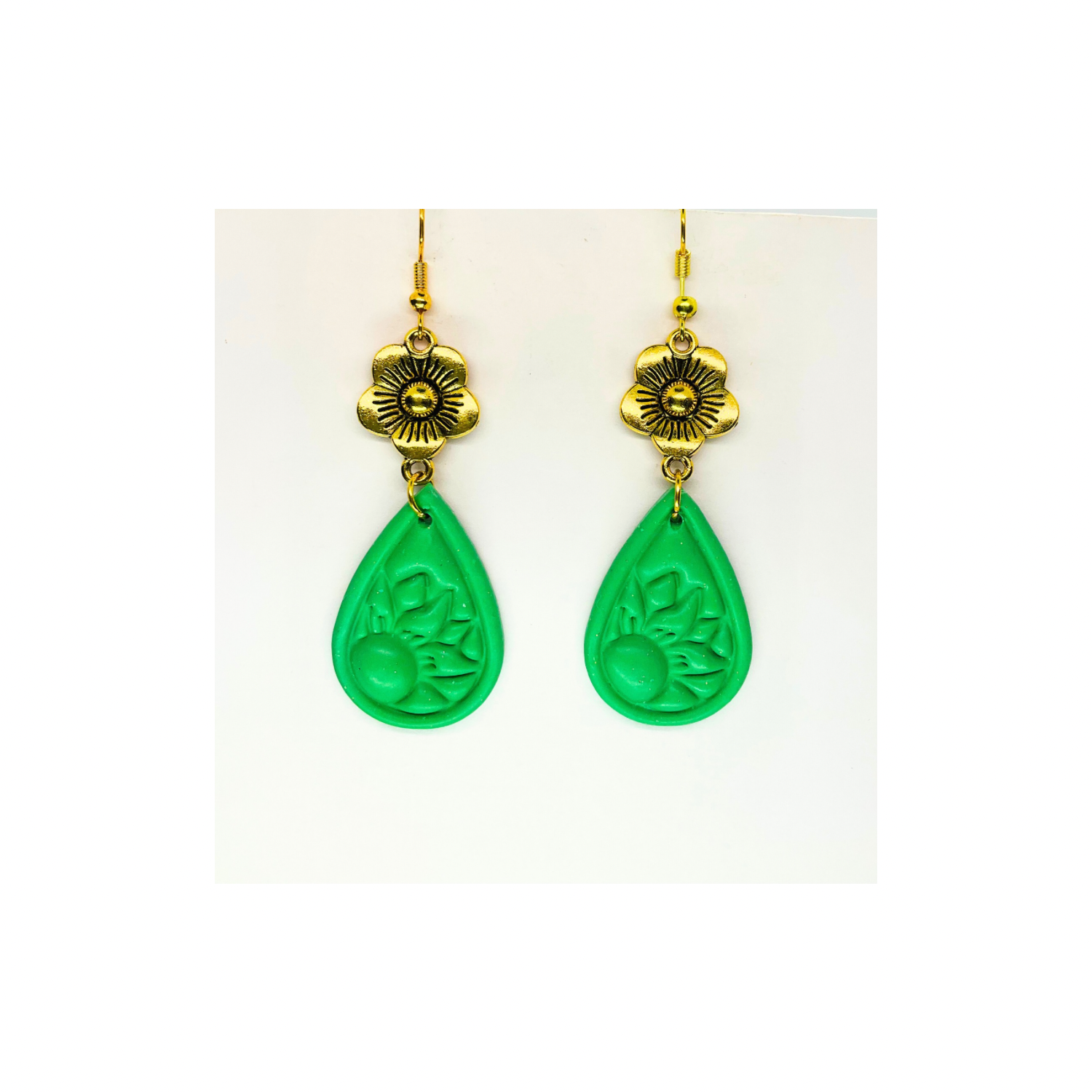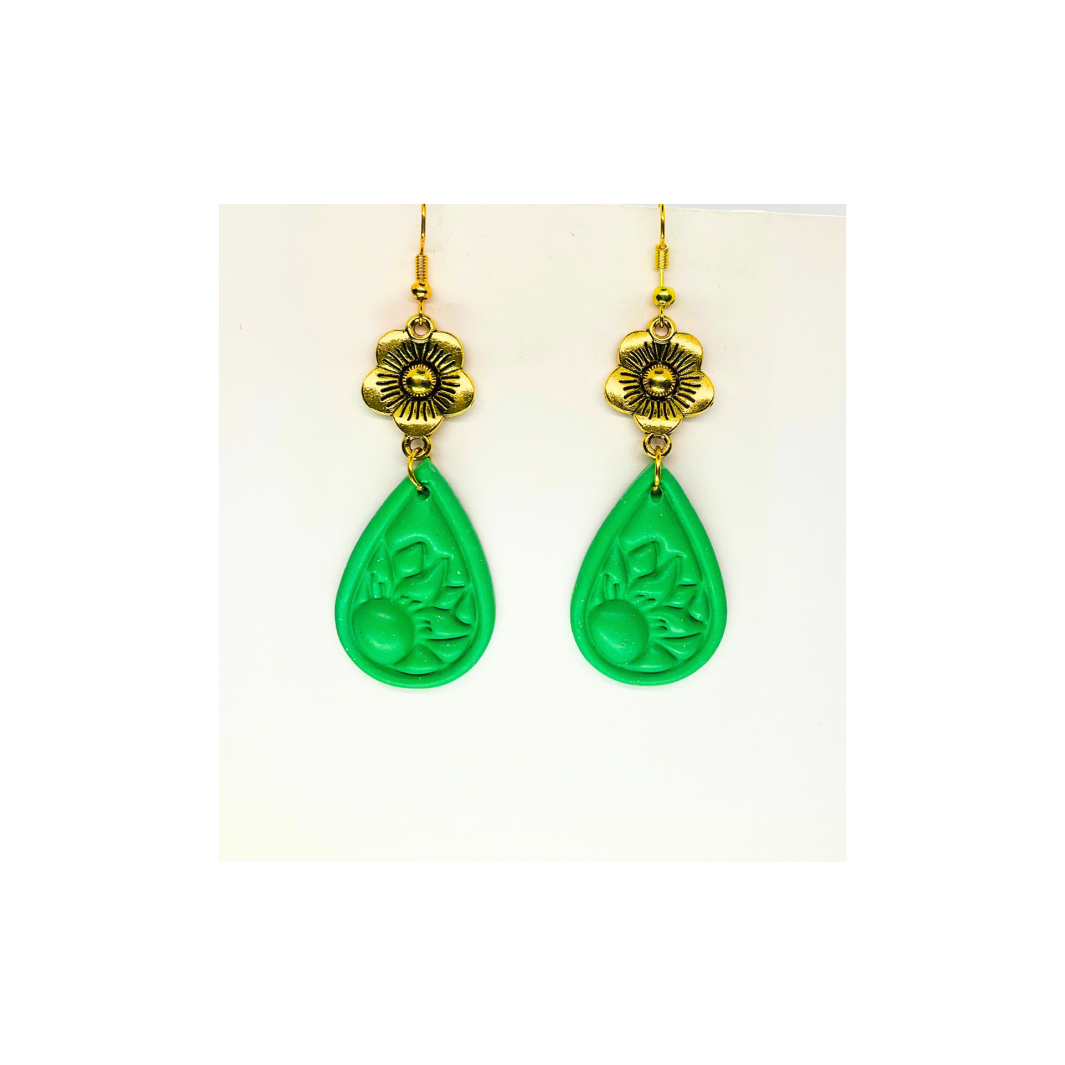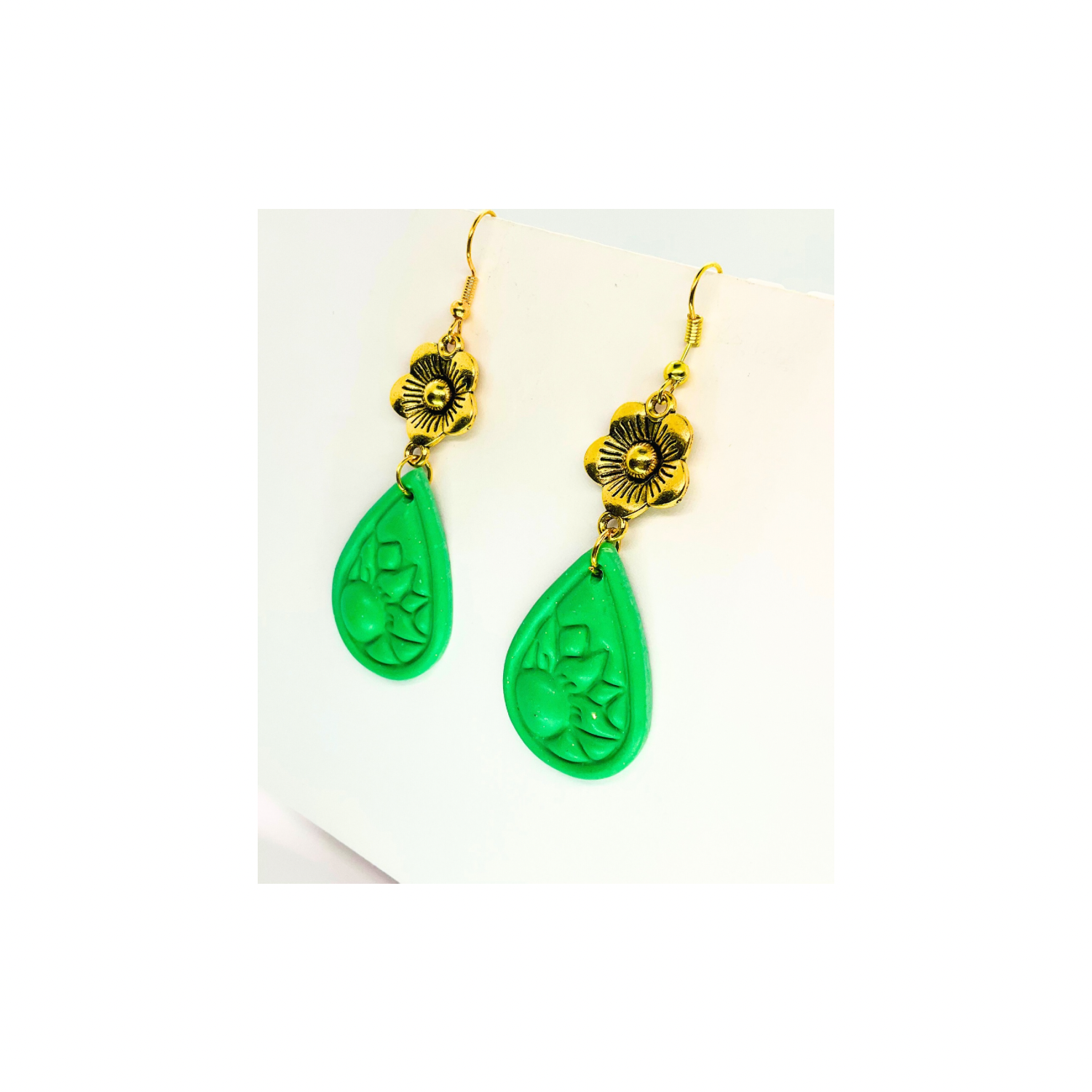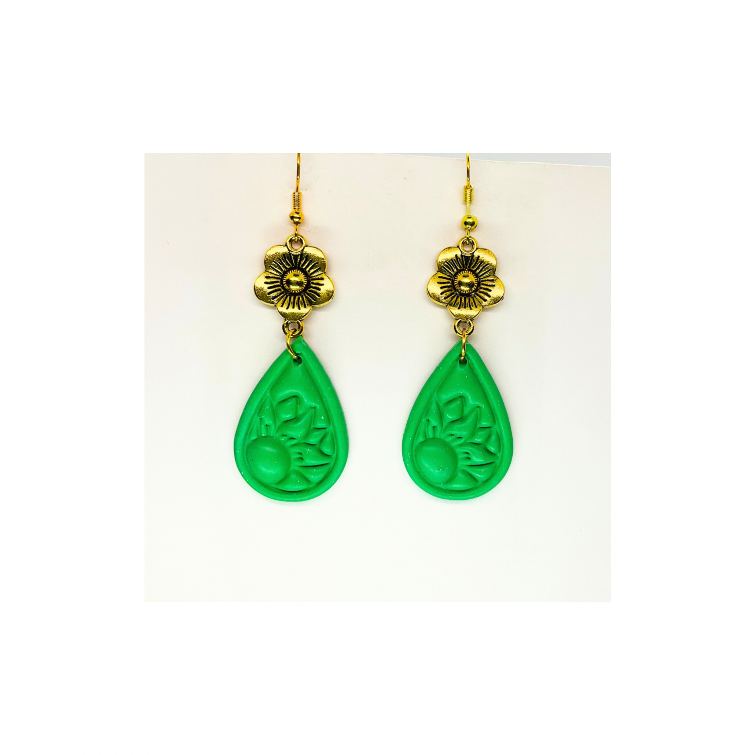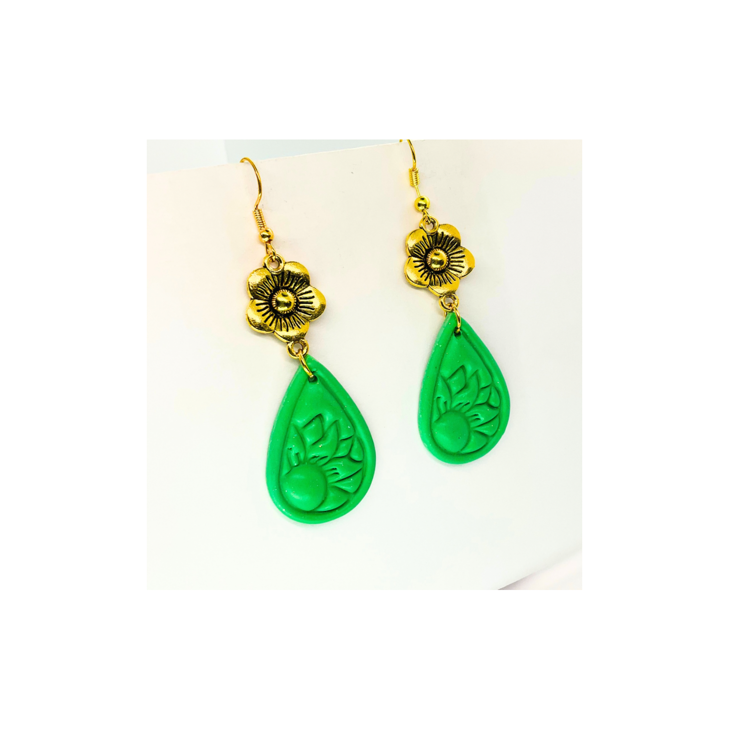 🌿 Green Teardrop with Gold Flower Dangle Earrings