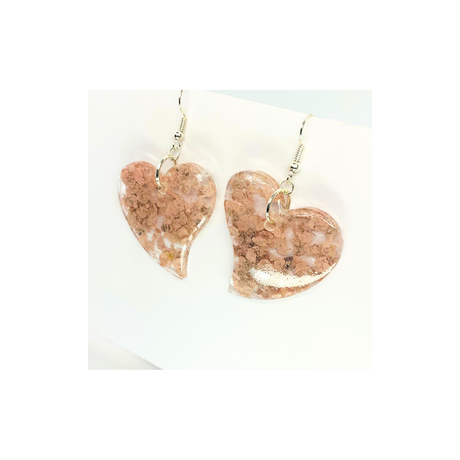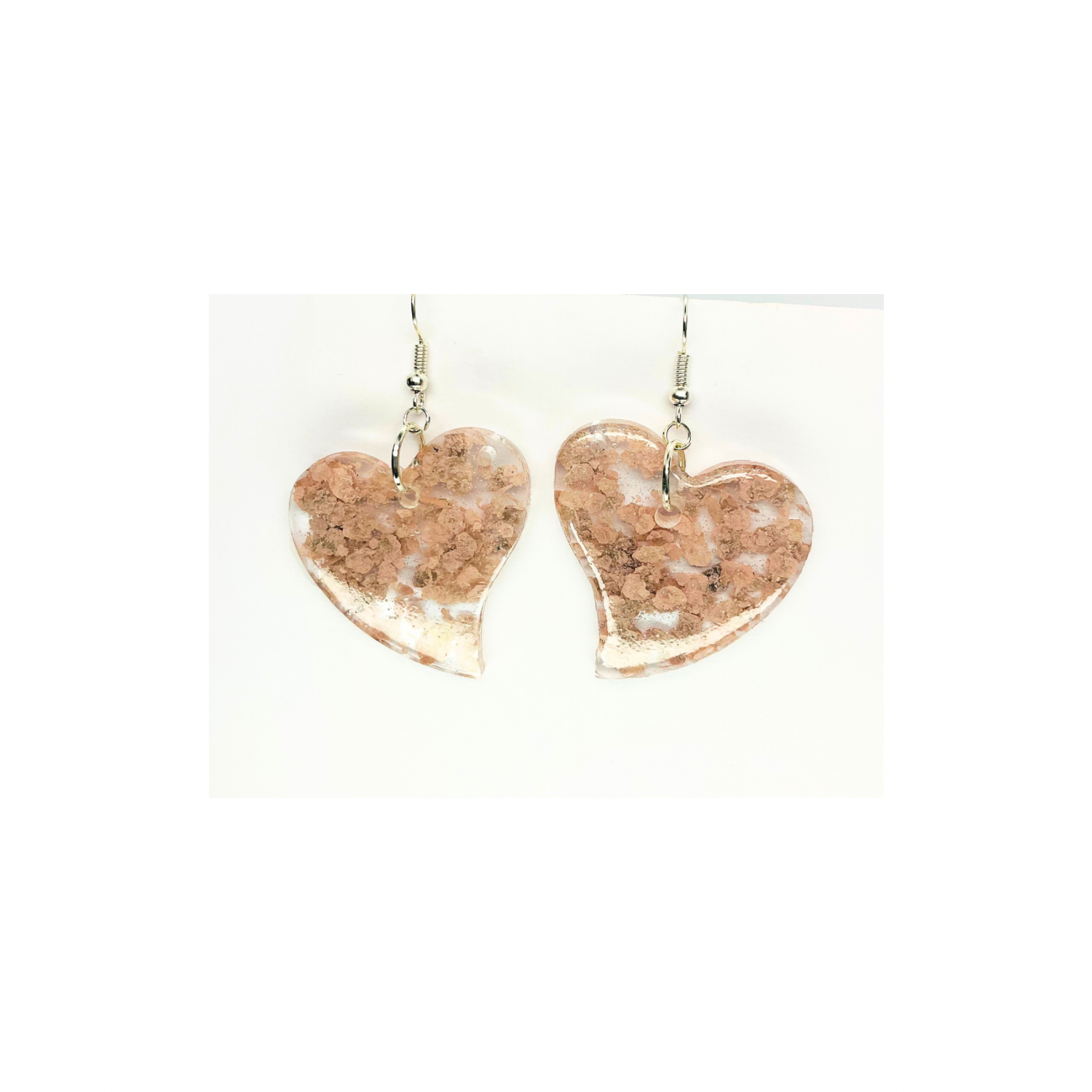 Handmade Light Pink Heart Earrings Clear Resin & Flakes Dangle Style Silver Hook Unique Handcrafted Jewelry