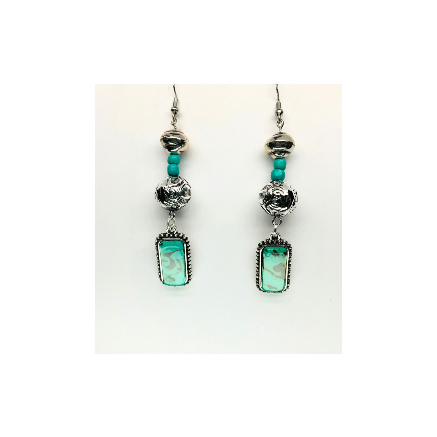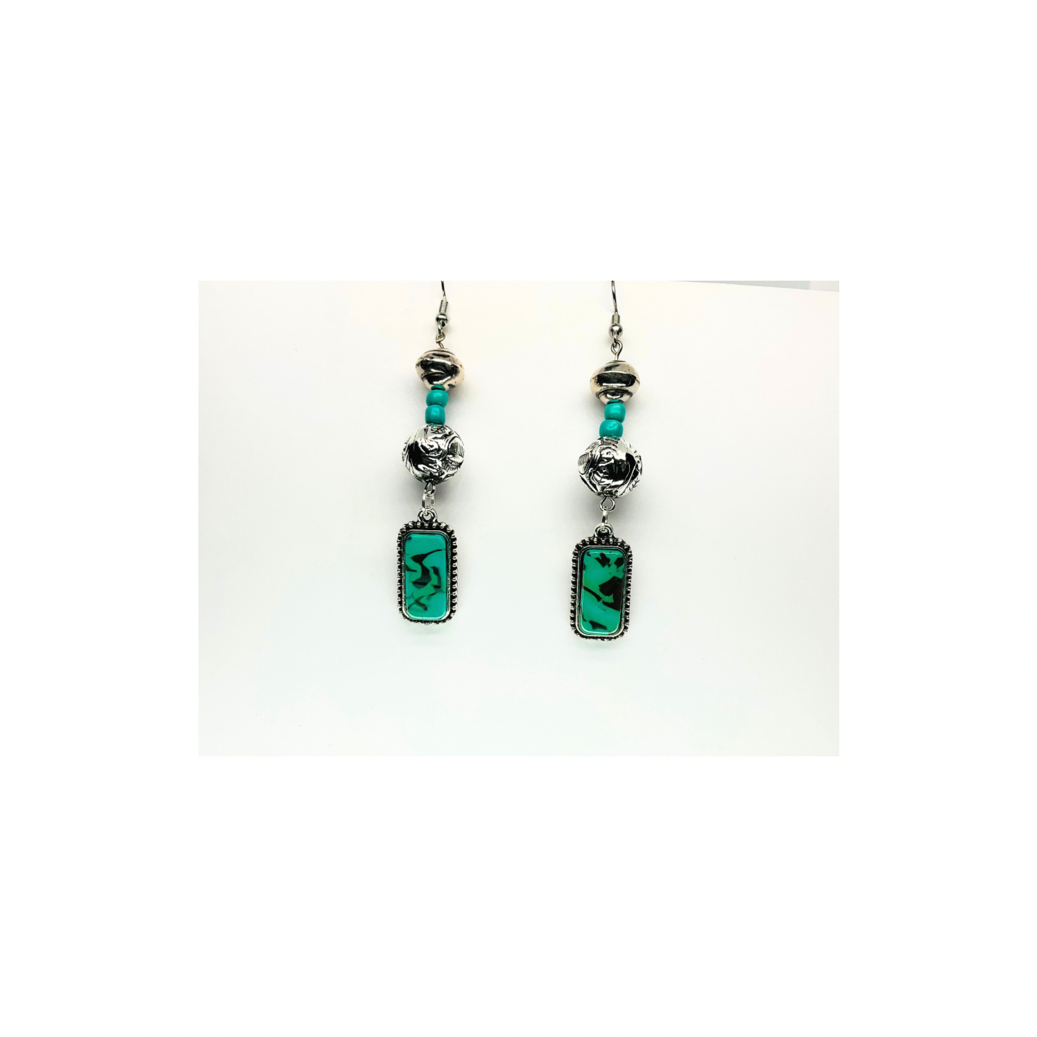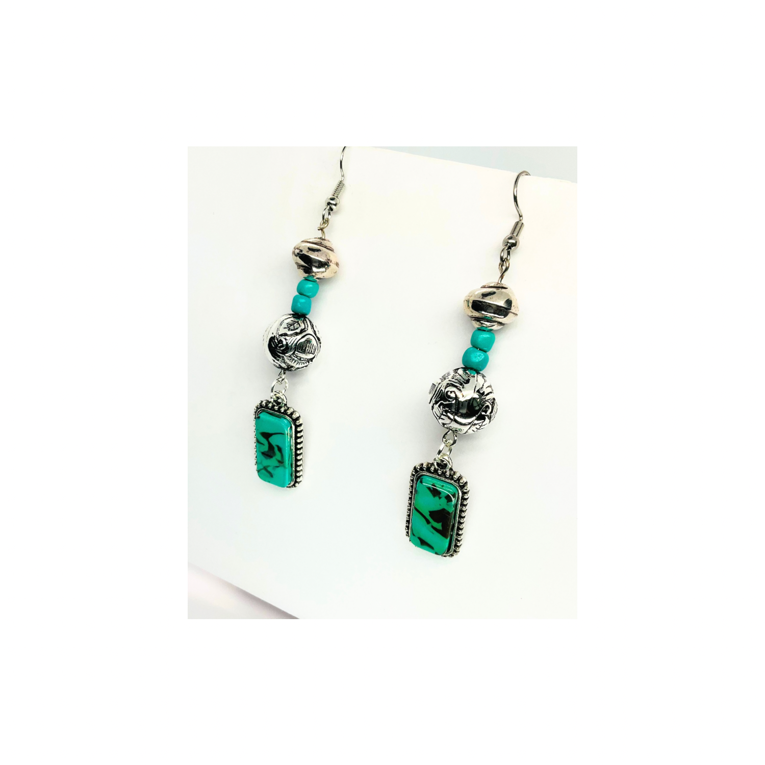 The earrings combine silver beads with turquoise charms, offering a harmonious blend of colors. The turquoise charms dangle elegantly, enhancing the overall appeal. Ideal for various occasions, these earrings are a versatile addition to your collection.