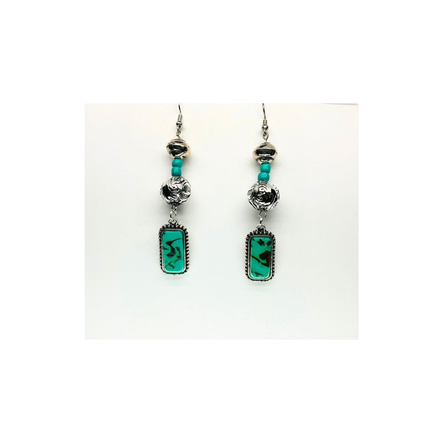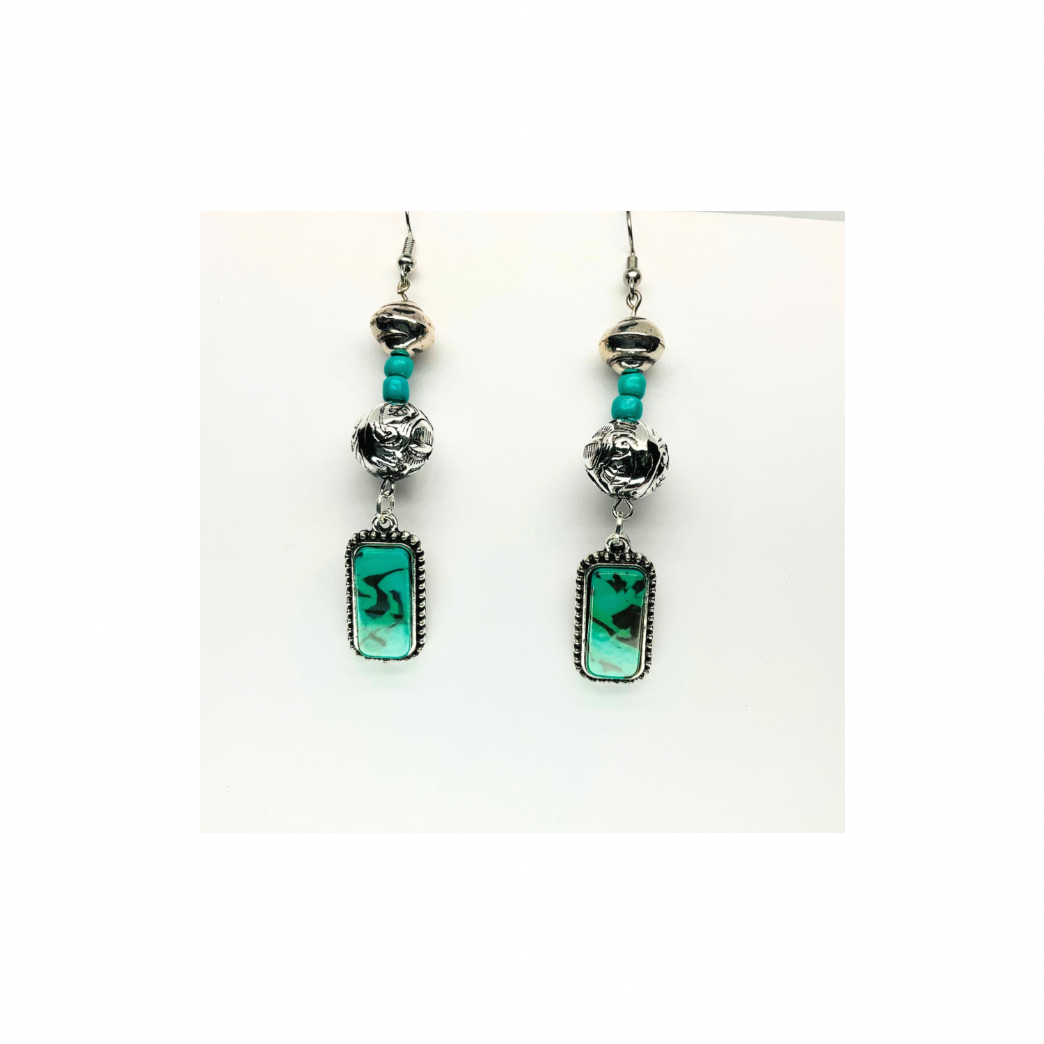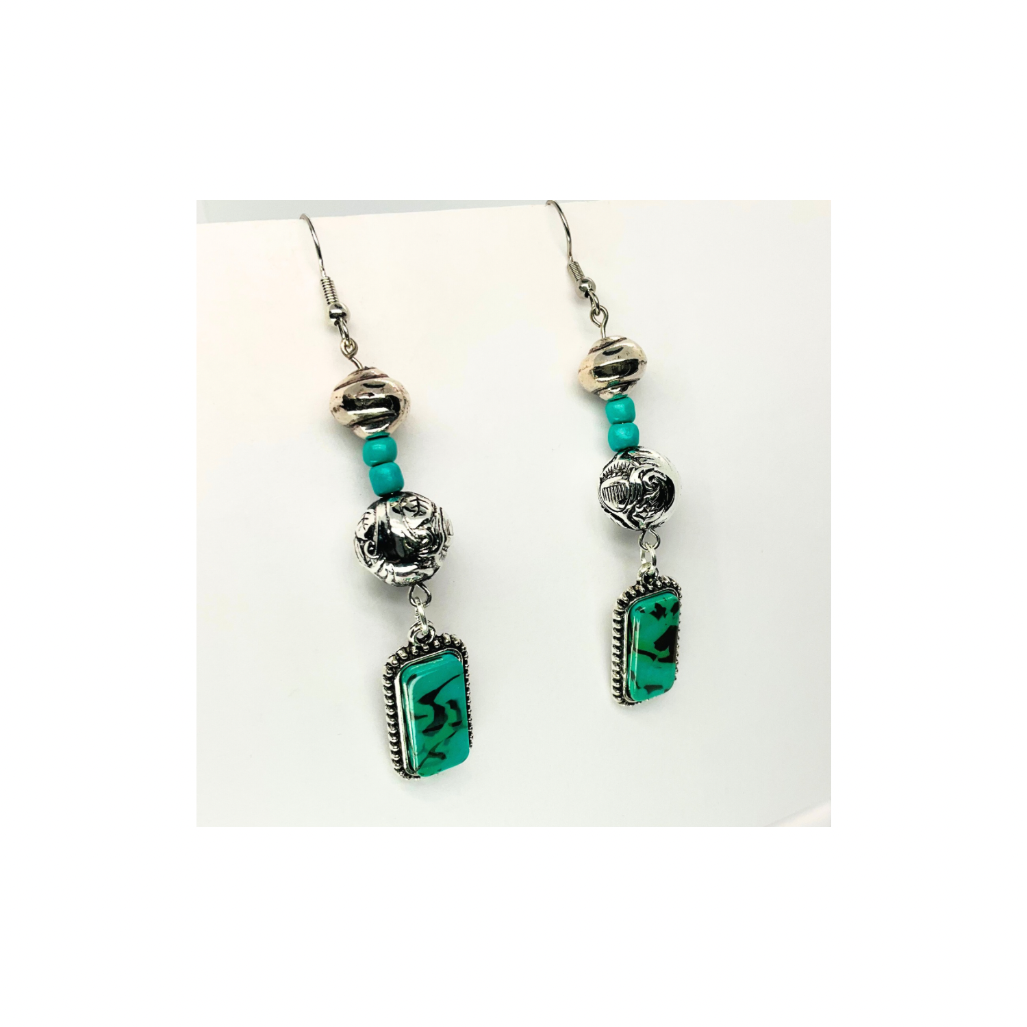 The earrings combine silver beads with turquoise charms, offering a harmonious blend of colors. The turquoise charms dangle elegantly, enhancing the overall appeal. Ideal for various occasions, these earrings are a versatile addition to your collection.