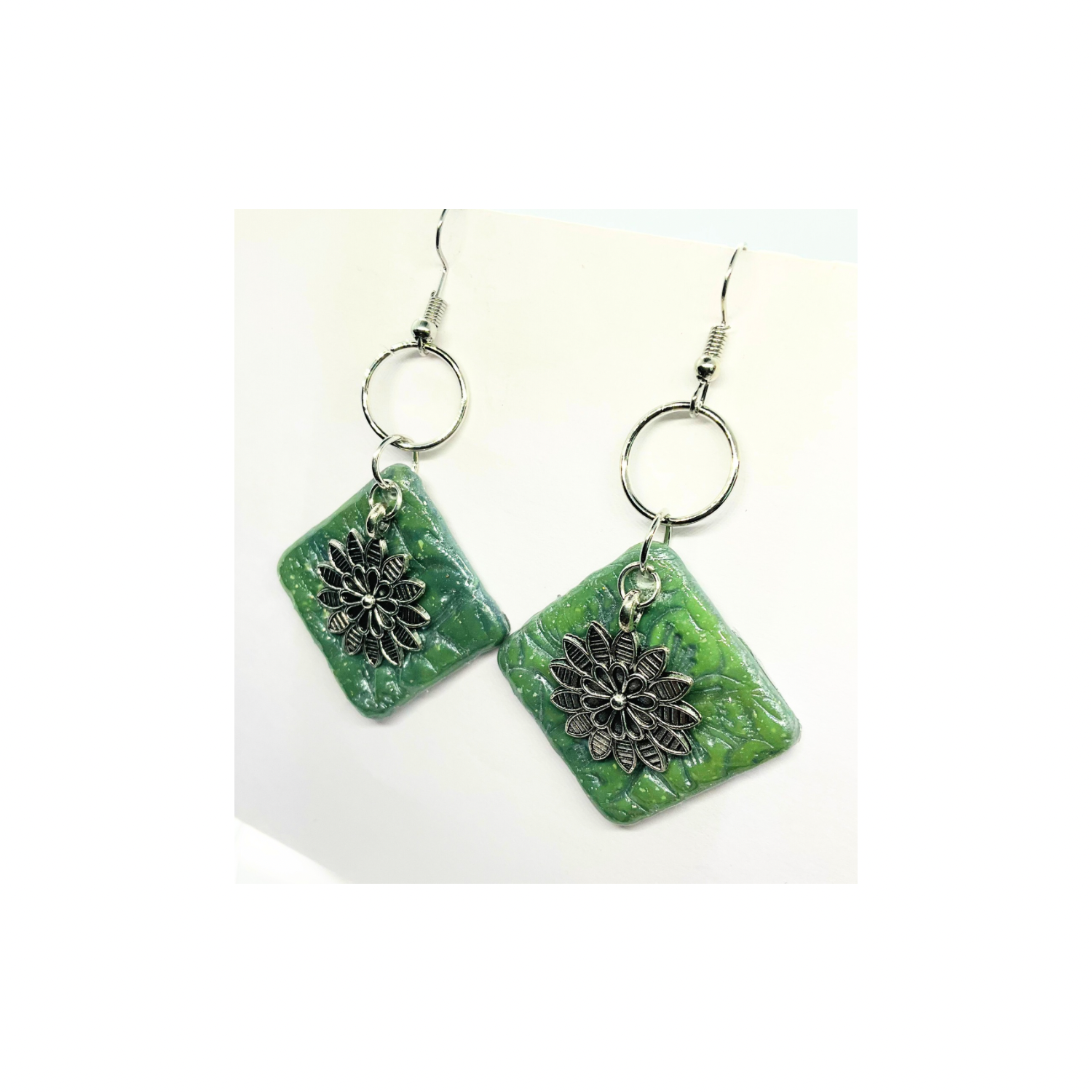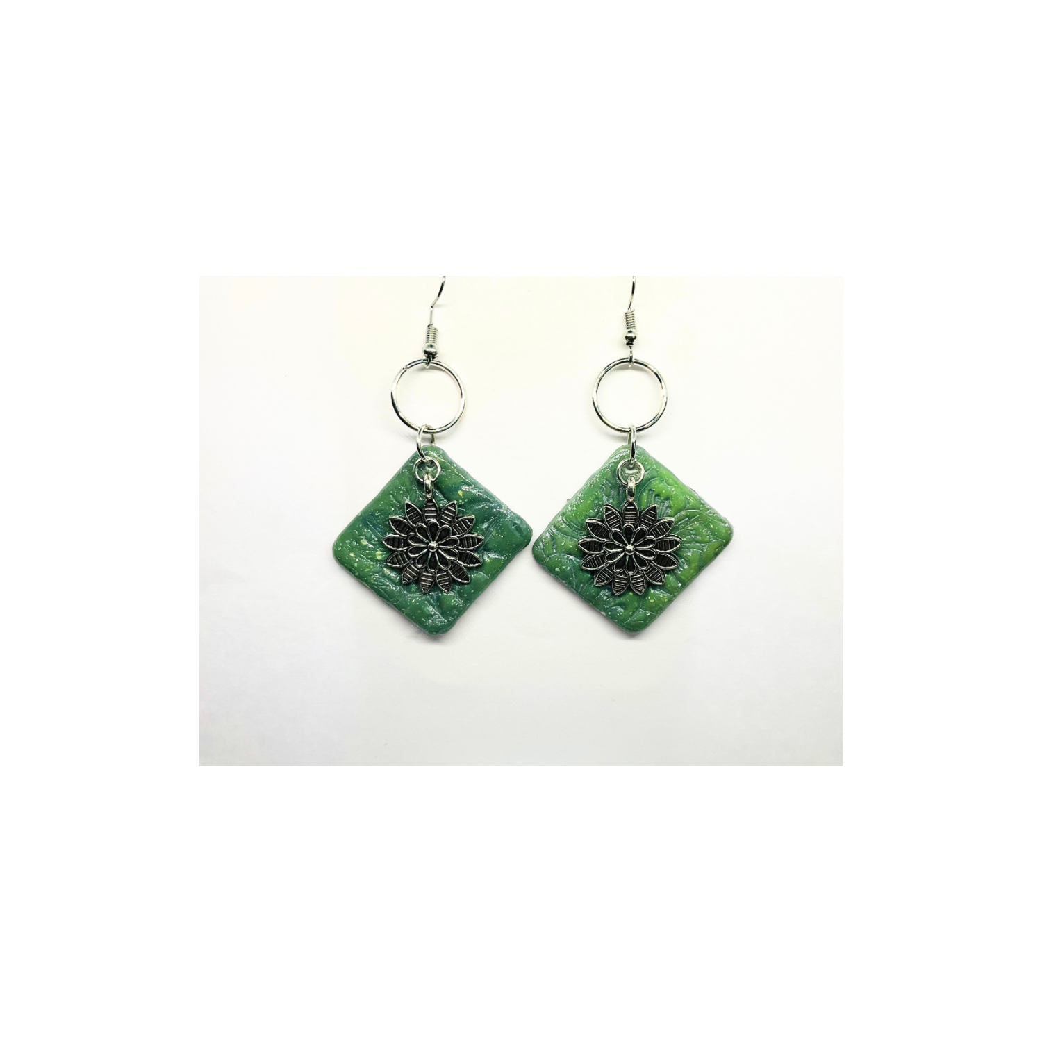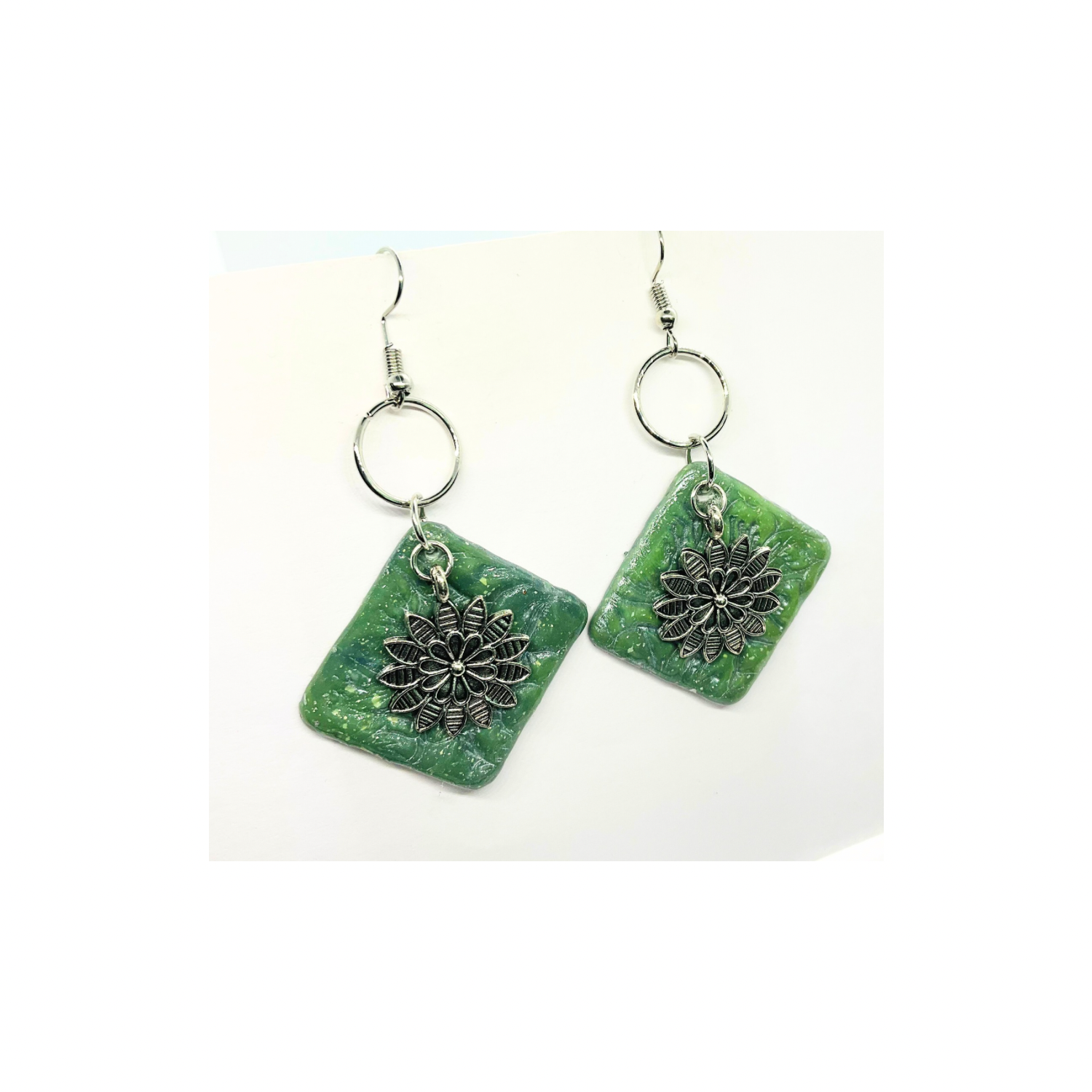 Discover the unique charm of our Jade Green Square with Silver Flower Charm Dangle Earrings. This accessory adds sophistication to any outfit. The square design complements the silver flower charm beautifully, creating a harmonious look. Ideal for those who appreciate distinctive jewelry.