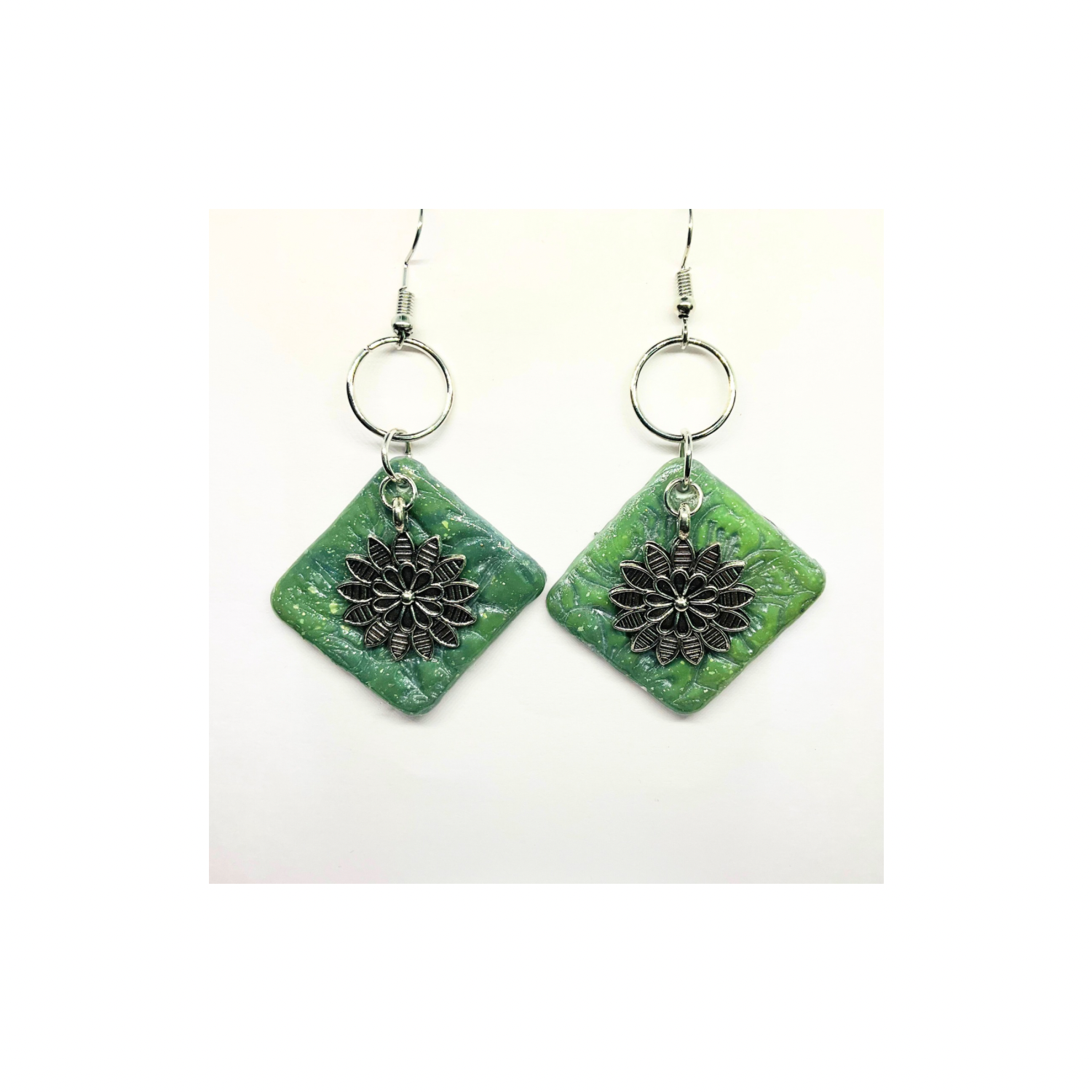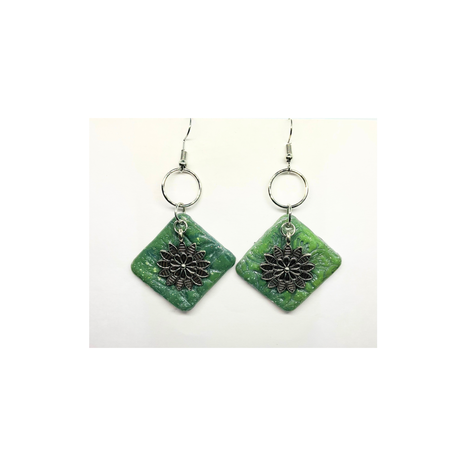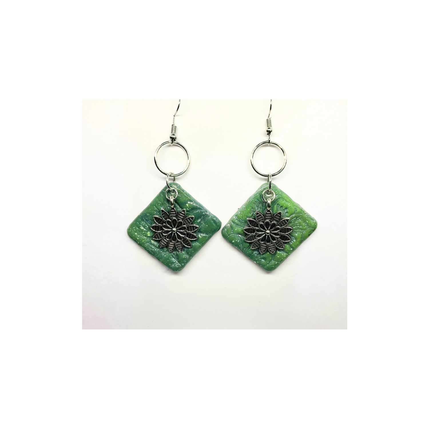 Discover the unique charm of our Jade Green Square with Silver Flower Charm Dangle Earrings. This accessory adds sophistication to any outfit. The square design complements the silver flower charm beautifully, creating a harmonious look. Ideal for those who appreciate distinctive jewelry.