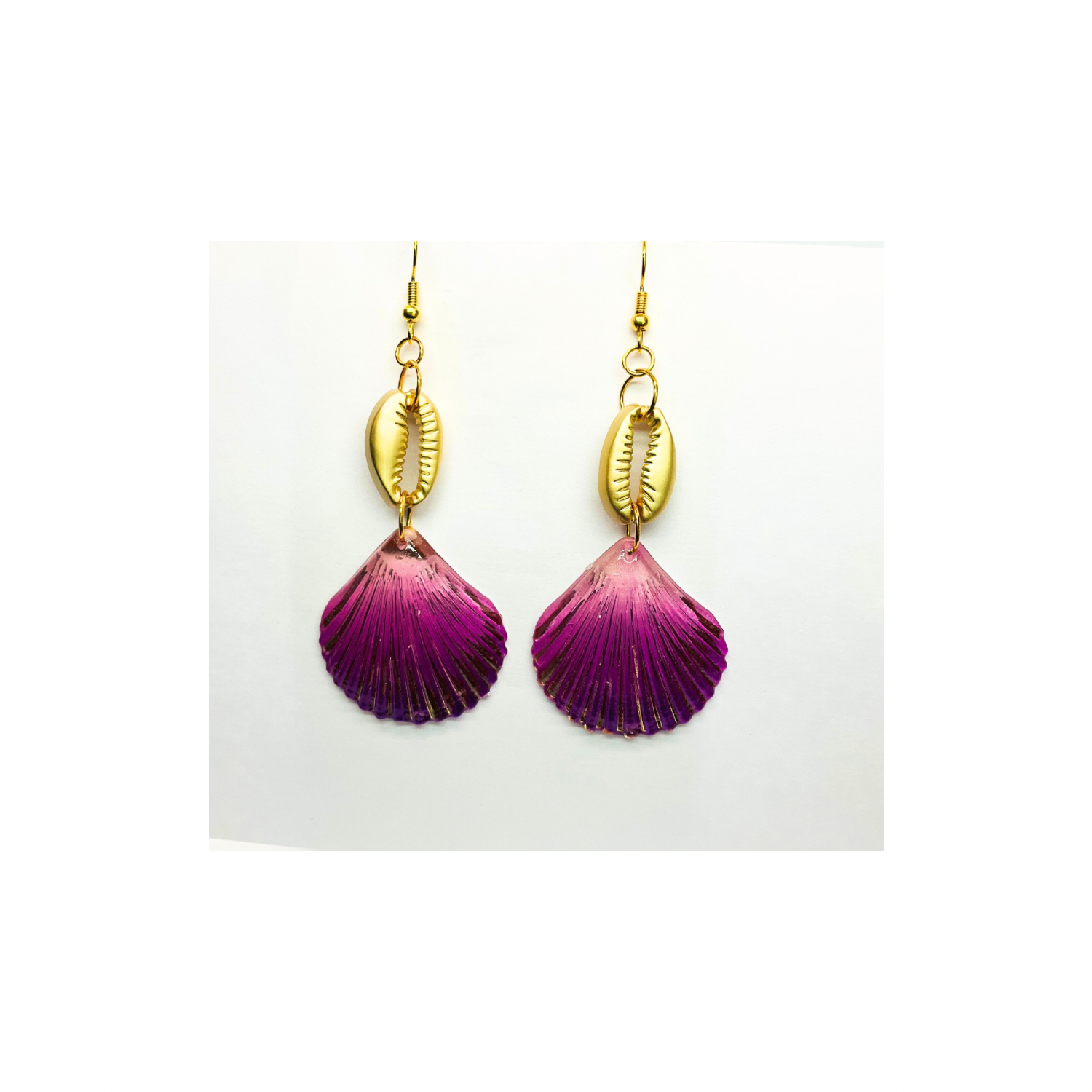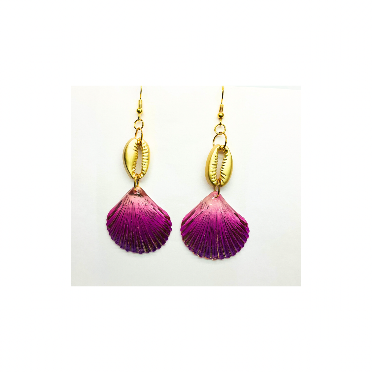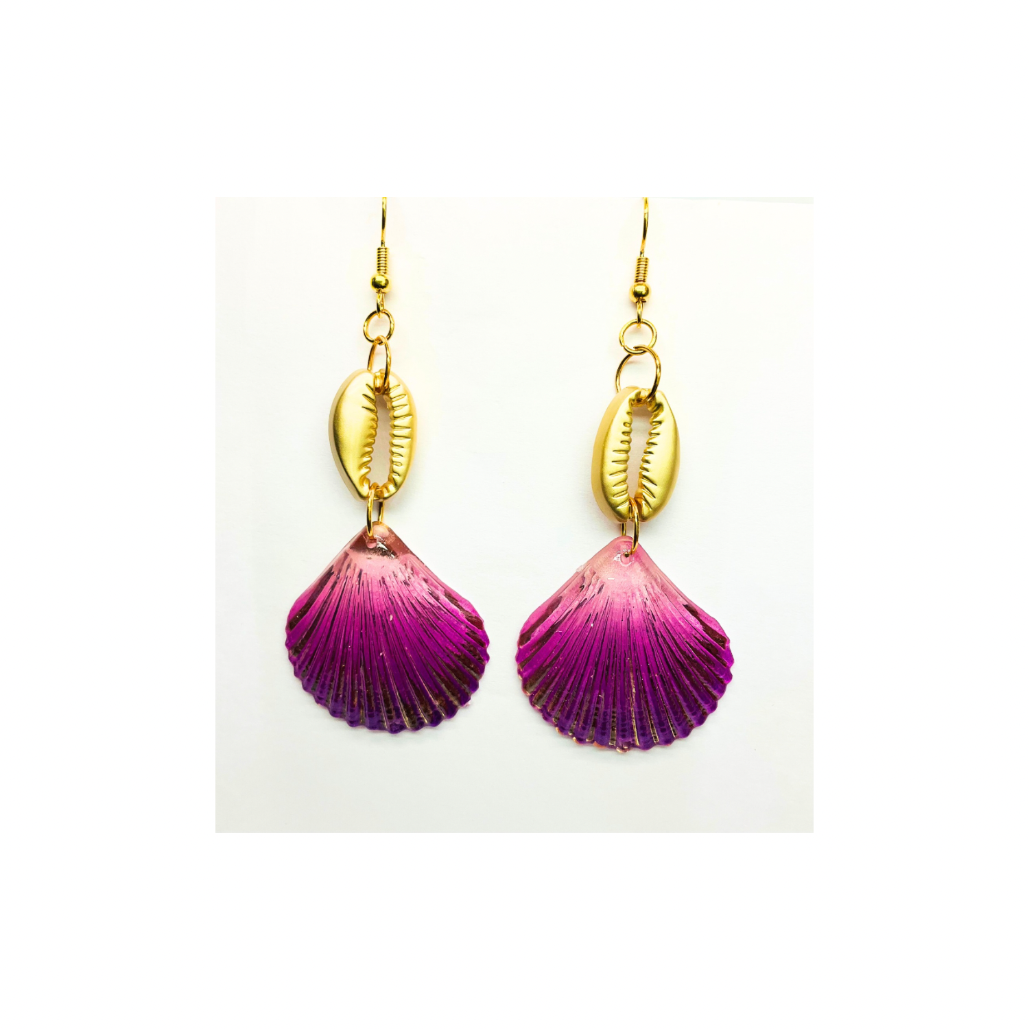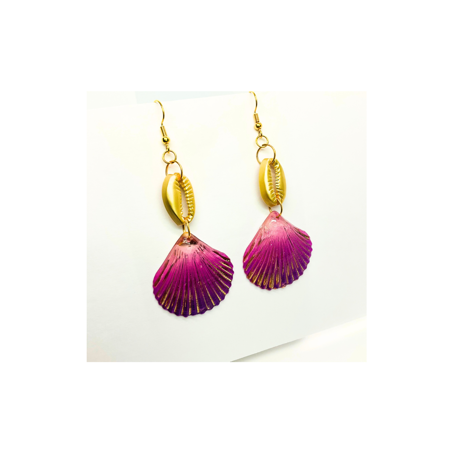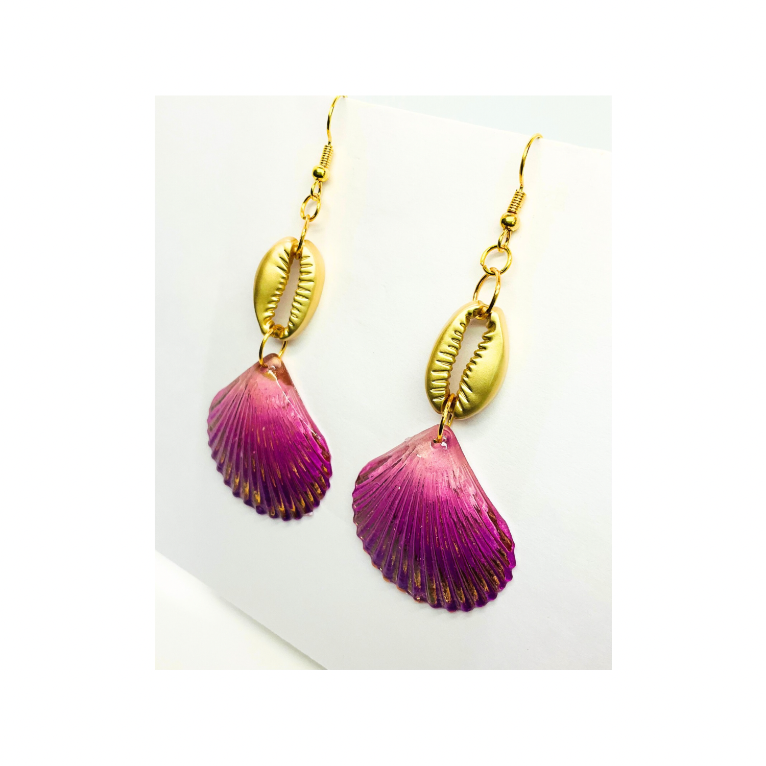 The earrings showcase a combination of gold and pink shells. Their design is both versatile and eye-catching. Ideal for accessorizing various occasions, from casual outings to formal events. Enhance your look effortlessly with these charming earrings.