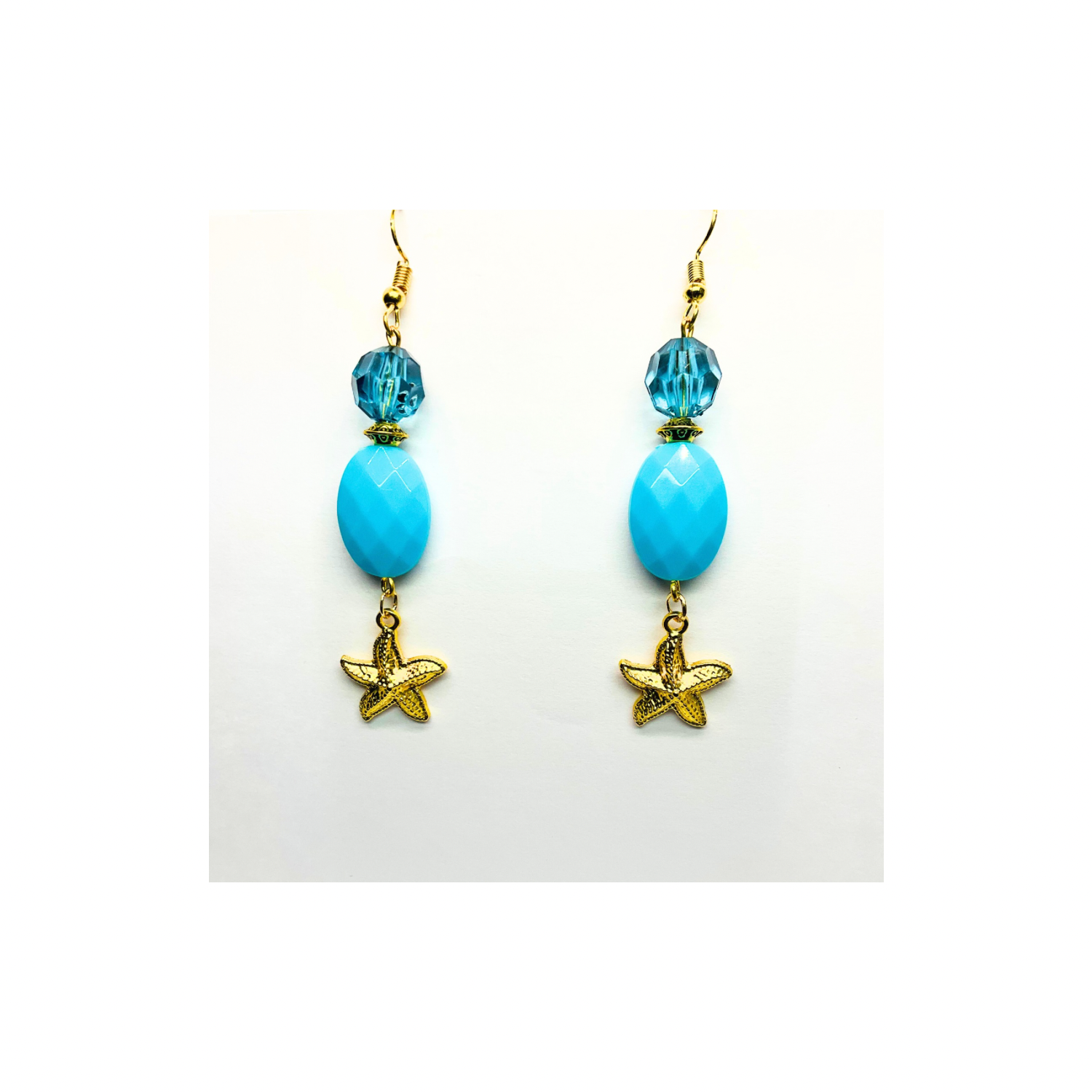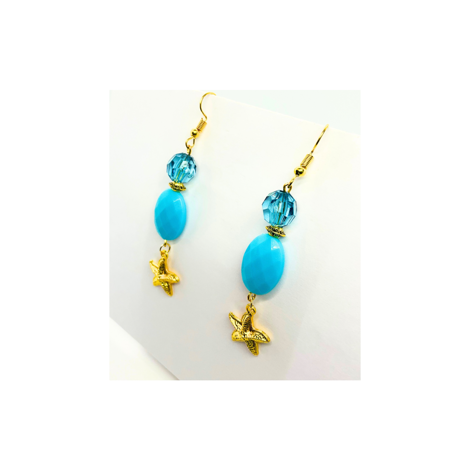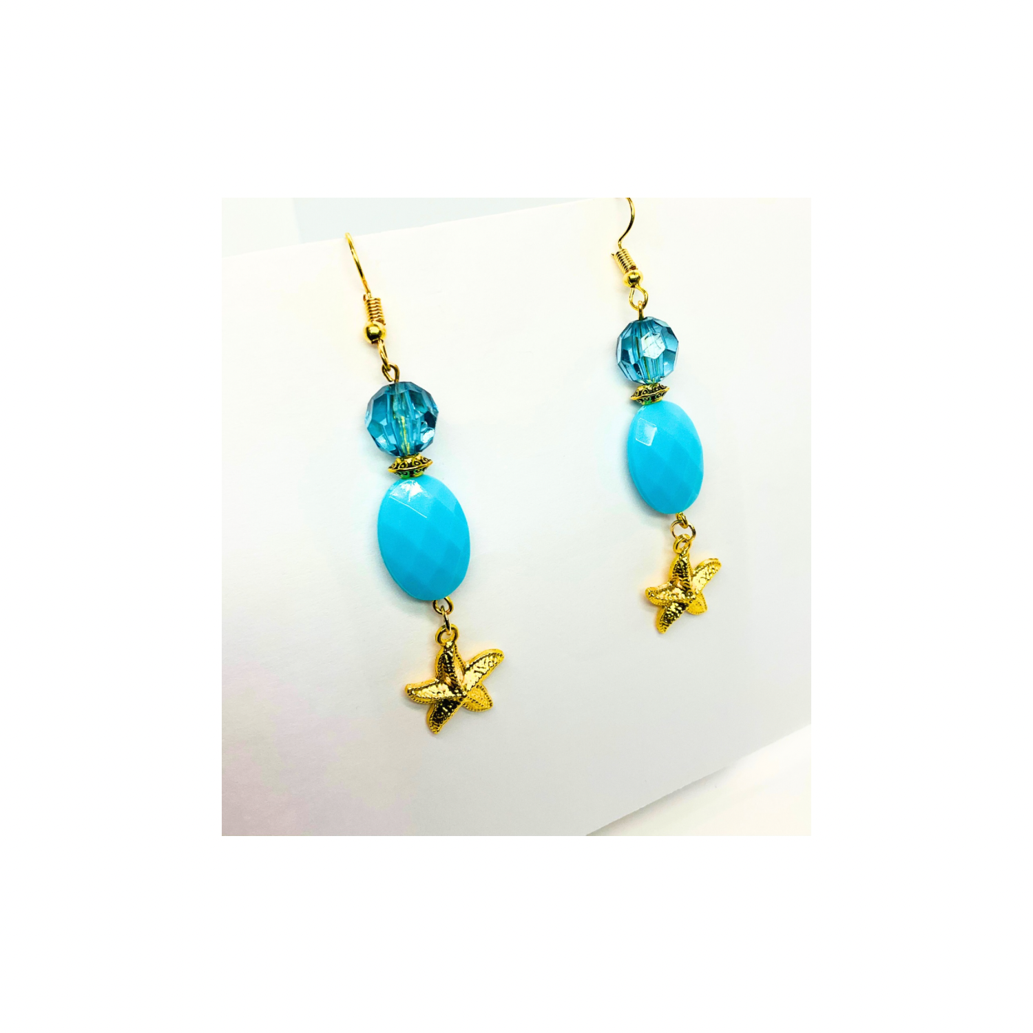 These earrings feature gold-tone accents and blue beads, perfect for any outfit. The starfish charm adds a unique touch, making them a standout accessory. Ideal for those who love a nautical vibe, these earrings bring a splash of color and style.
