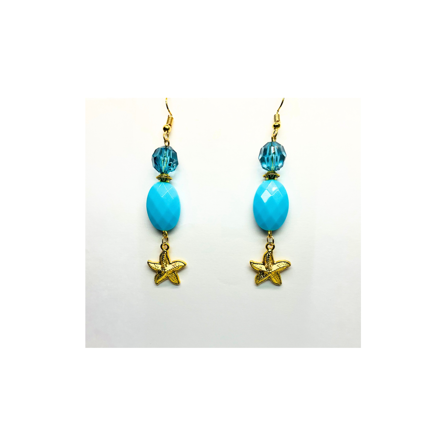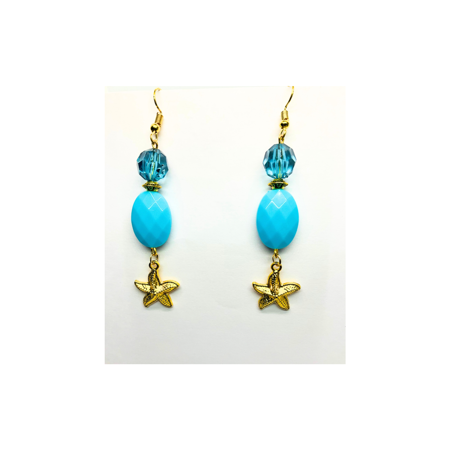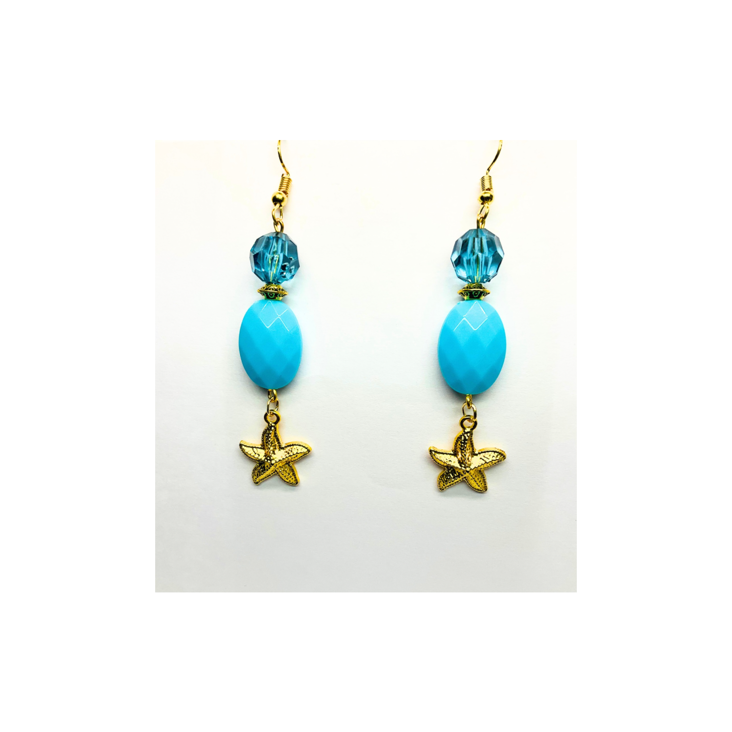 These earrings feature gold-tone accents and blue beads, perfect for any outfit. The starfish charm adds a unique touch, making them a standout accessory. Ideal for those who love a nautical vibe, these earrings bring a splash of color and style.