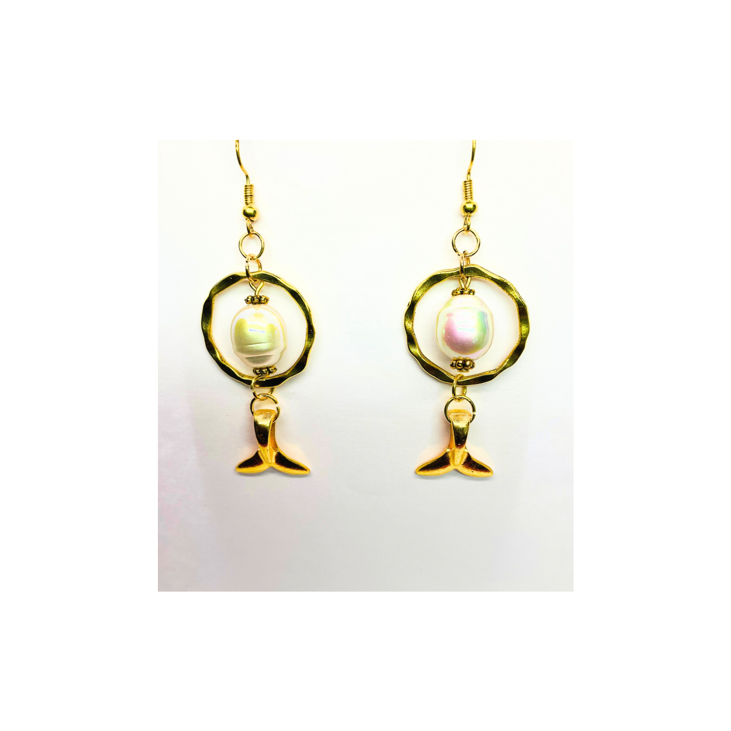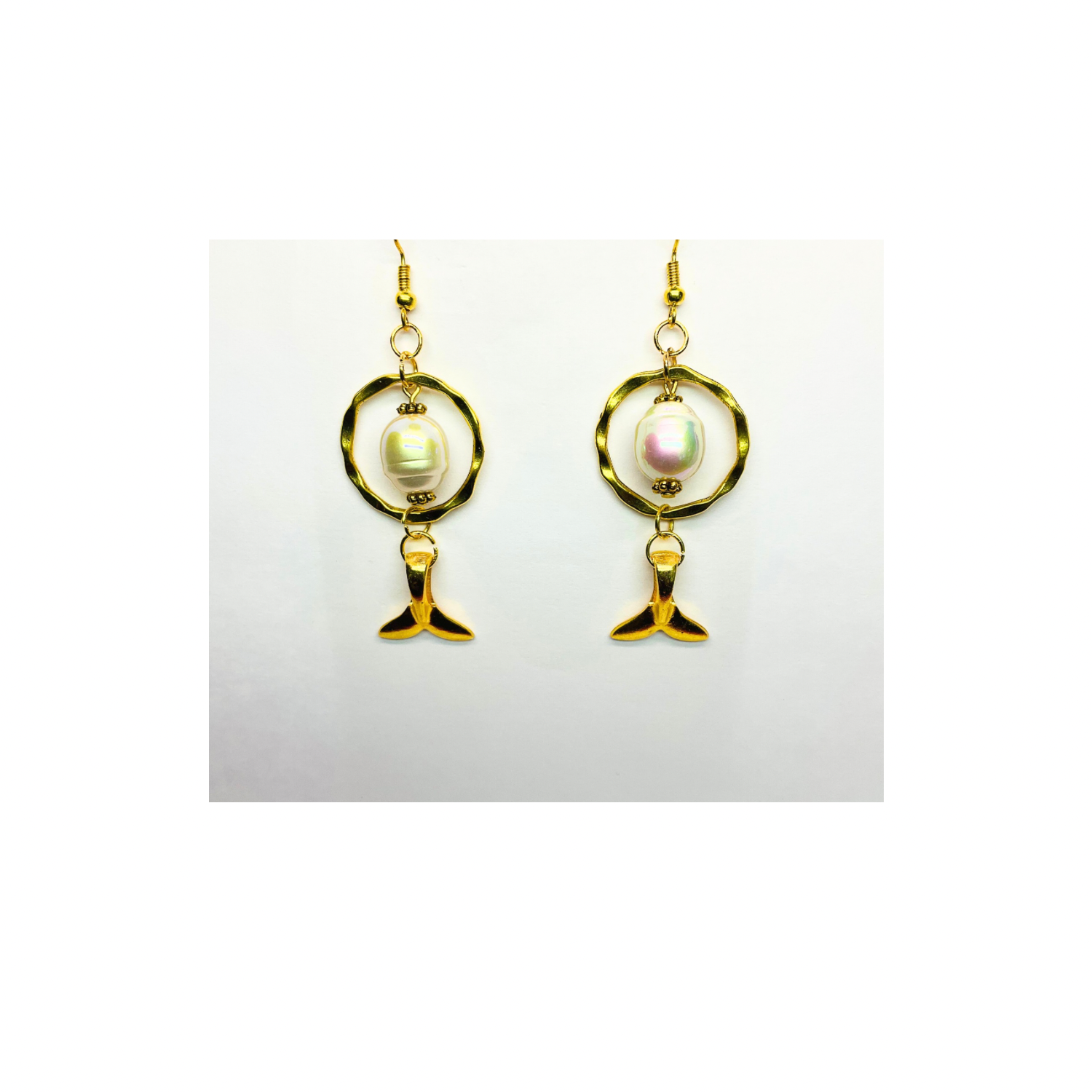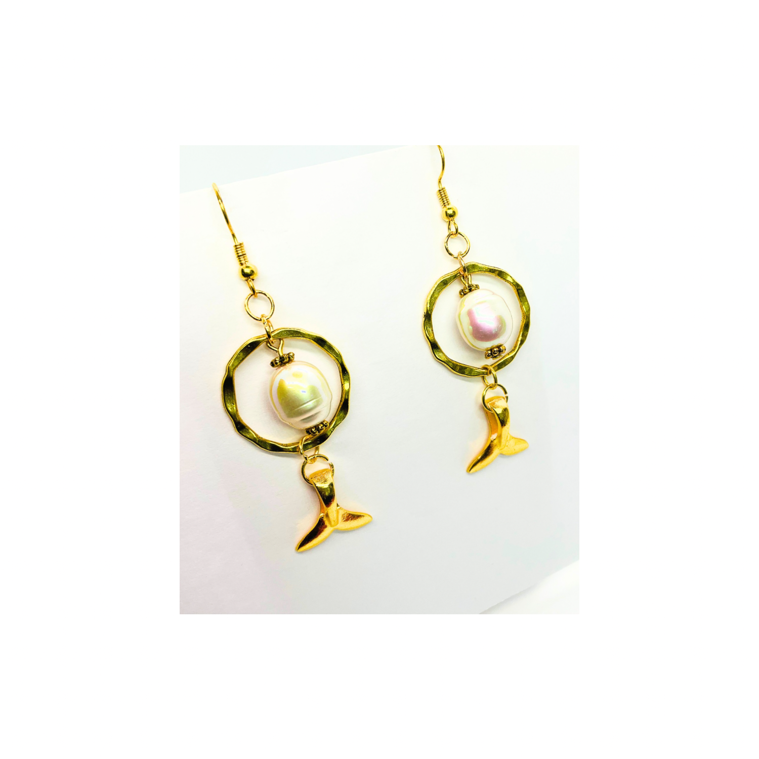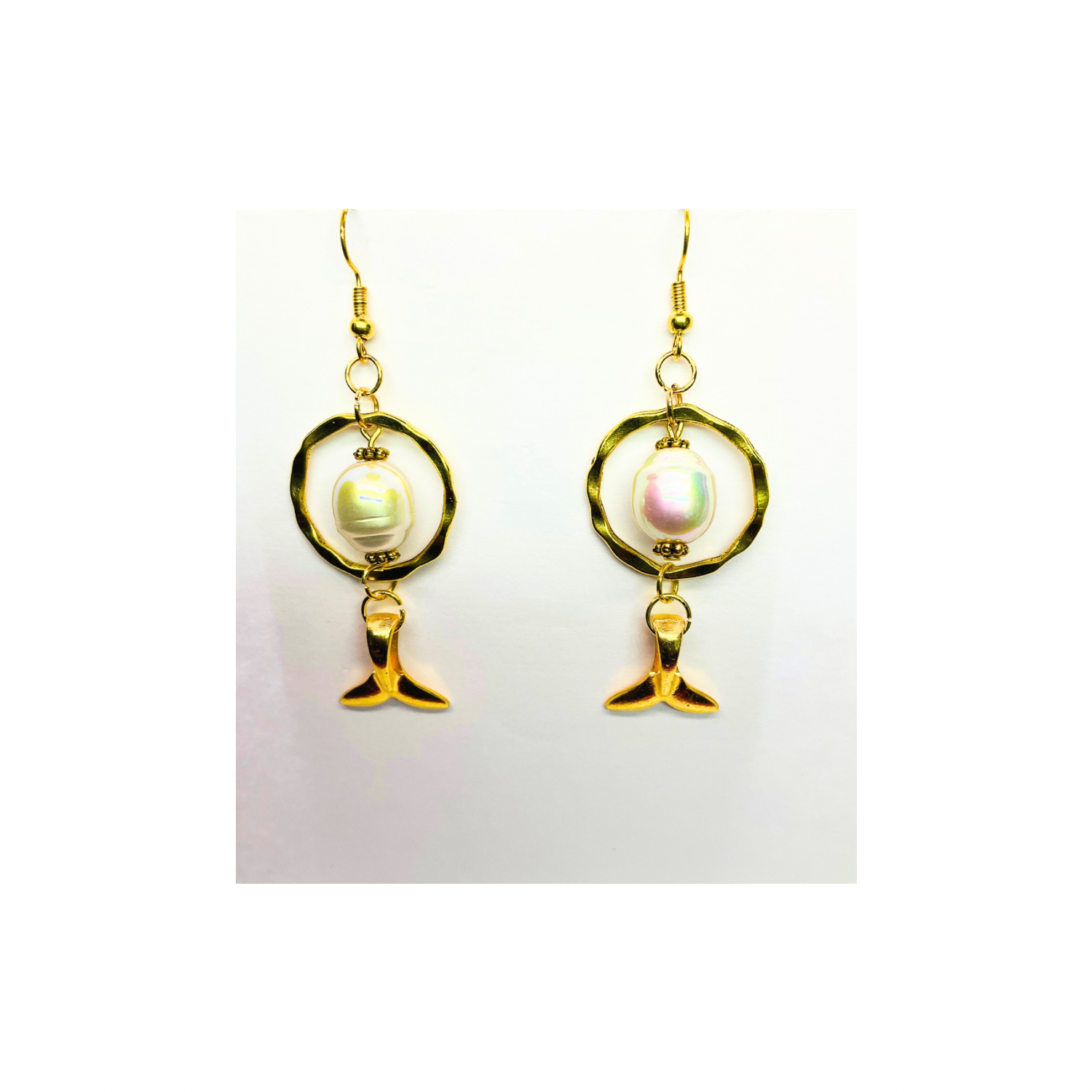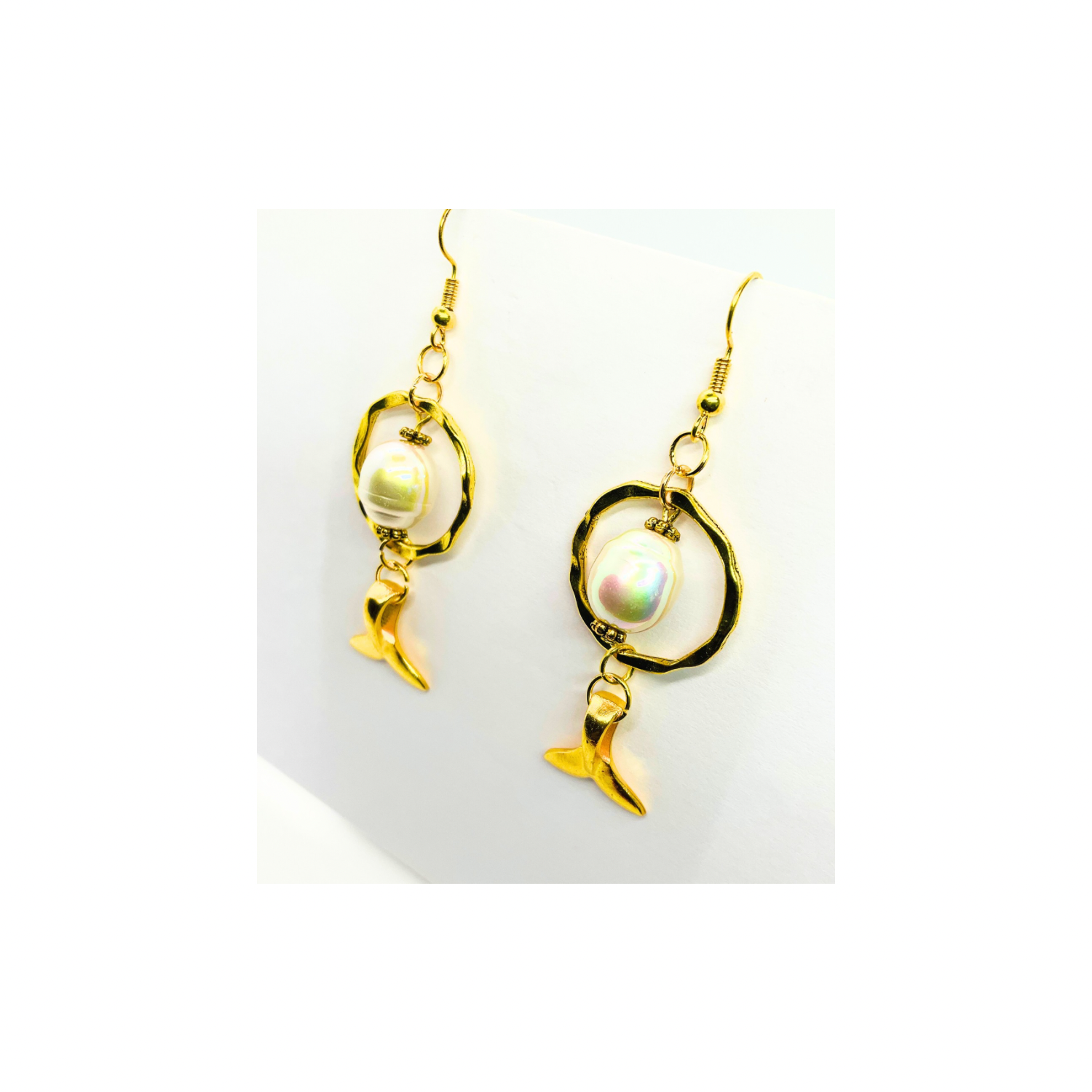 This earring features a captivating gold mermaid tail design. It's adorned with a pearl dangle, adding sophistication. Perfect for those who love a mystical and elegant look. The design is both unique and eye-catching. Enhance your outfit with this enchanting charm.