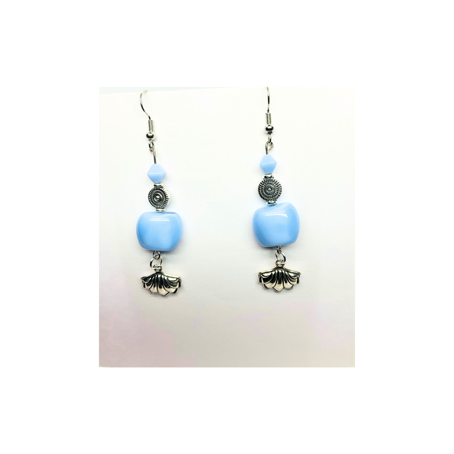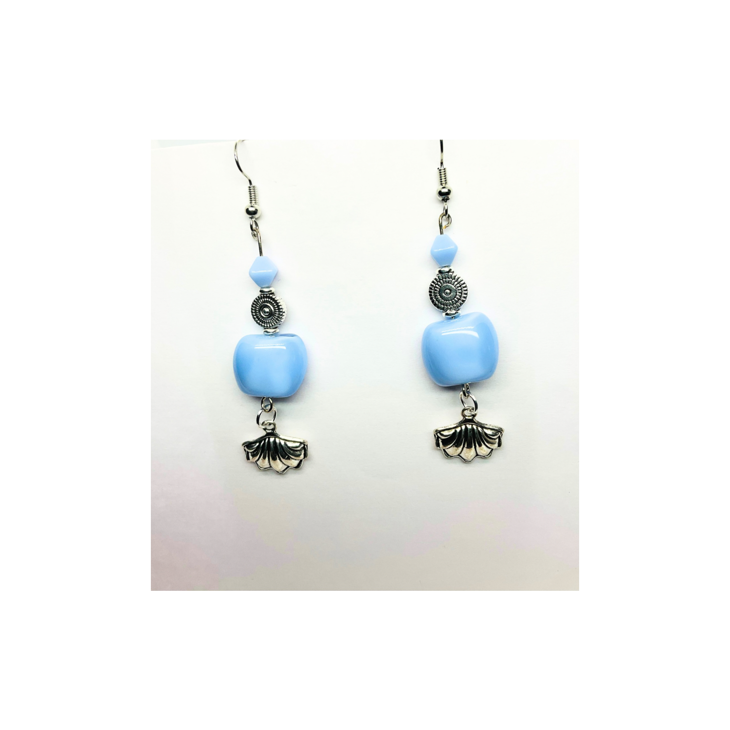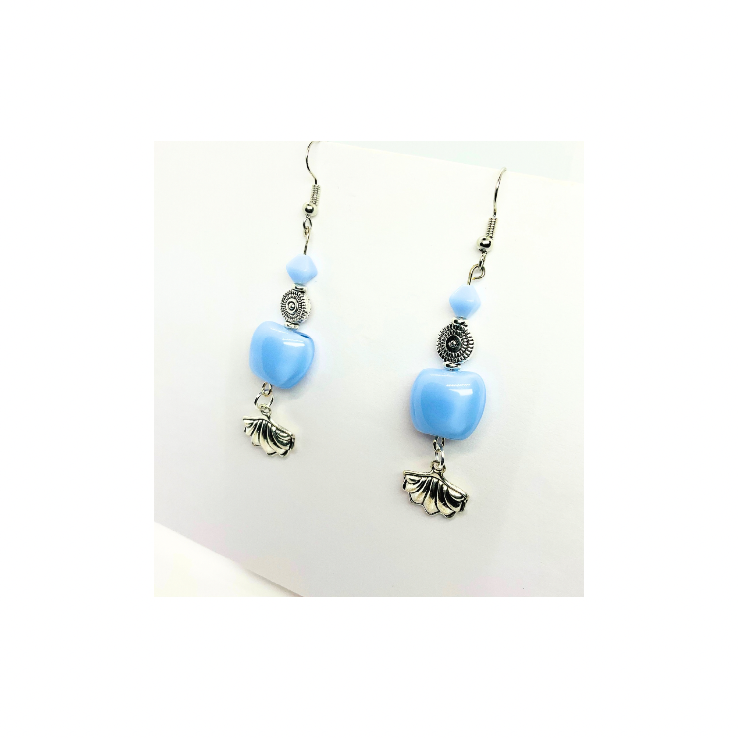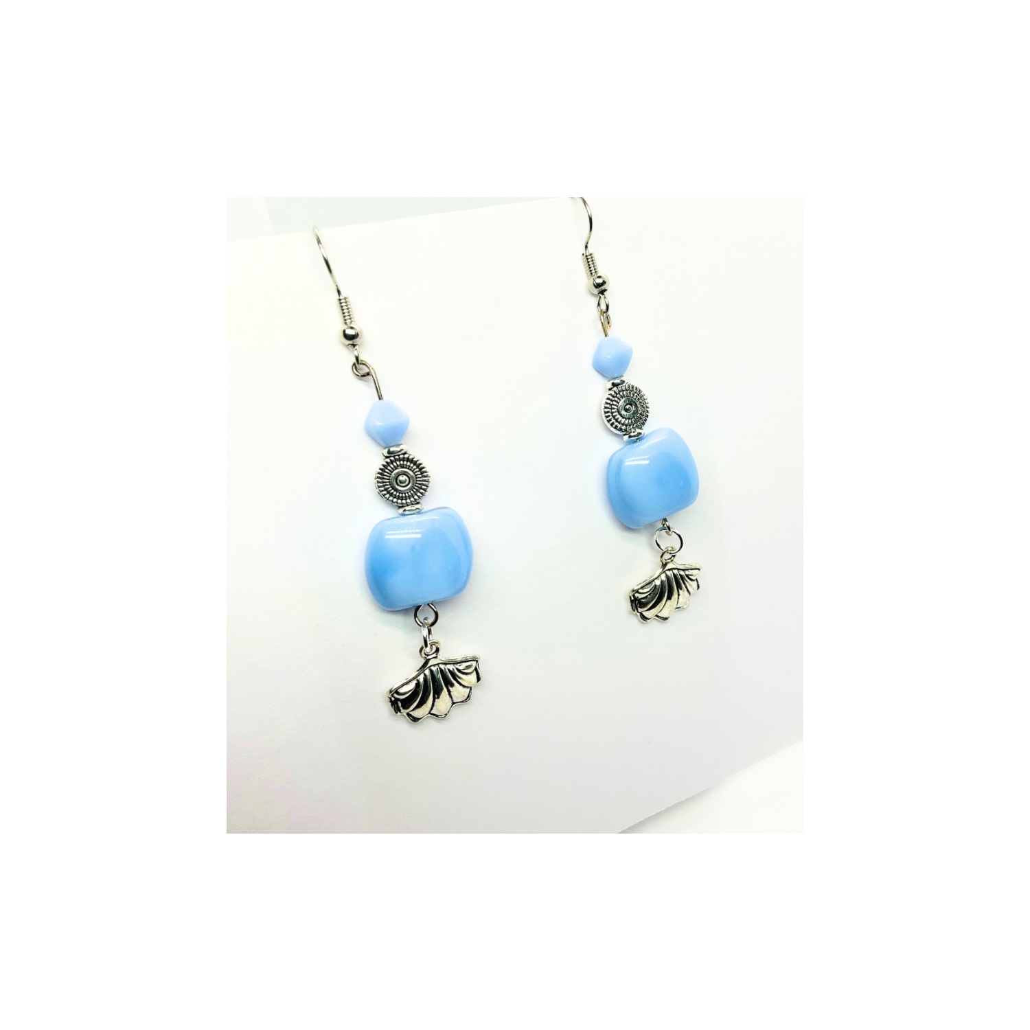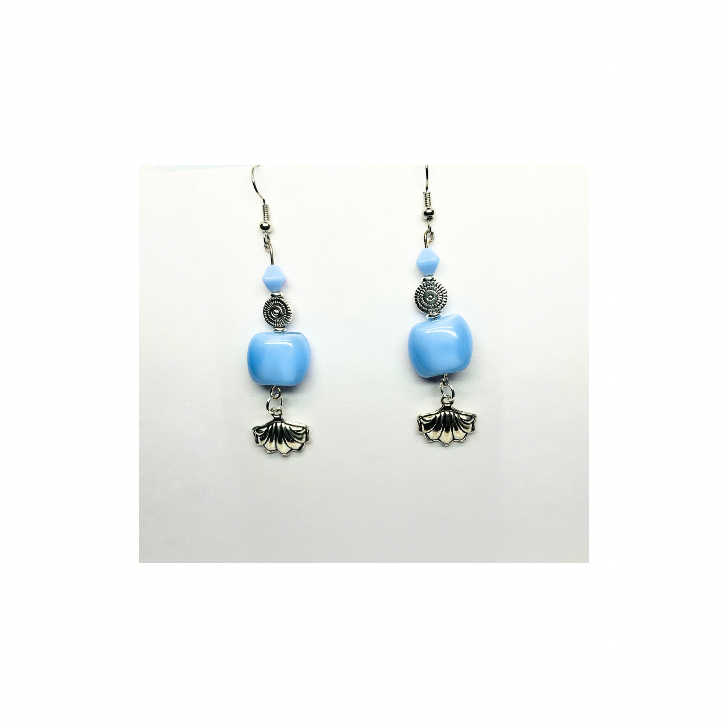 β¨ Discover the Ocean Collection Light Blue Beads with Silver Shell Charm Dangle Earrings! These stylish earrings feature a unique design that captures the essence of the ocean. The light blue beads are complemented by a silver shell charm, creating a harmonious look. Perfect for those who appreciate distinctive accessories.