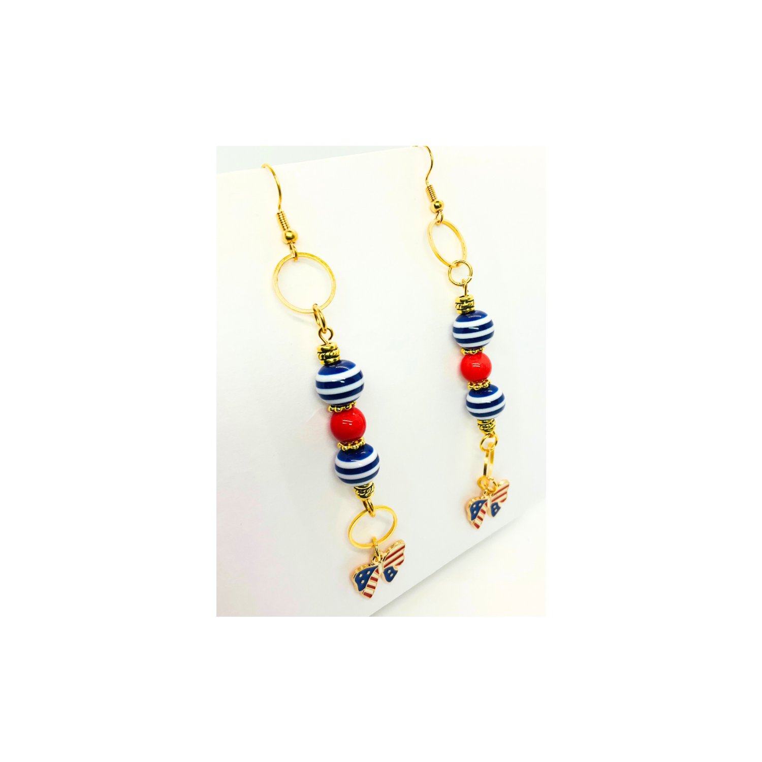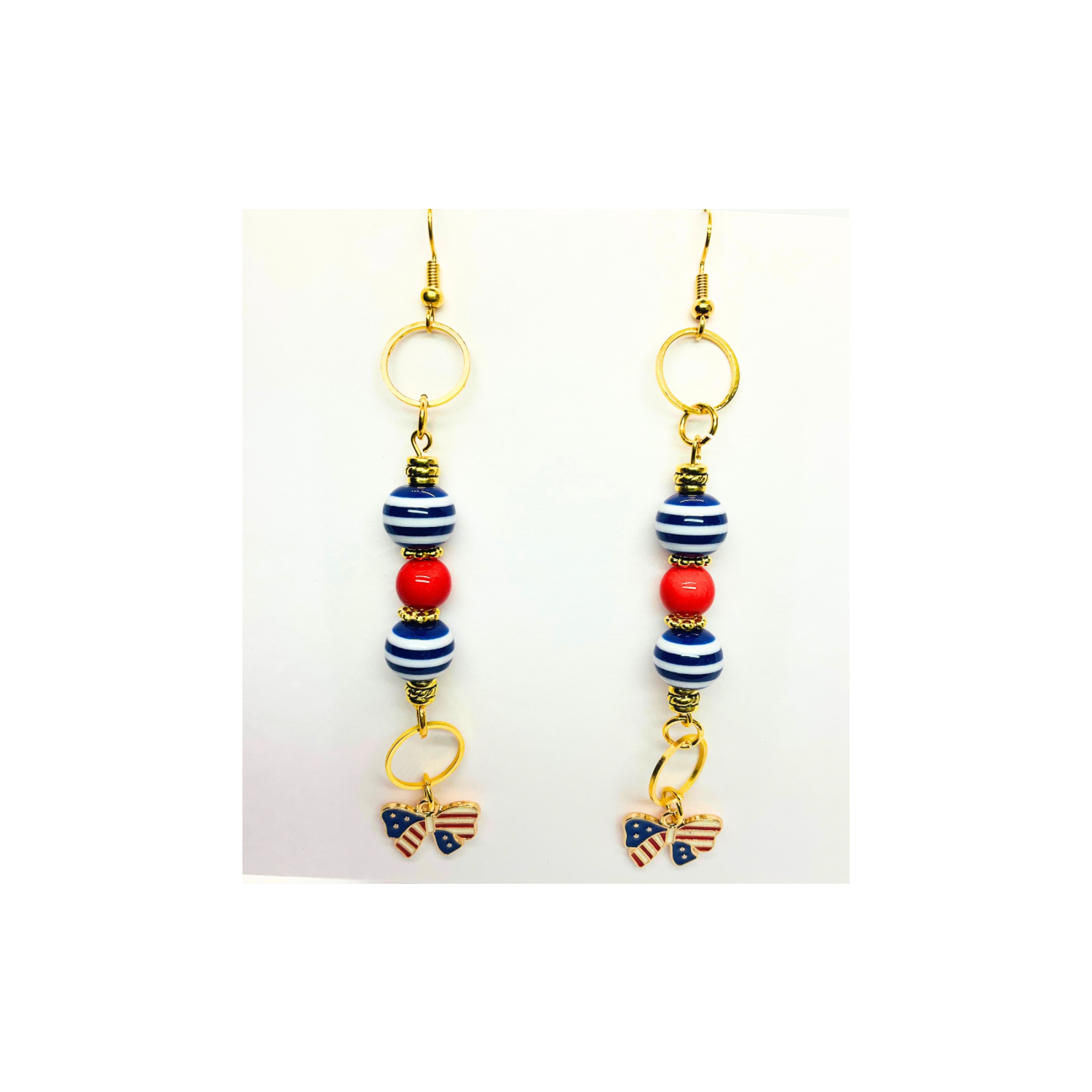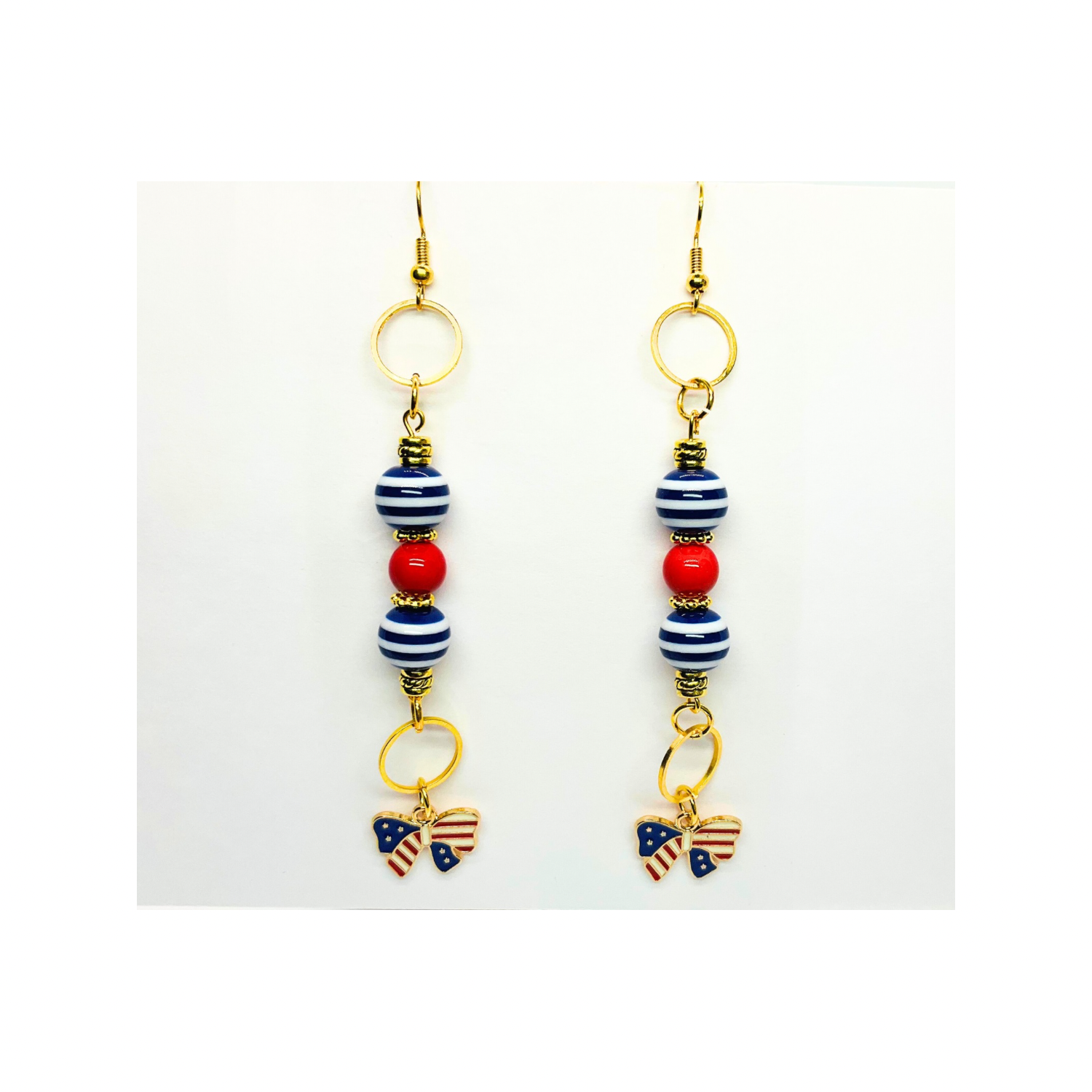 These earrings feature red, white, and blue striped beads with gold accents. Perfect for showing your patriotic spirit, they dangle elegantly. The bow charm adds a touch of charm and uniqueness. Ideal for special occasions or everyday wear.