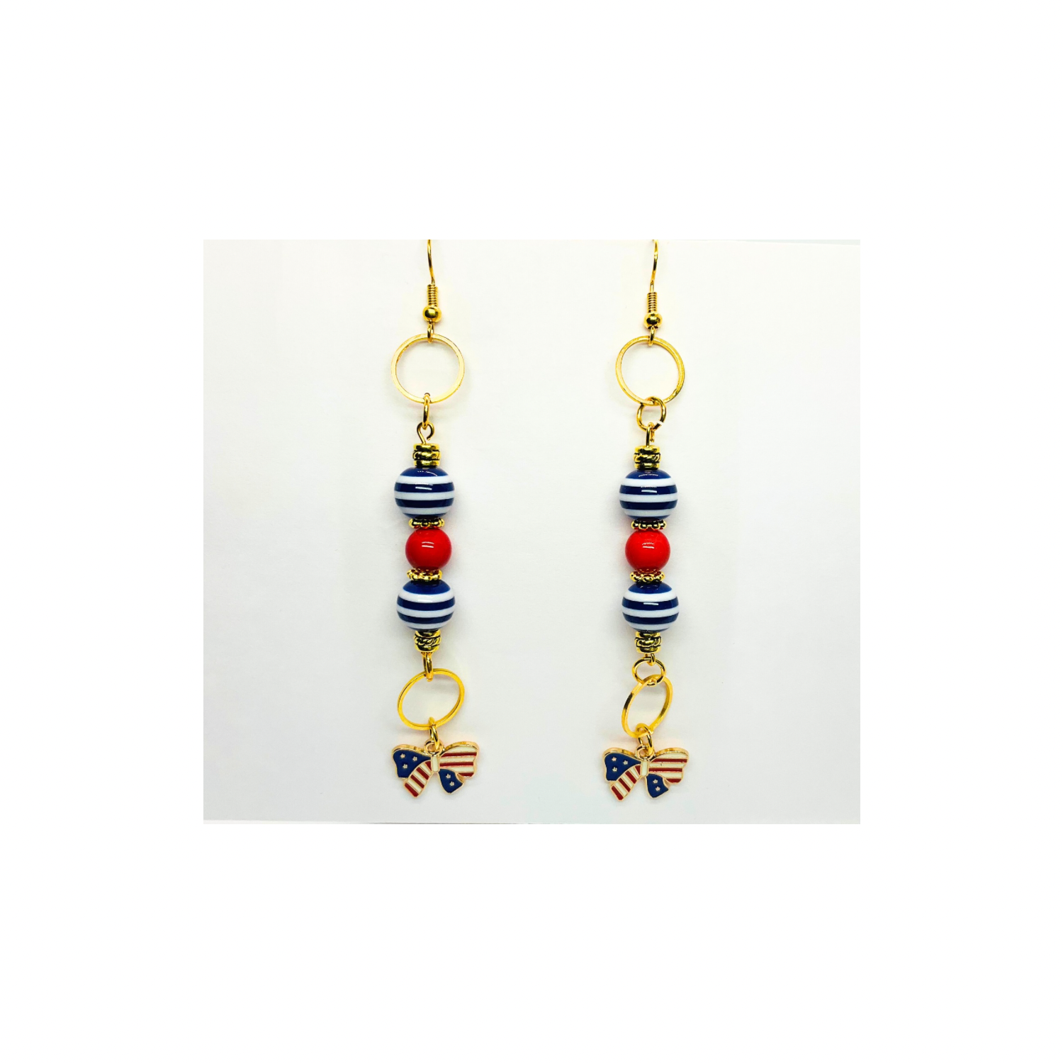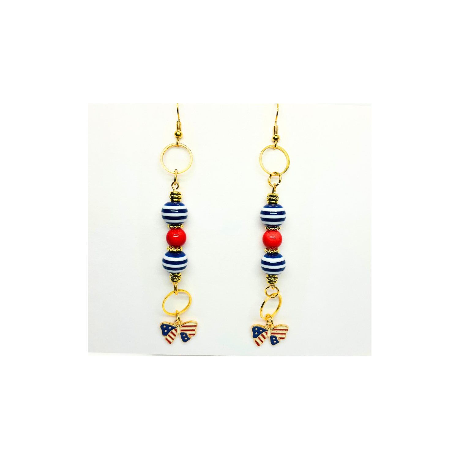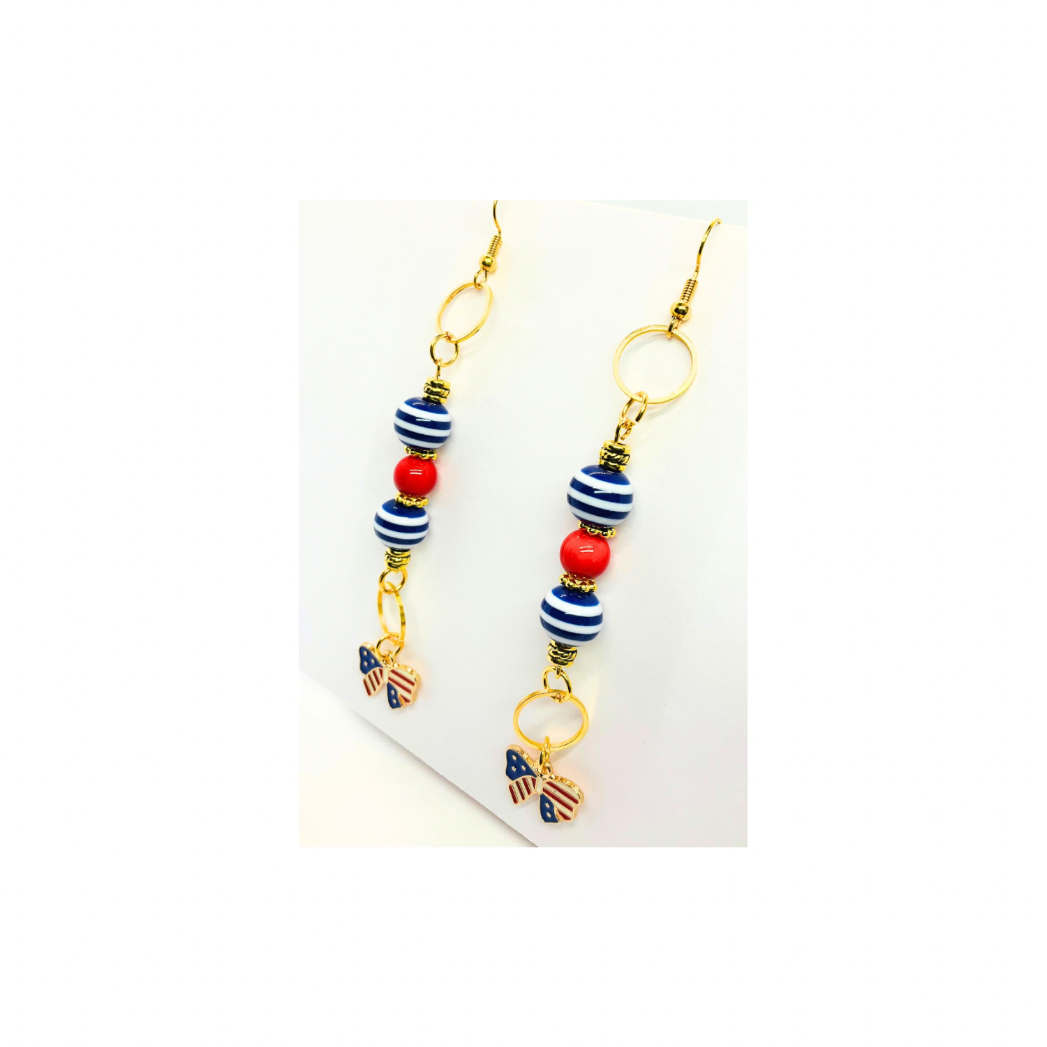 These earrings feature red, white, and blue striped beads with gold accents. Perfect for showing your patriotic spirit, they dangle elegantly. The bow charm adds a touch of charm and uniqueness. Ideal for special occasions or everyday wear.