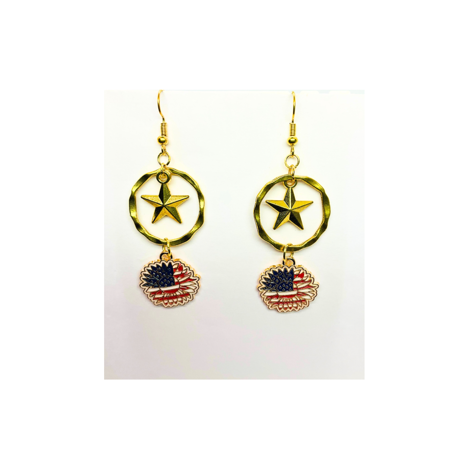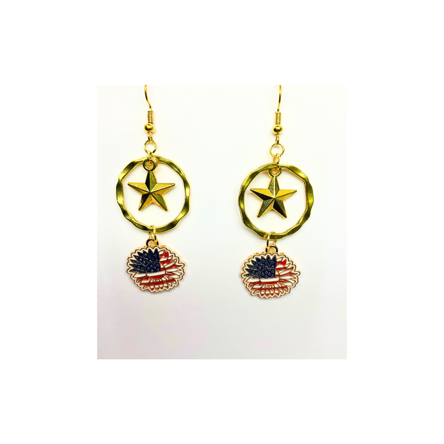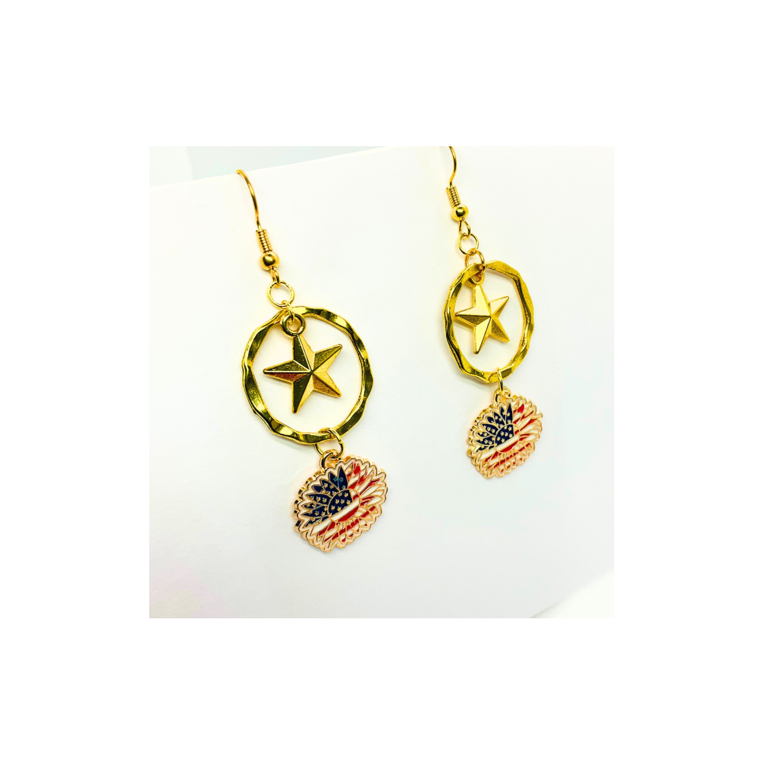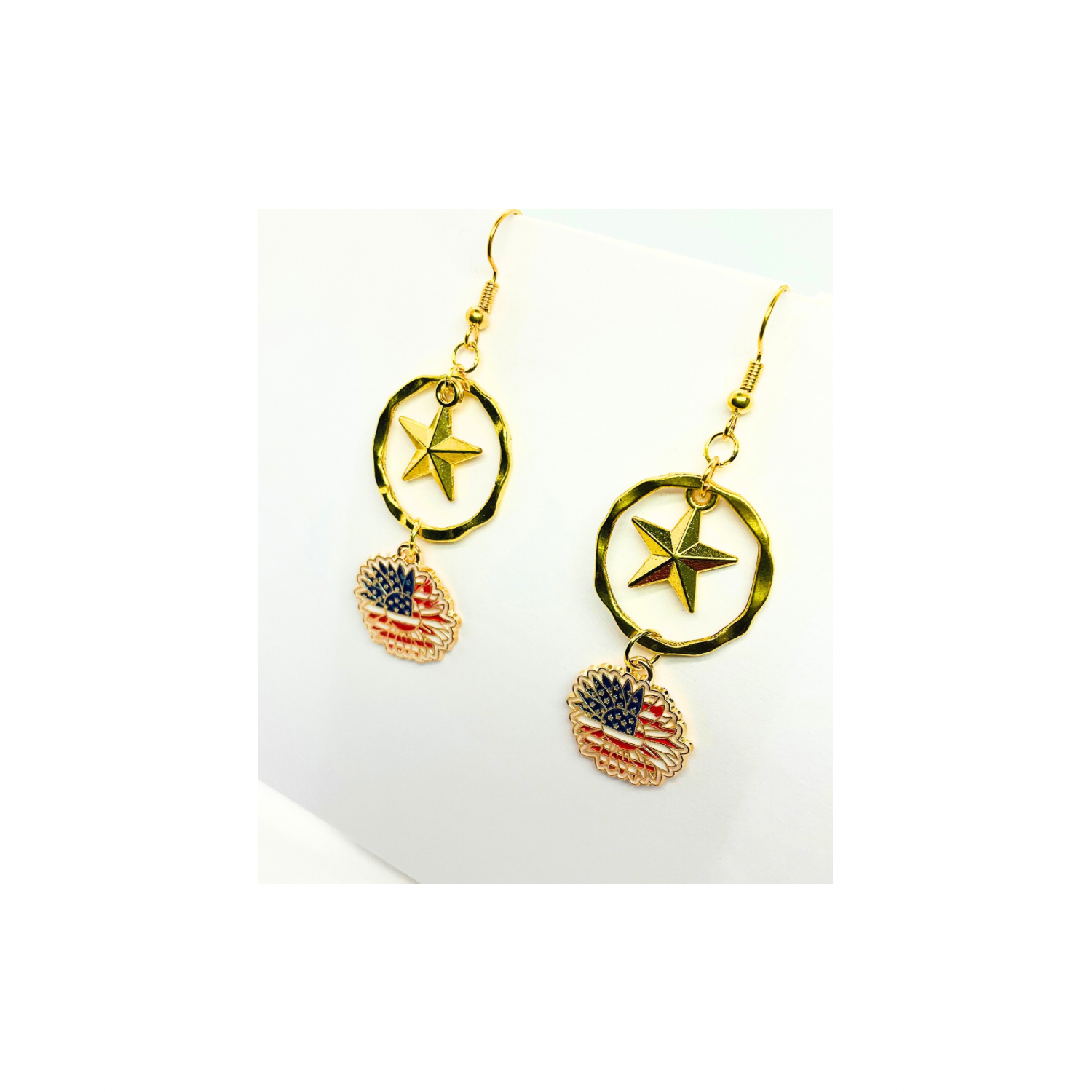 These earrings feature a charming sunflower charm with a gold star dangle. Perfect for showing your American spirit, they showcase an American flag design. Ideal for those who love a touch of patriotism in their accessories.